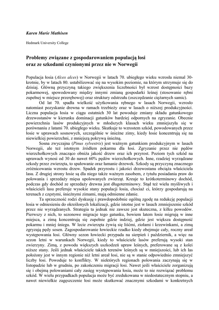Karen Marie Mathisen Hedmark University College Problemy związane z gospodarowaniem populacją łosi oraz ze szkodami czynionymi przez nie w Norwegii Populacja łosia (Alces alces) w Norwegii w latach 70. ubiegłego wieku wzrosła niemal 30krotnie, by w latach 80. ustabilizować się na wysokim poziomie, na którym utrzymuje się do dzisiaj. Główną przyczyną takiego zwiększenia liczebności był wzrost dostępności bazy pokarmowej, spowodowany między innymi zmianą gospodarki leśnej (stosowanie rębni zupełnej w miejsce przerębowej) oraz struktury odstrzału (oszczędzanie ciężarnych samic). Od lat 70. spadła wielkość użytkowania rębnego w lasach Norwegii, wzrosło natomiast pozyskanie drewna w ramach trzebieży oraz w lasach o niższej produkcyjności. Liczna populacja łosia w ciągu ostatnich 30 lat powoduje zmiany składu gatunkowego drzewostanów w kierunku dominacji gatunków bardziej odpornych na zgryzanie. Obecnie powierzchnia lasów produkcyjnych w młodszych klasach wieku zmniejszyła się w porównaniu z latami 70. ubiegłego wieku. Skutkuje to wzrostem szkód, powodowanych przez łosie w uprawach sosnowych, szczególnie w śnieżne zimy, kiedy łosie koncentrują się na niewielkiej powierzchni, z mniejszą pokrywą śnieżną. Sosna zwyczajna (Pinus sylvestris) jest ważnym gatunkiem produkcyjnym w lasach Norwegii, ale też istotnym źródłem pokarmu dla łosi. Zgryzanie przez nie pędów wierzchołkowych znacząco obniża jakość drzew oraz ich przyrost. Poziom tych szkód na uprawach wynosi od 30 do nawet 60% pędów wierzchołkowych. Inne, rzadziej wyrządzane szkody przez zwierzęta, to spałowanie oraz łamanie drzewek. Szkody są przyczyną znacznego zróżnicowania wzrostu drzew. Spadek przyrostu i jakości drzewostanu obciąża właściciela lasu. Z drugiej strony łosie są dla niego także ważnym zasobem, z tytułu posiadania praw do polowania i sprzedaży mięsa upolowanych zwierząt. Kreuje to krótkoterminowy dochód, podczas gdy dochód ze sprzedaży drewna jest długoterminowy. Stąd też wielu myśliwych i właścicieli lasu preferuje wysokie stany populacji łosia, chociaż ci, którzy gospodarują na terenach z częstymi, śnieżnymi zimami, mają odmienne zdanie. Ta sprzeczność rodzi dyskusję i prawdopodobnie ogólną zgodę na redukcję populacji łosia w odniesieniu do określonych lokalizacji, gdzie istotne jest w lasach zmniejszenie szkód przez nie wyrządzanych. Strategia ta jednak nie zawsze jest skuteczna, z kilku powodów. Pierwszy z nich, to sezonowe migracje tego gatunku, bowiem latem łosie migrują w inne miejsca, a zimą koncentrują się zupełnie gdzie indziej, gdzie jest większa dostępność pokarmu i mniej śniegu. W lecie zwierzęta żywią się liśćmi, ziołami i krzewinkami, a zimą zgryzają pędy sosen. Zagospodarowanie łowieckie rzadko kiedy obejmuje cały, roczny areał występowania łosi. Główny sezon łowiecki przypada na sierpień i październik, a więc na sezon letni w warunkach Norwegii, kiedy to właściciele lasów preferują wysoki stan zwierzyny. Zimą, z powodu większych uszkodzeń upraw leśnych, preferowane są z kolei niższe stany. Jeśli jednak właściciele takich terenów leśnych są w mniejszości, lub ich las położony jest w innym regionie niż letni areał łosi, nie są w stanie odpowiednio zmniejszyć liczby łosi. Powoduje to konflikty. W niektórych regionach polowania zaczynają się w listopadzie lub w grudniu, po zakończeniu migracji łosi. Nawet jeśli właściciele zorganizują się i obejmą polowaniami cały zasięg występowania łosia, może to nie rozwiązać problemu szkód. W wielu przypadkach populacja może być zredukowana w niedostatecznym stopniu, a nawet niewielkie zagęszczenie łosi może skutkować znacznymi szkodami w konkretnych regionach. Aby zmniejszyć szkody, coraz częściej stosowane jest zimowe dokarmianie łosi kiszonką. Drugim z celów jest odciągnięcie łosi od tras komunikacyjnych, aby zmniejszyć liczbę kolizji. Jednak wyniki badań w Stor-Elvdal, norweskiej gminie, w której dokarmianie prowadzone jest najdłużej – od 1989 roku, wskazują, że poziom zgryzania z czasem wzrasta, pomimo dokarmiania na poziomie 50% zapotrzebowania populacji łosia na pożywienie. Prawdopodobnie ma to związek z mniejszą dostępnością naturalnego listowia, zastępowanego w znacznym stopniu kiszonką. Łosie w czasie zimy nie jedzą traw, a pędy drzew są ich naturalnym pokarmem o tej porze roku i nawet karmione kiszonką nie zaprzestają zgryzania, które dostarcza im od 50 do 70% pożywienia również w warunkach dokarmiania. Prowadzi to do ekstremalnie wysokiego poziomu zgryzania w promieniu do 1 km od miejsc dokarmiania. Wydaje się wręcz, że kiszonka jest pożywieniem łosi dopiero wówczas, kiedy brakuje naturalnej bazy pokarmowej. Być może sytuacja zmieniłaby się, jeśli kiszonka wzbogacana byłaby w składniki pokarmowe lub uzupełniana bardziej naturalnym pokarmem. Nie jest to zbyt powszechne, ze względu na koszty, podobnie jak grodzenie upraw, które jest zbyt drogie w przypadku niewielkich powierzchniowo drzewostanów o niskiej produkcyjności. Łosie mogą ponadto niszczyć ogrodzenia – wymagają one zatem stałej opieki. Grodzenia powodują także ograniczenie bazy pokarmowej i koncentrację szkód w innych, sąsiadujących drzewostanach. Jednym z możliwych rozwiązań tej nierównowagi pomiędzy liczebnością łosi a zasobnością bazy pokarmowej jest generowanie większej ilości pożywienia dla łosi na poziomie krajobrazu leśnego. Może to zapewnić dochód zarówno z gospodarki leśnej, jaki i łowieckiej w większej skali. W tym przypadku konieczna jest współpraca pomiędzy właścicielami lasu gospodarującymi na obszarach położonych w rocznych zasięgach występowania łosia. Duże ilości pokarmu dla łosia mogą przynieść niewielkie zmiany w zagospodarowaniu lasu, polegające na: 1) kształtowaniu gęstych