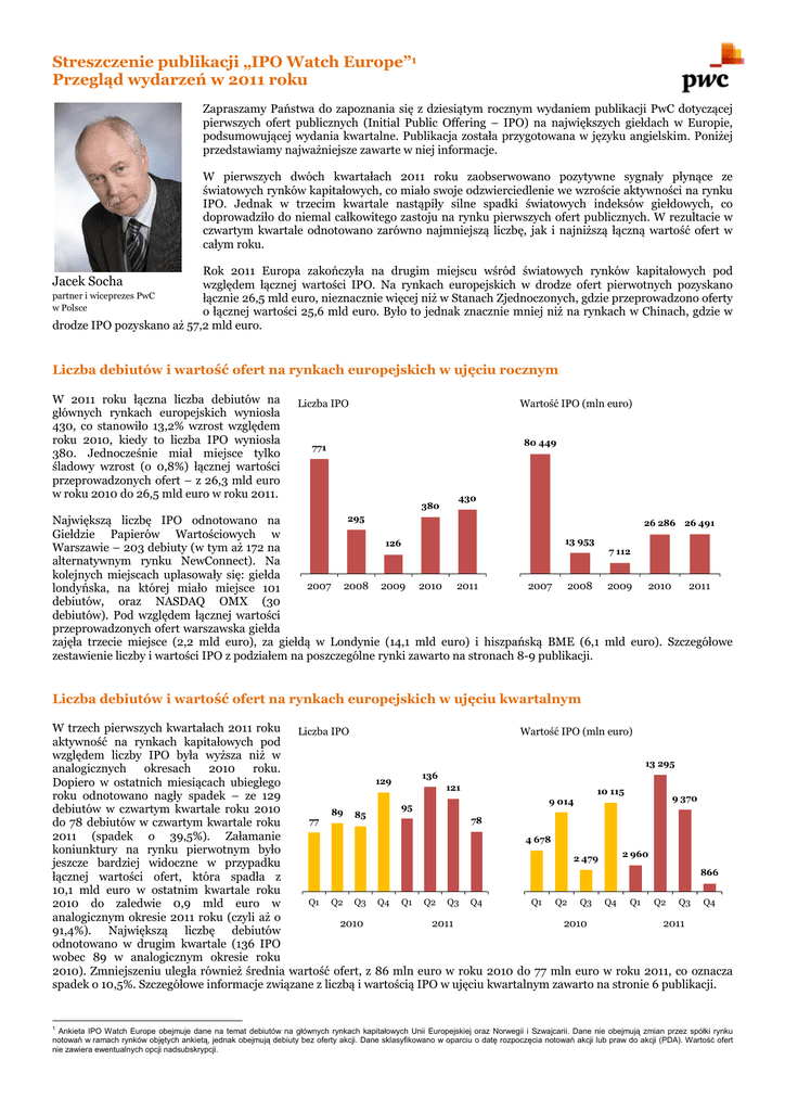Streszczenie publikacji „IPO Watch Europe”1 Przegląd wydarzeń w 2011 roku Zapraszamy Państwa do zapoznania się z dziesiątym rocznym wydaniem publikacji PwC dotyczącej pierwszych ofert publicznych (Initial Public Offering – IPO) na największych giełdach w Europie, podsumowującej wydania kwartalne. Publikacja została przygotowana w języku angielskim. Poniżej przedstawiamy najważniejsze zawarte w niej informacje. W pierwszych dwóch kwartałach 2011 roku zaobserwowano pozytywne sygnały płynące ze światowych rynków kapitałowych, co miało swoje odzwierciedlenie we wzroście aktywności na rynku IPO. Jednak w trzecim kwartale nastąpiły silne spadki światowych indeksów giełdowych, co doprowadziło do niemal całkowitego zastoju na rynku pierwszych ofert publicznych. W rezultacie w czwartym kwartale odnotowano zarówno najmniejszą liczbę, jak i najniższą łączną wartość ofert w całym roku. Rok 2011 Europa zakończyła na drugim miejscu wśród światowych rynków kapitałowych pod względem łącznej wartości IPO. Na rynkach europejskich w drodze ofert pierwotnych pozyskano partner i wiceprezes PwC łącznie 26,5 mld euro, nieznacznie więcej niż w Stanach Zjednoczonych, gdzie przeprowadzono oferty w Polsce o łącznej wartości 25,6 mld euro. Było to jednak znacznie mniej niż na rynkach w Chinach, gdzie w drodze IPO pozyskano aż 57,2 mld euro. Jacek Socha Liczba debiutów i wartość ofert na rynkach europejskich w ujęciu rocznym W 2011 roku łączna liczba debiutów na głównych rynkach europejskich wyniosła 430, co stanowiło 13,2% wzrost względem roku 2010, kiedy to liczba IPO wyniosła 380. Jednocześnie miał miejsce tylko śladowy wzrost (o 0,8%) łącznej wartości przeprowadzonych ofert – z 26,3 mld euro w roku 2010 do 26,5 mld euro w roku 2011. Liczba IPO Wartość IPO (mln euro) 80 449 771 380 430 295 Największą liczbę IPO odnotowano na 26 286 26 491 Giełdzie Papierów Wartościowych w 13 953 126 Warszawie – 203 debiuty (w tym aż 172 na 7 112 alternatywnym rynku NewConnect). Na kolejnych miejscach uplasowały się: giełda 2007 2008 2009 2010 2011 2007 2008 2009 2010 2011 londyńska, na której miało miejsce 101 debiutów, oraz NASDAQ OMX (30 debiutów). Pod względem łącznej wartości przeprowadzonych ofert warszawska giełda zajęła trzecie miejsce (2,2 mld euro), za giełdą w Londynie (14,1 mld euro) i hiszpańską BME (6,1 mld euro). Szczegółowe zestawienie liczby i wartości IPO z podziałem na poszczególne rynki zawarto na stronach 8-9 publikacji. Liczba debiutów i wartość ofert na rynkach europejskich w ujęciu kwartalnym W trzech pierwszych kwartałach 2011 roku Liczba IPO Wartość IPO (mln euro) aktywność na rynkach kapitałowych pod względem liczby IPO była wyższa niż w 13 295 analogicznych okresach 2010 roku. 136 129 Dopiero w ostatnich miesiącach ubiegłego 121 10 115 roku odnotowano nagły spadek – ze 129 9 370 9 014 95 debiutów w czwartym kwartale roku 2010 89 85 78 77 do 78 debiutów w czwartym kwartale roku 2011 (spadek o 39,5%). Załamanie 4 678 koniunktury na rynku pierwotnym było 2 960 2 479 jeszcze bardziej widoczne w przypadku 866 łącznej wartości ofert, która spadła z 10,1 mld euro w ostatnim kwartale roku Q1 Q2 Q3 Q4 Q1 Q2 Q3 Q4 Q1 Q2 Q3 Q4 Q1 Q2 Q3 Q4 2010 do zaledwie 0,9 mld euro w analogicznym okresie 2011 roku (czyli aż o 2010 2011 2010 2011 91,4%). Największą liczbę debiutów odnotowano w drugim kwartale (136 IPO wobec 89 w analogicznym okresie roku 2010). Zmniejszeniu uległa również średnia wartość ofert, z 86 mln euro w roku 2010 do 77 mln euro w roku 2011, co oznacza spadek o 10,5%. Szczegółowe informacje związane z liczbą i wartością IPO w ujęciu kwartalnym zawarto na stronie 6 publikacji. 1 Ankieta IPO Watch Europe obejmuje dane na temat debiutów na głównych rynkach kapitałowych Unii Europejskiej oraz Norwegii i Szwajcarii. Dane nie obejmują zmian przez spółki rynku notowań w ramach rynków objętych ankietą, jednak obejmują debiuty bez oferty akcji. Dane sklasyfikowano w oparciu o datę rozpoczęcia notowań akcji lub praw do akcji (PDA). Wartość ofert nie zawiera ewentualnych opcji nadsubskrypcji. Największe oferty na rynkach europejskich W 2011 roku na rynkach europejskich odnotowano sześć ofert o wartości przekraczającej 1 mld euro (w roku 2010 było siedem takich ofert). Łączna wartość 10 największych ofert w minionym roku wyniosła 18,0 mld euro względem 12,8 mld euro w roku poprzednim. Wzrósł również udział największej dziesiątki w łącznej wartości ofert – z 49% w 2010 roku do 68% w roku 2011, osiągając zbliżony poziom do tego osiągniętego w 2009 roku (72%). Największymi IPO były: Glencore (6,9 mld euro – debiut w Londynie), Bankia (3,1 mld euro – debiut na BME), Dia (2,4 mld euro – debiut na BME) oraz Jastrzębska Spółka Węglowa (1,3 mld euro – debiut na GPW). Szczegóły dotyczące największych ofert zostały przedstawione na stronie 7 publikacji. Wartość obrotów na giełdach europejskich Całkowita wartość obrotu akcjami na najważniejszych giełdach europejskich w 2011 roku wzrosła do poziomu 8.755 mld euro w porównaniu do 6.654 mld euro w roku 2010, osiągając tym samym zbliżony poziom do tego z roku 2009 (8.756 mld euro). Największą aktywnością w 2011 roku odznaczały się: giełda londyńska z udziałem w łącznych obrotach na poziomie 31% (wobec 29% w 2010 roku), NYSE Euronext (udział 20% wobec 21% w 2010 roku) oraz Deutsche Börse (udział 16%, taki sam jak w 2010 roku). Znacznym spadkiem obrotów charakteryzowały się: giełda w Atenach (spadek o 51% względem roku 2010), giełda w Luksemburgu (spadek o 44%) oraz giełda w Wiedniu (spadek o 13%). Bardziej szczegółowe informacje związane z wartością obrotów na poszczególnych rynkach zawarto na stronie 15 publikacji. IPO w Europie w poszczególnych branżach Sektorami, które odznaczały się największą aktyw