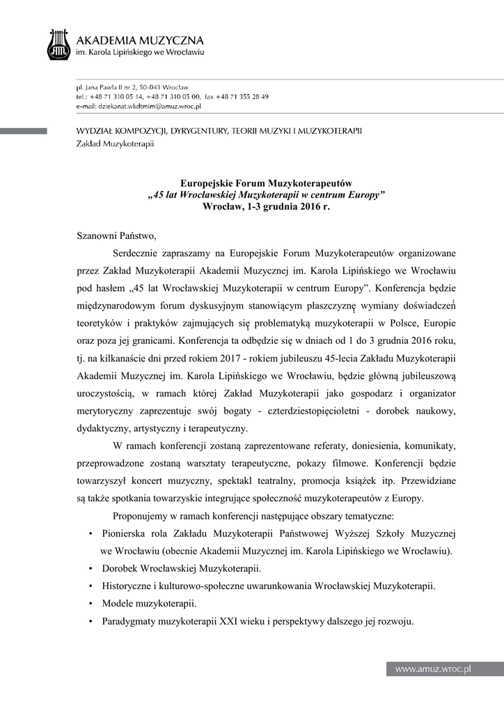 Europejskie Forum Muzykoterapeutów „45 lat Wrocławskiej Muzykoterapii w centrum Europy” Wrocław, 1-3 grudnia 2016 r. Szanowni Państwo, Serdecznie zapraszamy na Europejskie Forum Muzykoterapeutów organizowane przez Zakład Muzykoterapii Akademii Muzycznej im. Karola Lipińskiego we Wrocławiu pod hasłem „45 lat Wrocławskiej Muzykoterapii w centrum Europy”. Konferencja będzie międzynarodowym forum dyskusyjnym stanowiącym płaszczyznę wymiany do wiadczeń teoretyków i praktyków zajmujących się prob ematyką muzykoterapii w Polsce, Europie oraz poza jej granicami. Konferencja ta odbędzie się w dniach od 1 do 3 grudnia 2016 roku, tj. na ki kana cie dni przed rokiem 2017 - rokiem jubileuszu 45-lecia Zakładu Muzykoterapii Akademii Muzycznej im. Karola Lipińskiego we Wrocławiu, będzie główną jubi euszową uroczysto cią, w ramach której Zakład Muzykoterapii jako gospodarz i organizator merytoryczny zaprezentuje swój bogaty - czterdziestopięcio etni - dorobek naukowy, dydaktyczny, artystyczny i terapeutyczny. W ramach konferencji zostaną zaprezentowane referaty, doniesienia, komunikaty, przeprowadzone zostaną warsztaty terapeutyczne, pokazy filmowe. Konferencji będzie towarzyszył koncert muzyczny, spektakl teatralny, promocja książek itp. Przewidziane są także spotkania towarzyskie integrujące społeczno ć muzykoterapeutów z Europy. Proponujemy w ramach konferencji następujące obszary tematyczne: • Pionierska rola Zakładu Muzykoterapii Państwowej Wyższej Szkoły Muzycznej we Wrocławiu (obecnie Akademii Muzycznej im. Karola Lipińskiego we Wrocławiu). • Dorobek Wrocławskiej Muzykoterapii. • Historyczne i kulturowo-społeczne uwarunkowania Wrocławskiej Muzykoterapii. • Modele muzykoterapii. • Paradygmaty muzykoterapii XXI wieku i perspektywy dalszego jej rozwoju. • Interdyscyplinarne ujęcie muzykoterapii. • Wyzwania etyczne zawodu muzykoterapeuty. • Duchowo ć a muzykoterapia. • Badania naukowe z zakresu muzykoterapii. • Kompetencje muzykoterapeutyczne, ich kształcenie i doskonalenie. Obszarów muzykoterapii wartych poruszenia w ramach konferencji jest oczywi cie więcej. Zaproponowana lista nie wyczerpuje ich pełnego zakresu. Jeste my otwarci na jej poszerzenie podczas wspó nej muzykoterapeutycznej debaty. Go ćmi specjalnymi Europejskiego Forum Muzykoterapeutów będą między innymi: • dr Andrzej Janicki (Polska), • dr Stefano Navone (Włochy), • doc. Jaap Orth (Holandia), • prof. Michael J. Silverman (USA), • dr Melanie Voigt (Niemcy). Jako języki konferencyjne przyjęto język polski i angielski. Patronat Honorowy nad przedsięwzięciem objął Rektor Akademii Muzycznej im. Karola Lipińskiego we Wrocławiu prof. dr hab. Krystian Kiełb. Uprzejmie prosimy zainteresowane osoby o przesyłanie zgłoszeń on-line dostępnych na stronie internetowej: www.amuz.wroc.pl do dnia 30 sierpnia 2016 r. (uczestnicy czynni), do 15 listopada 2016 r. (uczestnicy bierni). Koszt czynnego udziału w konferencji wynosi 400 zł (100 euro), a biernego - 200 zł (50 euro). Regulamin Forum oraz aktualne informacje dotyczące konferencji dostępne są na stronie internetowej www.amuz.wroc.pl. Wszelkie pytania prosimy kierować na adres poczty elektronicznej: [email protected]. Z wyrazami szacunku i serdecznymi pozdrowieniami dr Paweł Cylulko Przewodniczący Komitetu Organizacyjnego