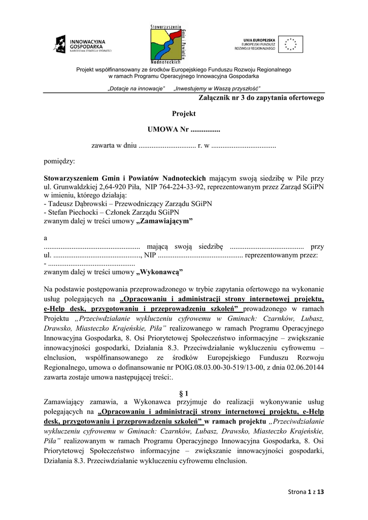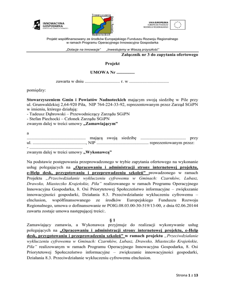 Projekt współfinansowany ze środków Europejskiego Funduszu Rozwoju Regionalnego w ramach Programu Operacyjnego Innowacyjna Gospodarka „Dotacje na innowacje” „Inwestujemy w Waszą przyszłość” Załącznik nr 3 do zapytania ofertowego Projekt UMOWA Nr ................ zawarta w dniu ............................... r. w ................................... pomiędzy: Stowarzyszeniem Gmin i Powiatów Nadnoteckich mającym swoją siedzibę w Pile przy ul. Grunwaldzkiej 2,64-920 Piła, NIP 764-224-33-92, reprezentowanym przez Zarząd SGiPN w imieniu, którego działają: - Tadeusz Dąbrowski – Przewodniczący Zarządu SGiPN - Stefan Piechocki – Członek Zarządu SGiPN zwanym dalej w treści umowy „Zamawiającym” a .................................................... mającą swoją siedzibę ........................................ przy ul. ..............................................., NIP .............................................. reprezentowanym przez: - ............................................... zwanym dalej w treści umowy „Wykonawcą” Na podstawie postępowania przeprowadzonego w trybie zapytania ofertowego na wykonanie usług polegających na „Opracowaniu i administracji strony internetowej projektu, e-Help desk, przygotowaniu i przeprowadzeniu szkoleń” prowadzonego w ramach Projektu „Przeciwdziałanie wykluczeniu cyfrowemu w Gminach: Czarnków, Lubasz, Drawsko, Miasteczko Krajeńskie, Piła” realizowanego w ramach Programu Operacyjnego Innowacyjna Gospodarka, 8. Osi Priorytetowej Społeczeństwo informacyjne – zwiększanie innowacyjności gospodarki, Działania 8.3. Przeciwdziałanie wykluczeniu cyfrowemu – elnclusion, współfinansowanego ze środków Europejskiego Funduszu Rozwoju Regionalnego, umowa o dofinansowanie nr POIG.08.03.00-30-519/13-00, z dnia 02.06.20144 zawarta zostaje umowa następującej treści:. §1 Zamawiający zamawia, a Wykonawca przyjmuje do realizacji wykonywanie usług polegających na „Opracowaniu i administracji strony internetowej projektu, e-Help desk, przygotowaniu i przeprowadzeniu szkoleń” w ramach projektu „Przeciwdziałanie wykluczeniu cyfrowemu w Gminach: Czarnków, Lubasz, Drawsko, Miasteczko Krajeńskie, Piła” realizowanym w ramach Programu Operacyjnego Innowacyjna Gospodarka, 8. Osi Priorytetowej Społeczeństwo informacyjne – zwiększanie innowacyjności gospodarki, Działania 8.3. Przeciwdziałanie wykluczeniu cyfrowemu elnclusion. Strona 1 z 13 Projekt współfinansowany ze środków Europejskiego Funduszu Rozwoju Regionalnego w ramach Programu Operacyjnego Innowacyjna Gospodarka „Dotacje na innowacje” 1. 2. „Inwestujemy w Waszą przyszłość” §2 Przedmiot umowy zostanie wykonany przez Wykonawcę: a) Wykonanie projektu strony www projektu i przekazanie do zatwierdzenia Zamawiającego – do 03.12.2014 r. b) Uruchomienie strony internetowej – do dnia 08.12.2014 r. c) Świadczenie usługi w zakresie e-help desku do dnia 30.09.2015 r. d) Wykonanie usługi w zakresie przygotowania i przeprowadzenia szkoleń 31.01.2014r. Zakres obowiązków Wykonawcy: A) Opracowanie, administracja i hosting strony internetowej projektu: 1) 2) 3) 4) 5) 6) 7) 8) 9) 10) 11) 12) 13) Utworzenie strony WWW projektu. Administracja, hosting i aktualizacja strony www w ramach realizacji projektu. Zainstalowanie strony na serwerze wykupionym przez Wykonawcę. Strona projektu ma posiadać link do strony głównej Zamawiającego. Projekt strony internetowej musi zostać przygotowany i przesłany do Zamawiającego do zaakceptowania do dnia 03.12.2014r. Strona internetowa musi być oznakowana zgodnie z „Przewodnikiem w zakresie promocji projektów finansowanych w ramach Programu Operacyjnego Innowacyjna Gospodarka 2007-2013 dla beneficjentów i instytucji zaangażowanych we wdrażanie Programu”. Strona internetowa projektu powinna zostać uruchomiona do dnia 05.12.2014 r. Wykonawca zobowiązany jest do przekazania Zamawiającemu autorskich praw majątkowych do strony oraz autorskich praw zależnych do modyfikacji strony. Wykonawca zobowiązany jest do aktualizacji serwisu internetowego na podstawie przesłanych przez osobę wyznaczoną ze strony Zamawiającego do kontaktów z Wykonawcą. Przedmiot zamówienia musi obejmować gwarancję techniczną na okres: od dnia uruchomienia strony internetowej do 30 września 2015 r. Strona www musi funkcjonować przez okres trwania projektu, czyli od dnia uruchomienia strony internetowej do 30 września 2015 r i po jego zakończeniu przez okres 5 lat- (okres trwałości projektu). Technologia: technologia wykonania strony powinna pozwalać na rozbudowę strony oraz na podłączenie do niej dodatkowych aplikacji w przyszłości. Zarówno stron jak i CMS powinny być w pełni obsługiwane przez najpopularniejsze przeglądarki. Strona powinna być oparta o system zarządzania treścią CMS o podstawowych parametrach : intuicyjna obsługa przez Użytkowników CMS, Pełne zarządzanie menu, tzn. dodawanie/usuwanie zakładek i podzakładek; tworzenie linków między zakładkami i podzakładkami; budowanie hierarchii menu; nawigacja między głównymi działami CMS oparta na ikonach graficznych, Zarządzanie widocznością zakładek i publikacji Strona 2 z 13 Projekt współfinansowany ze środków Europejskiego Funduszu Rozwoju Regionalnego w ramach Programu Operacyjnego Innowacyjna Gospodarka „Dotacje na innowacje” 14) 15) 16) 17) 18) 19) 20) 21) 22) 23) 24) „Inwestujemy w Waszą przyszłość” Możliwość wyboru szablonu zakładek: agregująca, galeria, tekst; Łatwa, pełna edycja tekstu w technologii WYSIWYG Dodawanie plików graficznych. Tworzenie galerii zdjęć; zarządzanie rozmiarami zdjęć; wymagane moduły CMS : strony typu statycznego, aktualności , galeria, administracja Użytkownikami systemu CMS, kopia bezpieczeństwa bazy danych, system CMS ma posiadać możliwość dodawania plików do treści strony (*.pdf, *.doc, *.xls,*.jpg, itd.), system CMS