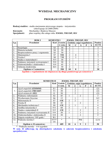 WYDZIAŁ MECHANICZNY PROGRAM STUDIÓW Rodzaj studiów: studia stacjonarne pierwszego stopnia – inżynierskie (obowiązuje od 2008/2009) Kierunek: Mechanika i Budowa Maszyn Specjalność: plan wspólny dla całego roku /ESOiO, TRUOiP, IEI/ Lp. 1. 2. 3. 4. 5. 6. 7. 8. 9. ROK I Przedmiot SEMESTR I /ESOiO, TRUOiP, IEI/ Kod Godzin Godziny zajęć tygodniowo Punkty w sem. W C L P S ECTS Socjologia S3 30 2 2 Historia techniki S4 30 2 1 Bezpieczeństwo pracy i ergonomia S5 30 2 2 Matematyka I S7 90E 2 4 8 Fizyka I S8 75E 2 3 7 S15 Nauka o materiałach I 30 2 2 S16 Podstawy inżynierii wytwarzania I 30 2 2 S18 Elektrotechnika i elektronika I 45 2 1 4 Ochrona środowiska S21 30 2 2 Ogółem w I semestrze: 390 18 8 30 Zgodnie z regulaminem nie dopuszcza się długu punktowego po semestrze I SEMESTR II /ESOiO, TRUOiP, IEI/ Kod Godzin Godziny zajęć tygodniowo w sem. W C L P S E1 30 2 Język angielski (ESOiOO) 1. Język angielski (TRUOiP) T1 30 2 I1 30 2 Język niemiecki (IEI) 2. Podstawy informatyki S2 45 1 2 3. Wychowanie fizyczne S6 15 1 4. Matematyka II S7 60E 2 2 5. Fizyka II S8 45 1 2 6. Mechanika techniczna I S9 45E 2 1 S12 7. Grafika inżynierska I 60 2 2 S15 8. Nauka o materiałach II 45E 1 2 S16 9. Podstawy inżynierii wytwarzania II 30 1 1 S18 10. Elektrotechnika i elektronika II 30 2 11. Zajęcia wojskowe /105 godz./ W1 x ET37 12. Praktyka morska I * PM Lp. Przedmiot I36 Punkty ECTS (2) (2) (2) 3 0,5 4 3 4 4 3 2 2 (2,5) Ogółem w II semestrze: 405 10 6 9 2 30 * - Praktyka morska – 4-6 tygodnie W sem. II odbywają się obowiązkowe szkolenia w zakresie bezpieczeństwa i szkolenia specjalistyczne. Lp. 1. 2. 3. 4. 5. 6. 7. 8. 9. 10. 11. 12. 13. 14. Lp. 1. 2. 3. 4. 5. 6. 7. 8. 9. 10. 11. 12. 13. ROK II Przedmiot SEMESTR III /ESOiO, TRUOiP, IEI/ Kod Godzin Godziny zajęć tygodniowo w sem. W C L P S E1 (30) (2) Język angielski (ESOiOO) T1 (30) (2) Język angielski (TRUOiP) I1 (30) (2) Język niemiecki (IEI) Wychowanie fizyczne S6 15 1 Matematyka III S7 60 2 2 Fizyka III S8 15 1 Mechanika techniczna II S9 60E 2 2 Wytrzymałość materiałów I S10 45 2 1 S12 Grafika inżynierska II 30 2 S13 Podstawy konstrukcji maszyn I 30 2 S15 Nauka o materiałach II 15 1 Podstawy inżynierii wytwarzania III S16 60 4 Termodynamika techniczna I S17 60 2 2 S19 Automatyka i robotyka 30E 2 Metrologia i systemy pomiarowe S20 45 1 2 Zajęcia wojskowe /105 godz./ W2 Ogółem w III semestrze: 495 13 10 8 2 Rok II Przedmiot Język angielski Wychowanie fizyczne Wytrzymałość materiałów II Mechanika płynów Grafika inżynierska III Podstawy konstrukcji maszyn II Termodynamika techniczna II Automatyka i robotyka Siłownie okrętowe I Okrętowe silniki tłokowe I Maszyny i urządzenia okrętowe I Chemia wody, paliw i smarów Praktyka morska II 14. Zajęcia wojskowe /105 godz./ E Ogółem w IV semestrze: Punkty ECTS (2,5) (2,5) (2,5) 0,5 3 1 4 3 3 2 1 2 4 2 2 30 SEMESTR IV /ESOiO, TRUOiP/ Kod Godzin Godziny zajęć tygodniowo Punkty w sem. W ECTS C L P S E1 30 2 2,5 S6 30 2 1 S10 60E 1 1 2 4 S11 45 2 1 3 S12 15 1 2 S13 75E 2 2 1 4 S17 30 2 2 S19 30 2 2 E24/T25 30 2 2 E26/T25 30 2 2 E29/T27 15 1 1 E33/T28 30 1 1 2 ET37 4-6 2,5 tyg. W3 420 11 6 9 2 30 WYDZIAŁ MECHANICZNY PROGRAM STUDIÓW Rodzaj studiów: studia stacjonarne pierwszego stopnia – inżynierskie (obowiązuje od 2008/2009) Kierunek: Mechanika i Budowa Maszyn Specjalność: EKSPLOATACJA SIŁOWNI OKRĘTOWYCH I OBIEKTÓW OCEANOTECHNICZNYCH /ESOiO/ Lp. Rok III Przedmiot SEMESTR V Kod Godzin w sem. Język angielski E1 45E Wychowanie fizyczne S6 30 Podst. konstrukcji maszyn III+CAD S13 45 Podstawy eksploatacji maszyn S14 30 ET23 30 Budowa i teoria okrętu ET24 30E Siłownie okrętowe II ET26 45E Okrętowe silniki tłokowe II ET27 30E Kotły okrętowe I E28 60 Turbiny okrętowe ET29 45 Mech. i urządzenia okrętowe II ET30 30 Chłodnictwo i klimatyzacja I Automatyka okrętowa I, E32 30 E35a Podstawy napędu statku** 30 Urządzenia platform wiertniczych** E35b E36a Ekspl. siłowni z silnik. tłokowymi ** 30 E36b Ekspl. siłowni turbinowych** 1. 2. 3. 4. 5. 6. 7. 8. 9. 10. 11. 12. 13a. 13b. 14a. 14b. 14c. Ekspl. siłowni platform wiertniczych** Ogółem w V semestrze: Lp. 1. Rok III Przedmiot Praktyka morska III Ogółem w VI semestrze: /ESOiO/ Godziny zajęć tygodniowo W C L P S 3 2 2 1 2 1 1 1 1 1 2 2 2 1 1 2 1 1 1 1 1 Punkty ECTS 3 1 4 1 2 2 3 2 3 2 2 2 2 1,5 2 1,5 E36c 510 17 8 8 1 SEMESTR VI /ESOiO/ Kod Godzin Godziny zajęć tygodniowo w sem. W C L P S E37 Min. 4 miesiące Min. 4 miesiące 30 Punkty ECTS 30 30 Lp. Rok IV Przedmiot SEMESTR VII Kod Godzin w sem. Język angielski E1 15 Technologia remontów E22 60 E24 8 Siłownie okrętowe III E25 7 Zarządzanie bezp. eksploatacją statku E26 8 Okrętowe silniki tłokowe III E27 7 Kotły okrętowe II ET29 38E Mech. i urządzenia okrętowe III E30 7 Chłodnictwo i klimatyzacja II E31 37 Elektrot. i elektronika okrętowa E32 8 Automatyka okrętowa II E34 30 Symulator siłowni okrętowej E36a Ekspl. siłowni z silnik. tłokowymi ** 15 E36b Ekspl. siłowni turbinowych** 1. 2. 3. 4. 5. 6. 7. 8. 9. 10. 11. 13a. 13b. 13c. Ekspl. siłowni platform wiertniczych** 14. Seminarium dyplomowe 15. Praca dyplomowa Ogółem w VII semestrze: **- Przedmioty do wyboru /ESOiO/ Godziny zajęć tygodniowo W C L P S 1 2 1 1 1 1 1 1 1 1 1 1 2 1 Punkty ECTS 1 3 0,5 0,5 0,5 0,5 2,5 0,5 2,5 0,5 1 1 E36c 30 D 30 E 270 5 1 5 2 D 7 1 15 30 KOD: E1 Przedmiot: JĘZYK ANGIELSKI Specjalność: EKSPLOATACJA SIŁOWNI OKRĘTOWYCH I OBIEKTÓW OCEANOTECHNICZNYCH – PLAN ZAJĘĆ PROGRAMOWYCH Semestr II III IV V VII Punkty ECTS 2 2,5 2,5 3 1 Liczba godzin w tygodniu A C L 2 2 2 3 1 - Liczba godzin w semestrze A C L 30 30 30 45 15 - ZWIĄZKI Z INNYMI PRZEDMIOTAMI Przedmiot bazuje na wiedzy przekazywanej w ramach przedmiotów zawodowych, umożliwia komunikację ZAKRES WIEDZY DO OPANOWANIA Po wysłuchaniu przewidzianych programem zajęć student powinien: ZNAĆ słownictwo zawodowe w zakresie nazw narzędzi, urządzeń, części maszyn, awarii sys