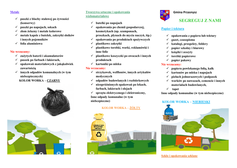 Metale puszki z blachy stalowej po żywności (konserwy) puszki po napojach, sokach złom żelazny i metale kolorowe metale kapsle z butelek, zakrętki słoików i innych pojemników folia aluminiowa Nie wrzucamy: zużytych baterii i akumulatorów puszek po farbach i lakierach, opakowań materiałowych z jakąkolwiek zawartością innych odpadów komunalnych (w tym niebezpiecznych) KOLOR WORKA – CZARNY Tworzywa sztuczne i opakowania wielomateriałowe butelki po napojach opakowania po chemii gospodarczej, kosmetykach (np. szamponach, proszkach, płynach do mycia naczyń, itp.) opakowania po produktach spożywczych plastikowe zakrętki plastikowe torebki, worki, reklamówki i inne folie plastikowe koszyczki po owocach i innych produktach kartoniki po mleku Nie wrzucamy: strzykawek, welflonów, innych artykułów medycznych odpadów budowlanych i rozbiórkowych nieopróżnionych opakowań po lekach, farbach, lakierach i olejach sprzętu elektrycznego i elektroniczny, Inne odpady komunalne (w tym niebezpieczne) Gmina Przasnysz SEGREGUJ Z NAMI Papier i tektura opakowania z papieru lub tektury gazet, czasopisma katalogi, prospekty, foldery papier szkolny i biurowy książki i zeszyty torebki papierowe papier pakowy Nie wrzucamy: papieru powlekanego folią, kalk kartonów po mleku i napojach pieluch jednorazowych i podpasek worków po nawozach, cemencie i innych materiałach budowlanych, tapet Inne odpady komunalne (w tym niebezpieczne) KOLOR WORKA – NIEBIESKI KOLOR WORKA – ŻÓŁTY Szkło i opakowania szklane butelki i słoiki po napojach i żywności, butelki po napojach alkoholowych, szklane opakowania po kosmetykach, Nie wrzucamy: szkło stołowe- żaroodporne, ceramika, doniczki, znicze z zawartością wosku, żarówki i świetlówki, szkło kryształowe, reflektory, nie opróżnione opakowania po lekach, olejach, rozpuszczalnikach, termometry i strzykawki, monitory i lampy telewizyjne, szyby okienne i zbrojne, szyby samochodowe, lustra, witraże fajans i porcelana, Inne odpady komunalne (w tym niebezpieczne) gałęzie drzew i krzewów, liście, kwiaty i skoszona trawa, trociny i kora drzew, owoce warzywa, Nie wrzucamy: kości zwierząt, mięso padlina zwierząt, olej jadalny, drewno impregnowane, płyty wiórowe i MDF, leki, odchody zwierząt, popiół z węgla kamiennego, Inne odpady komunalne (w tym niebezpieczne) KOLOR WORKA – BRĄZOWY KOLOR WORKA – BIAŁY w roku. 5.Odpady budowlane i rozbiórkowe, powstałe w wyniku prowadzenia drobnych robót niewymagających uzyskania pozwolenia na budowę ani dokonania zgłoszenia o zamiarze wykonywania robót w starostwie powiatowym, odbierane będą po indywidualnym zgłoszeniu właściciela nieruchomości. Na terenie gminy zorganizowany zostanie punkt selektywnej zbiórki następujących rodzajów odpadów: mebli i odpadów wielkogabarytowych; zużytych opon; zużytego sprzętu elektronicznego i elektrycznego; chemikaliów (farb, rozpuszczalników itp.) akumulatorów i baterii; przeterminowanych leków; pozbawione resztek żywności. odpadów budowlanych i rozbiórkowych, powstałych Częstotliwość odbioru odpadów: Odpady ulegające biodegradacji „zielone” zaleca 1.Zmieszane odpady komunalne: przydomowych kompostownikach. zużyty sprzęt elektryczny i elektroniczny: jeden raz Wszystkie odpady segregowane muszą być Odpady ulegające biodegradacji „Zielone” się zagospodarowywać we własnym zakresie w 4.Meble i odpady wielkogabarytowe , zużyte opony, jeden raz w miesiącu. 2.Odpady ulegające biodegradacji „zielone”: jeden raz w miesiącu. 3.Segregowane odpady komunalne: raz na dwa miesiące. w wyniku prowadzenia drobnych robót niewymagających uzyskania pozwolenia na budowę ani dokonania zgłoszenia o zamiarze wykonywania robót w starostwie powiatowym. ZBIÓRKA WSKAZANYCH WYŻEJ ODPADÓW ORGANIZOWANA BĘDZIE RAZ W ROKU I TRWAĆ BĘDZIE DWA DNI.