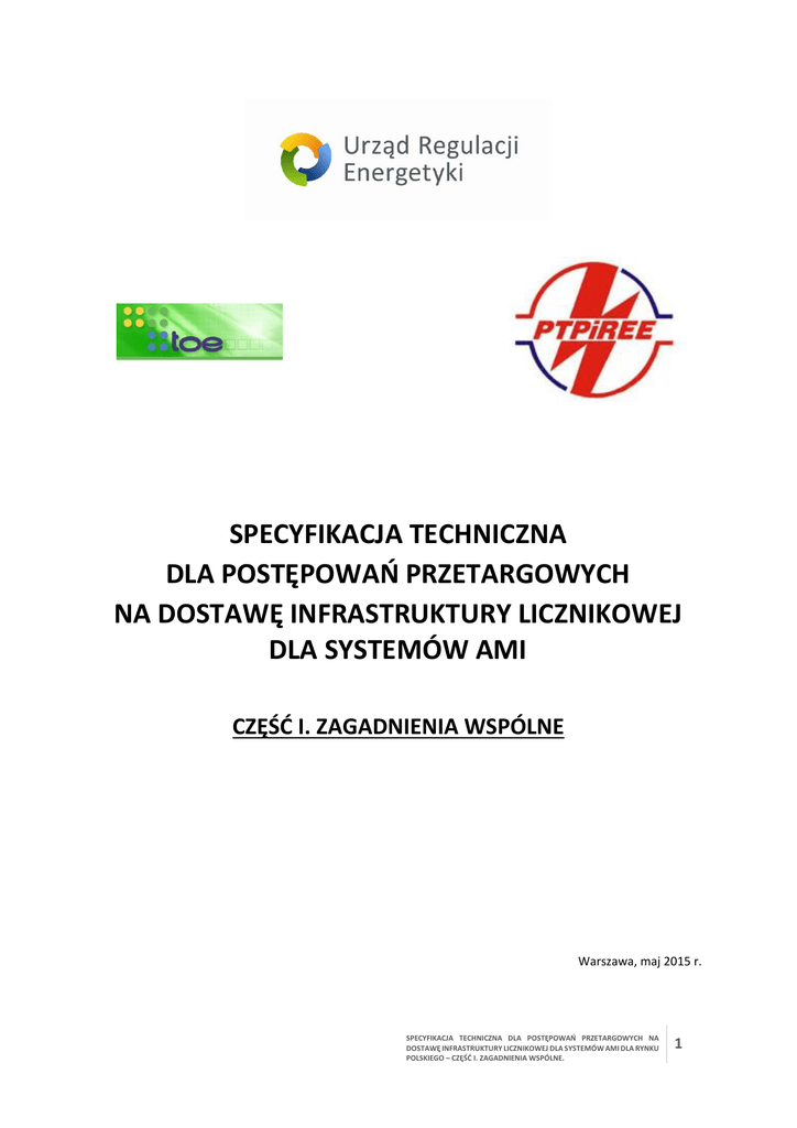 SPECYFIKACJA TECHNICZNA DLA POSTĘPOWAŃ PRZETARGOWYCH NA DOSTAWĘ INFRASTRUKTURY LICZNIKOWEJ DLA SYSTEMÓW AMI CZĘŚĆ I. ZAGADNIENIA WSPÓLNE Warszawa, maj 2015 r. SPECYFIKACJA TECHNICZNA DLA POSTĘPOWAŃ PRZETARGOWYCH NA DOSTAWĘ INFRASTRUKTURY LICZNIKOWEJ DLA SYSTEMÓW AMI DLA RYNKU POLSKIEGO – CZĘŚĆ I. ZAGADNIENIA WSPÓLNE. 1 Spis treści I. Wprowadzenie ........................................................................................................................ 3 II. Zasady wdrożenia i obwiązywania ......................................................................................... 6 1. Tryb zatwierdzenia Specyfikacji. ......................................................................................... 6 2. Czas obowiązywania Specyfikacji. ...................................................................................... 7 3. Tryb aktualizacji zapisów oraz zasady wprowadzania zmian w Specyfikacji. ..................... 7 4. Realizacja wdrożeń na podstawie Specyfikacji i zakres ew. odstępstw ........................... 7 5. Komentarz do ”żółtych pól”................................................................................................ 7 III. Definicje ................................................................................................................................. 9 IV. Wymagania techniczne ....................................................................................................... 12 V. Załączniki .............................................................................................................................. 13 SPECYFIKACJA TECHNICZNA DLA POSTĘPOWAŃ PRZETARGOWYCH NA DOSTAWĘ INFRASTRUKTURY LICZNIKOWEJ DLA SYSTEMÓW AMI DLA RYNKU POLSKIEGO – CZĘŚĆ I. ZAGADNIENIA WSPÓLNE. 2 I. Wprowadzenie Rynek elektroenergetyczny w Polsce stoi przed koniecznością zmian organizacyjnych i technologicznych. Zmiana wynika, między innymi, z obowiązków nałożonych na Polskę jako Państwo Członkowskie przez III pakiet dyrektyw rynkowych, dotyczących m.in. zapewnienia wszystkim odbiorcom energii elektrycznej dostępu do informacji umożliwiających praktyczne i bardziej efektywne zarządzanie własnym zużyciem energii elektrycznej. Faktyczne przyjęcie przez Polskę ww. obowiązku potwierdza stanowisko Rządu zatwierdzone przez Radę Ministrów w dniu 27 sierpnia 2014 r.1 Wprowadzane regulacje prawne mają przyczynić się m.in. do powstania mechanizmów aktywnego zarządzania popytem. Ich celem jest również ułatwienie zainteresowanym odbiorcom podjęcia roli prosumentów, czyli podmiotów nie tylko pobierających energię z sieci ale jednocześnie produkujących ją we własnych mikroinstalacjach. Skuteczna realizacja wymienionych celów jest silnie uzależniona od sposobu wprowadzenia infrastruktury liczników zdalnego odczytu, umożliwiających dwukierunkową komunikację pomiędzy klientami a centrami (docelowo centrum) zarządzania informacją pomiarową. Kluczową kwestią jest zapewnienie, aby określone i niezbędne informacje mogły zostać skutecznie oraz bezpiecznie dostarczone bezpośrednio do samego klienta tak, by mógł on zoptymalizować wykorzystanie energii elektrycznej. Informacje powinny być dla klienta czytelne i zrozumiałe oraz pozwalać na ich ewentualne bezpośrednie (tj. automatyczne) wykorzystanie do optymalnego bieżącego zarządzania zapotrzebowaniem na energię. Ze względu na znaczenie i złożoność infrastruktury liczników zdalnego odczytu, jej opis funkcjonalny stał się przedmiotem pakietu Stanowisk Prezesa Urzędu Regulacji Energetyki (dalej Prezesa URE), publikowanych kolejno, po poddaniu ich projektów publicznej dyskusji. Stanowiska są efektem wspólnej wizji Prezesa URE oraz wyważonych interesów klientów energetyki, Operatorów Systemów Dystrybucyjnych Elektroenergetycznych (OSD E), Sprzedawców energii oraz dostawców technologii. Realizacja tej wizji, co ujawniły pierwsze projekty wdrożeniowe podjęte przez niektórych OSD E, podlega istotnym ryzykom. Zarządzenie nimi wybiega daleko poza opis funkcjonalny modelu rynku pomiarów, do którego Prezes URE dotychczas się ograniczał ze względów doktrynalnych. Infrastruktura zdalnego pomiaru jest implementowana równolegle przez wielu OSD E, wzajemnie niezależnych, a założone funkcjonalności można zrealizować korzystając z przynajmniej kilku rozwiązań technicznych. Ryzyka z tym związane wynikają z: 1. obecności na rynku gotowych produktów, które jedynie fragmentarycznie odpowiadają faktycznym potrzebom specyficznego rynku polskiego; 2. możliwości podziału rynku na lokalne enklawy, zdominowane przez dostawców dysponujących produktami, w tym o których mowa powyżej, ze szkodą dla mechanizmów konkurencji zarówno na rynku dostawców technologii, jak i na rynku samej energii; 3. możliwości uzależnienia OSD E od jednego bądź wąskiej grupy dostawców, które to zagrożenia zostały opisane między innymi w rekomendacjach Prezesa Urzędu Zamówień Publicznych dotyczących zamówień na systemy informatyczne2; 1 http://www.mg.gov.pl/Bezpieczenstwo+gospodarcze/Energetyka/Inteligentne+sieci 2 Podkreślenia wymaga, że infrastruktura pomiarowa AMI wypełnia znamiona systemu informatycznego SPECYFIKACJA TECHNICZNA DLA POSTĘPOWAŃ PRZETARGOWYCH NA DOSTAWĘ INFRASTRUKTURY LICZNIKOWEJ DLA SYSTEMÓW AMI DLA RYNKU POLSKIEGO – CZĘŚĆ I. ZAGADNIENIA WSPÓLNE. 3 4. wzajemnej niekompatybilności rozwiązań wdrażanych na sąsiadujących ze sobą obszarach sieci, z możliwym negatywnym skutkiem dla ich skuteczności na obszarach wzajemnego oddziaływania; 5. wzajemnej niekompatybilności rozwiązań wdrażanych przez różnych OSD E, ze skutkiem potencjalnie negatywnym dla odbiorców energii elektrycznej, w szczególności polegającym na nierównym traktowaniu klientów obsługiwanych przez poszczególnych OSD E; 6. zastosowania przez OSD E rozwiązań technicznych, zabezpi