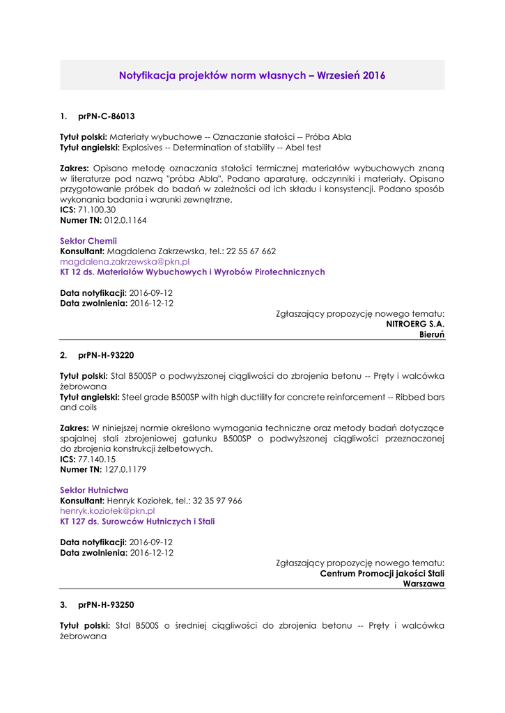 Notyfikacja projektów norm własnych – Wrzesień 2016 1. prPN-C-86013 Tytuł polski: Materiały wybuchowe -- Oznaczanie stałości -- Próba Abla Tytuł angielski: Explosives -- Determination of stability -- Abel test Zakres: Opisano metodę oznaczania stałości termicznej materiałów wybuchowych znaną w literaturze pod nazwą "próba Abla". Podano aparaturę, odczynniki i materiały. Opisano przygotowanie próbek do badań w zależności od ich składu i konsystencji. Podano sposób wykonania badania i warunki zewnętrzne. ICS: 71.100.30 Numer TN: 012.0.1164 Sektor Chemii Konsultant: Magdalena Zakrzewska, tel.: 22 55 67 662 [email protected] KT 12 ds. Materiałów Wybuchowych i Wyrobów Pirotechnicznych Data notyfikacji: 2016-09-12 Data zwolnienia: 2016-12-12 Zgłaszający propozycję nowego tematu: NITROERG S.A. Bieruń 2. prPN-H-93220 Tytuł polski: Stal B500SP o podwyższonej ciągliwości do zbrojenia betonu -- Pręty i walcówka żebrowana Tytuł angielski: Steel grade B500SP with high ductility for concrete reinforcement -- Ribbed bars and coils Zakres: W niniejszej normie określono wymagania techniczne oraz metody badań dotyczące spajalnej stali zbrojeniowej gatunku B500SP o podwyższonej ciągliwości przeznaczonej do zbrojenia konstrukcji żelbetowych. ICS: 77.140.15 Numer TN: 127.0.1179 Sektor Hutnictwa Konsultant: Henryk Koziołek, tel.: 32 35 97 966 henryk.kozioł[email protected] KT 127 ds. Surowców Hutniczych i Stali Data notyfikacji: 2016-09-12 Data zwolnienia: 2016-12-12 Zgłaszający propozycję nowego tematu: Centrum Promocji jakości Stali Warszawa 3. prPN-H-93250 Tytuł polski: Stal B500S o średniej ciągliwości do zbrojenia betonu -- Pręty i walcówka żebrowana Tytuł angielski: Steel grade B500S with medium ductility for concrete reinforcement -- Ribbed bars and coils Zakres: Niniejsza norma określa wymagania techniczne oraz metody badań dotyczące spajalnej stali zbrojeniowej gatunku B500S o średniej ciągliwości przeznaczonej do zbrojenia konstrukcji żelbetowych. ICS: 77.140.15 Numer TN: 127.0.1180 Sektor Hutnictwa Konsultant: Henryk Koziołek, tel.: 32 35 97 966 henryk.kozioł[email protected] KT 127 ds. Surowców Hutniczych i Stali Data notyfikacji: 2016-09-12 Data zwolnienia: 2016-12-12 Zgłaszający propozycję nowego tematu: Centrum Promocji jakości Stali Warszawa 4. prPN-T-85003 Tytuł polski: Usługi pocztowe -- Koperty do automatycznego opracowywania Tytuł angielski: Postal services -- Envelopes for automatic processing Zakres: W niniejszej normie dotyczącej kopert do automatycznego opracowywania przez listowe maszyny rozdzielcze podano wymagania dotyczące formatów kopert, ich symbole, wymiary i odchyłkę wymiarową. Określono wymagania dotyczące podziału i rezerwacji strony adresowej oraz przedstawiono wymiary i rozmieszczenie okienka. Podano wymagania dotyczące nadruku na stronie adresowej kopert oraz nadruku wewnętrznego w kopertach. Określono wymagania dotyczące brzegów klapek i wykrojów, sklejania wykrojów i zamykania kopert. Podano rodzaje i właściwości papieru. Określono wymagania dotyczące znakowania i pakowania. Podano metody badań. ICS: 85.080.99 Numer TN: 259.0.1126 Sektor Usług Konsultant: Izabela Grodek, tel.: 22 55 67 543 [email protected] KT 259 ds. Poczty Data notyfikacji: 2016-09-26 Data zwolnienia: 2016-12-26 Zgłaszający propozycję nowego tematu: Poczta Polska Warszawa 5. prPN-T-85005 Tytuł polski: Usługi pocztowe -- Kartki pocztowe do automatycznego opracowywania Tytuł angielski: Postal services -- Postcards for automatic design Zakres: W niniejszej normie dotyczącej kartek pocztowych do automatycznego opracowywania przez listowe maszyny rozdzielcze, podano wymagania dotyczące wymiarów kartek pocztowych. Określono wymagania dotyczące podziału i rezerwacji strony adresowej. Podano wymagania dotyczące nadruku na stronie adresowej kartek pocztowych. Określono rodzaje i właściwości papieru. Podano wymagania dotyczące znakowania i pakowania. Określono metody badań. ICS: 85.080.99 Numer TN: 259.0.1127 Sektor Usług Konsultant: Izabela Grodek, tel.: 22 55 67 543 [email protected] KT 259 ds. Poczty Data notyfikacji: 2016-09-26 Data zwolnienia: 2016-12-26 Zgłaszający propozycję nowego tematu: Poczta Polska Warszawa
