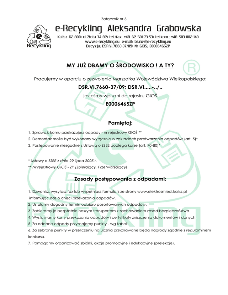 Załącznik nr 3 MY JUŻ DBAMY O ŚRODOWISKO ! A TY? Pracujemy w oparciu o zezwolenia Marszałka Województwa Wielkopolskiego: DSR.VI.7660-37/09; DSR.VI.....-../.. jesteśmy wpisani do rejestru GIOŚ E0006465ZP Pamiętaj: 1. Sprawdź, komu przekazujesz odpady - nr rejestrowy GIOŚ ** 2. Demontaż może być wykonany wyłącznie w zakładach przetwarzania odpadów (art. 5)* 3. Postępowanie niezgodne z Ustawą o ZSEE podlega karze (art. 70-80)* * Ustawy o ZSEE z dnia 29 lipca 2005 r. ** Nr rejestrowy GIOŚ - ZP (Zbierający, Przetwarzający) Zasady postępowania z odpadami: 1. Dzwonisz, wysyłasz fax lub wypełniasz formularz ze strony www.elektrosmieci.kalisz.pl informując nas o chęci przekazania odpadów. 2. Ustalamy dogodny termin odbioru posortowanych odpadów. 3. Zabieramy je bezpłatnie naszym transportem z zachowaniem zasad bezpieczeństwa. 4. Wystawiamy karty przekazania odpadów i certyfikaty zniszczenia dokumentów i danych. 5. Za oddane odpady przyznajemy punkty - wg tabeli. 6. Za zebrane punkty w przeliczeniu na ucznia przyznawane będą nagrody zgodnie z regulaminem konkursu. 7. Pomagamy organizować zbiórki, akcje promocyjne i edukacyjne (prelekcje). Załącznik nr 3 Podstawowa lista odbieranych odpadów – przelicznik punktów Lp. 1 2 3 4 5 6 7 8 9 10 11 12 13 14 15 16 17 18 19 20 21 Nazwa odpadu Jednostki komputerowe kompletne, Złom komputerowy - części komputerowe UPS, akumulatory Przewody i kable, Telefony komórkowe, Telefony elektroniczne i bez elektroniki, Radia, radioodbiorniki elektroniczne i bez elektroniki, Drukarki, skanery, kopiarki, ksero, modemy, maszyny do pisania, kasy fiskalne bez ups, Klawiatury, myszki , joistiki Monitory komputerowe i telewizory CRT kompletne Monitory i telewizory LCD kompletne Elektronarzędzia Świetlówki, lampy … Urządzenia chłodnicze, klimatyzatory Urządzenia AGD duże nie zawierające szkodliwych elementów (kuchenki, pralki, zmywarki...) Urządzenia AGD średnie (okapy, ekspresy, odkurzacze, mikrofale...) Urządzania AGD małe (czajniki, suszarki, miksery…) Płyty CD, DVD, Butelki plastikowe i nakrętki plastikowe Puszki i nakrętki aluminiowe Makulatura Kompletna lista odbieranych odpadów znajduje się na stronie www.e-recykling.eu, www.elektrosmieci.kalisz.pl Ilość punktów punkty/kg 80 40 40 50 70 20 10 30 10 10 40 20 10 20 30 30 20 20 20 40 20