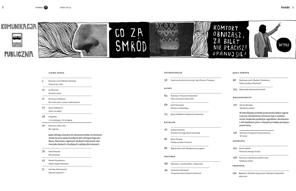 2 NUMER: 27 5 3 ZIMA 2014 nIEMA bIEDA f OT OR E P ORTA Ż p OZ A E U ROPĄ Rozmowa z prof. Elżbietą Tarkowską: 58 98 Katarzyna Kucharska-Hornung: Twarz Florence Thompson Gdzie są arabscy filozofowie? Ubóstwo bez miary 10 Jan Mencwel: Chciwość miasta 17 22 wIARA 64 Rozmowa z Tomaszem Budzyńskim: Okno, przez które widać niebo Rozmowa z Pablopavo: Nie umiem pisać o sytych i zadowolonych 68 Ignacy Dudkiewicz: Kamil Staszowski: 104 110 Muzyka w służbie Bogu 74 30 Język, którego używamy do opisywania biedy, ma kluczowe znaczenie przy wyborze politycznych rozwiązań tego problemu. Rozmowa o zgubnych skutkach traktowania ubóstwa jako dewiacji i o budzących nadzieję alternatywach. 36 51 k AT OL E W 76 Andrzej Paszewski: Pracować nie mogę, żebrać się wstydzę 116 82 Bp Jan Chrapek: Ubodzy są ciałem Chrystusa 86 Zbigniew Nosowski: Niedokończony program o BY WAT E L 122 Kamil Lipiński: Powstanie, którego nie było k U LT U R A 128 Maciek Onyszkiewicz: Rozmowa z włodarzami polskich miast: Galaktyka miejska Oddać ubogich Kościołowi 88 Rozmowa z Karoliną Wiktor: Mięsień liter Stanisław Zakroczymski: 94 Daniel Jerzy Żyżniewski: Gdzie jest twój brat? Rozmowa z Grzegorzem Kuprianowiczem: 127 cerkwi Paweł Poławski: Wina biednego 45 W dolnośląskiej wsi Kotla poniemieckie tablice nagrobne przez czterdzieści lat schowane były w wiejskiej scenie. Inicjatorka wydobycia nagrobków i zbudowania z nich lapidarium pisze o relacjach pomiędzy pamięcią a przestrzenią. Ignacy Dudkiewicz: Niespieszny budowniczy Rozmowa z Ruth Lister: Bez stygmatu Dorota Borodaj: Mieszkańcy Kuttlau Infografika: 1 zł na edukację, 11 zł na higienę Maciej Gaik: Muzułmański Gandhi kRAJ0ZNAWCZY Stefan nie zdążył 28 Rozmowa z prof. Markiem Dziekanem: Poudarowe obrazy Katherine Sherwood zMIENNIK 132 Rozmowa z Michałem Augustynem i Maciejem Łepkowskim: Wola ziemi