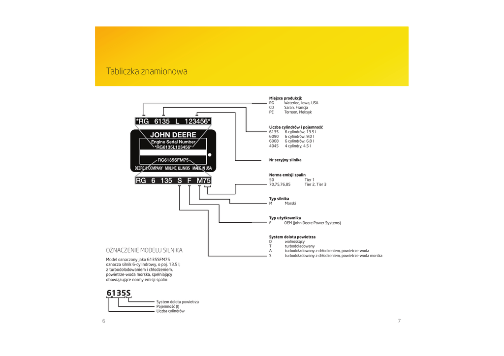 Tabliczka znamionowa ,GHQWLƟFDWLRQSODWH Miejsce produkcji: RG Waterloo, Iowa, USA CD Saran, Francja PE Torreon, Meksyk Liczba cylindrów i pojemność Liczba cylindrów i pojemność 6135 6 cylindrów, 13.5 l 6135 6 cylindrów, 13.5 l 6090 6 cylindrów, 9.0 l 9.0 l 6090 6 cylindrów, 6068 6 cylindrów, 6068 6 cylindrów, 6.8 l 6.8 l 4045 4 cylindry, 4.5 l 4045 4 cylindry, 4.5 l Nr seryjny silnika Norma emisji spalin 50 Tier 1 70,75,76,85 Tier 2, Tier 3 Typ silnika M Morski Typ użytkownika F OEM (John Deere Power Systems) OZNACZENIE MODELU SILNIKA Model oznaczony jako 6135SFM75 oznacza silnik 6-cylindrowy, o poj. 13.5 l, z turbodoładowaniem i chłodzeniem, powietrze-woda morska, spełniający obowiązujące normy emisji spalin System dolotu powietrza D wolnossący T turbodoładowany A turbodoładowany z chłodzeniem, powietrze-woda S turbodoładowany z chłodzeniem, powietrze-woda morska System dolotu powietrza Pojemność (l) Liczba cylindrów 6 7