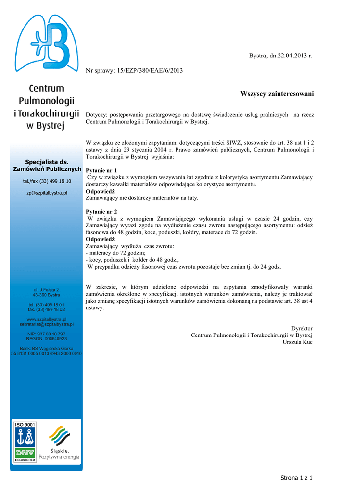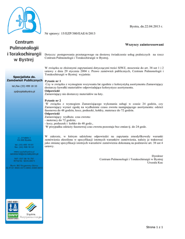 Bystra, dn.22.04.2013 dn r. Nr sprawy: 15/EZP/380/ /EZP/380/EAE/6/2013 Wszyscy zainteresowani Dotyczy: postępowania ępowania przetargowego na dostawę dostaw świadczenie usług pralniczych na rzecz Centrum Pulmonologii i Torakochirurgii w Bystrej. W związku zku ze złoŜonymi złoŜ zapytaniami dotyczącymi treści SIWZ,, stosownie do art. 38 ust 1 i 2 ustawy z dnia 29 stycznia styc 2004 r. Prawo zamówień publicznych, Centrum Pulmonologii i Torakochirurgii orakochirurgii w Bystrej wyjaśnia: Specjalista ds. Zamówień Publicznych Pytanie nr 1 Czy w związku zku z wymogiem wszywania łat zgodnie z kolorystyką kolorystyką asortymentu Zamawiaj Zamawiający tel./fax (33) 499 18 10 dostarczy kawałki materiałów odpowiadające odpowiadaj kolorystyce asortymentu. Odpowiedź [email protected] Zamawiający cy nie dostarczy materiałów na łaty. Pytanie nr 2 W związku zku z wymogiem Zamawiaj Zamawiającego cego wykonania usługi w czasie 24 godzin, czy Zamawiający cy wyrazi zgodę zgod na wydłuŜenie czasu zwrotu następującego ącego asortymentu: odzieŜ odzie fasonowa do 48 godzin, koce, poduszki, kołdry, materace do 72 godzin. Odpowiedź Zamawiający cy wydłuŜa wydłu czas zwrotu: - materacy cy do 72 godzin; godzin - kocy, poduszek duszek i kołder do 48 godz., W przypadku odzieŜy odzie y fasonowej czas zwrotu pozostaje bez zmian tj. do 24 godz. W zakresie, w którym udzielone odpowiedzi na zapytania zmodyfikowały warunki zamówienia określone okreś w specyfikacji istotnych warunków zamówienia, naleŜy nale je traktować jako zmianę specyfikacji istotnych warunków zamówienia dokonaną dokonaną na podstawie art. 38 ust 4 ustawy. Dyrektor Centrum Pulmonologii i Torakochirurgii w Bystrej Urszula Kuc Strona 1 z 1