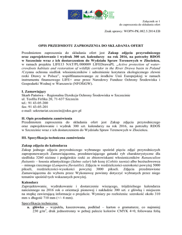 Załącznik nr 1 do zaproszenia do składania ofert Znak sprawy: WOPN-PK.082.5.2014.EB OPIS PRZEDMIOTU ZAPROSZENIA DO SKŁADANIA OFERT Przedmiotem zaproszenia do składania ofert jest Zakup zdjęcia przyrodniczego oraz zaprojektowanie i wydruk 300 szt. kalendarzy na rok 2016, na potrzeby RDOŚ w Szczecinie wraz z ich dostarczeniem do Wydziału Spraw Terenowych w Złocieńcu, w ramach projektu LIFE13 NAT/PL/000009 LIFEDrawaPL „Active protection of watercrowfoots habitats and restoration of wildlife corridor in the River Drawa basin in Poland /Czynna ochrona siedlisk włosieniczników i udrożnienie korytarza ekologicznego zlewni rzeki Drawy w Polsce”, współfinansowanego ze środków Unii Europejskiej w ramach instrumentu finansowego LIFE+ oraz przez Narodowy Fundusz Ochrony Środowiska i Gospodarki Wodnej w Warszawie (NFOŚiGW). I. Zamawiający Skarb Państwa – Regionalna Dyrekcja Ochrony Środowiska w Szczecinie ul. Teofila Firlika 20, 71-637 Szczecin tel.: 91 43-05-200 fax: 91 43-05-201 e-mail: [email protected] II. Opis przedmiotu zamówienia Przedmiotem zaproszenia do składania ofert jest Zakup zdjęcia przyrodniczego oraz zaprojektowanie i wydruk 300 szt. kalendarzy na rok 2016, na potrzeby RDOŚ w Szczecinie wraz z ich dostarczeniem do Wydziału Spraw Terenowych w Złocieńcu. III. Specyfikacja techniczna zamówienia Zakup zdjęcia do kalendarza Zakup jednego zdjęcia przyrodniczego wybranego spośród pięciu zdjęć przyrodniczych zaproponowanych Zamawiającemu, przedstawiającego gatunki ryb charakterystyczne dla siedliska 3260 nizinne i podgórskie rzeki ze zbiorowiskami włosieniczników Ranunculion fluitantis – łososia atlantyckiego (Salmo salar) lub kozę (Cobitis taenia) albo bezżuchwowca – minoga rzecznego (Lampetra fluviatilis). Zdjęcia w rozdzielczości-szerokości powyżej 5000 pikseli, rozdzielczości-wysokości powyżej 3000 pikseli. Zdjęcia przedstawione Zamawiającemu do wyboru przez Wykonawcę powinny dotyczyć wybranych przez niego tematów spośród tych wskazanych powyżej. Kalendarz Zaprojektowanie, wydrukowanie i dostarczenie wiszącego, trójdzielnego kalendarza naściennego na 2016 rok o orientacji pionowej i nakładzie 300 szt. z główką i miejscem na stopkę zawierającą informacje o projekcie. Wymiary po rozłożeniu: szerokość około 310 mm x długość 710 mm (+/- 4 mm). Specyfikacja techniczna: a. główka – wypukła, kaszerowana, podkład – karton o gramaturze, co najmniej 230 g/m2, druk jednostronny w pełnej palecie kolorów CMYK 4+0, foliowana folią błysk na całej powierzchni. Ilustracja główki będzie zawierała dwa zdjęcia – pierwsze zdjęcie (dostarczone przez Zamawiającego) będzie dotyczyło walorów krajobrazowych rzek: Drawy, Korytnicy, Radwi lub Grabowej i jego wymiary będą obejmowały całą główkę kalendarza, drugie będzie przedstawiało jeden z wymienionych powyżej gatunków ryb charakterystycznych dla siedliska 3260 nizinne i podgórskie rzeki ze zbiorowiskami włosieniczników Ranunculion fluitantis. b. plecki – doklejane do główki, druk jednostronny w pełnej palecie kolorów CMYK 4+0 na kartonie o gramaturze, co najmniej 250 g/m2, folia błysk jednostronnie na całej powierzchni, kolor tła zielony lub niebieski, kolorowy zadruk w dolnej części plecków pod kalendarium lub w główce kalendarza (w zależności od przedstawionego projektu i czytelności), który będzie zawierał: tytuł projektu w języku polskim i angielskim, numer i akronim projektu, dane Beneficjenta Koordynującego i Biura projektu LIFE13 NAT/PL/000009 LIFEDrawaPL (adres, numer telefonu, numer fax, e-mail i adres www), informację o finansowaniu projektu, informację o finansowaniu druku kalendarza oraz logotypy (Programu LIFE+, Natura 2000, Narodowego Funduszu Ochrony Środowiska i Gospodarki Wodnej, Regionalnej Dyrekcji Ochrony Środowiska w Szczecinie oraz projektu LIFEDrawaPL). c. kalendarium – doklejane do plecków, zadruk jednostronny czerwono-czarny (plus odcienie szarości) w palecie CMYK 2+0 na papierze offsetowym o gramaturze minimum 80 g/m2, trzy odrębne kalendaria jednomiesięczne (każde po 12 kartek + biała kartka doklejana do plecków, jako wzmocnienie) ze zrywanymi kartami kalendarium, każde zawierające: nazwy miesięcy i dni tygodnia (w języku polskim i w języku angielskim), numerację tygodni, a także niedziele i święta (zaznaczone na czerwono, soboty na szaro), imieniny, kolorystyka kalendarium czerwono-czarna; w zestawie jeden plastikowy pasek z przesuwanym czerwonym okienkiem do zaznaczania bieżącego dnia. Apla środkowej część kalendarium koloru np. żółtego lub kremowego w odróżnieniu od dolnej i górnej części kalendarium, które pozostaną białe. Kalendarz po złożeniu musi się swobodnie mieścić do koperty, umożliwiającej jego wysyłkę za pośrednictwem operatora pocztowego. Kalendarz będzie posiadał zawieszkę lub otwór do zawieszenia oraz w celu podniesienia jego wytrzymałości – wzmocnienie w miejscu zawieszenia. Bigowanie w trzech miejscach. d. Koperta Biała, samoklejąca, bez okienka, o formacie B4p (wymiary około 250x353 mm, +/- 4 mm) mieszczącym kalendarz w wersji złożonej. Zamówienie obejmuje zaprojektowanie, wykonanie (wydruk) oraz dostarczenie kalendarzy trójdzielnych na 2016 rok, zgodnych z opisem przedmiotu zamówienia. Opracowanie kalendarza pod względem graficznym obejmie wykonanie jego projektu graficznego (jeden oryginalny projekt) wraz z autorskimi elementami graficznymi, a także przygotowanie projektu kalendarza do wydruku. Materiały niezbędne do wykonania projektu graficznego kalendarza, w tym zdjęcie rzeki, dane teleadresowe, logotypy i informacje o finansowaniu projektu, Zamawiający dostarczy drogą e-mailową lub przez serwer FTP w ciągu 3 dni licząc od dnia następnego po dniu podpisania umowy z Wykonawcą wybranym w toku przedmiotowej procedury. Zamieszczone w projekcie graficznym zdjęcie nie może być gorszej jakoś