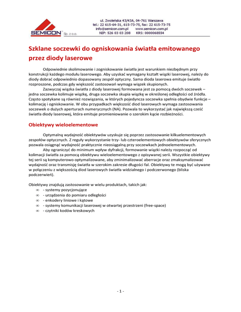 Szklane soczewki do ogniskowania światła emitowanego przez diody laserowe Odpowiednie skolimowanie i zogniskowanie światła jest warunkiem niezbędnym przy konstrukcji każdego modułu laserowego. Aby uzyskać wymagany kształt wiązki laserowej, należy do diody dobrać odpowiednio dopasowany zespół optyczny. Sama dioda laserowa emituje światło rozproszone, podczas gdy większość zastosowań wymaga wiązek skupionych. Zazwyczaj wiązka światła z diody laserowej formowana jest za pomocą dwóch soczewek – jedna soczewka kolimuje wiązkę, druga soczewka skupia wiązkę w określonej odległości od źródła. Często spotykane są również rozwiązania, w których pojedyncza soczewka spełnia obydwie funkcje – kolimację i ogniskowanie. W obu przypadkach większość diod laserowych wymaga zastosowania soczewek o dużych aperturach numerycznych (NA). Pozwala to wykorzystać jak największą cześć światła diody laserowej, która emituje promieniowanie o szerokim kącie rozbieżności. Obiektywy wieloelementowe Optymalną wydajność obiektywów uzyskuje się poprzez zastosowanie kilkuelementowych zespołów optycznych. Z reguły wykorzystanie trzy- lub czteroelementowych obiektywów sferycznych pozwala osiągnąć wydajność praktycznie nieosiągalną przy soczewkach jednoelementowych. Aby ograniczyć do minimum wpływ dyfrakcji, formowanie wiązki należy rozpocząć od kolimacji światła za pomocą obiektywu wieloelementowego z opisywanej serii. Wszystkie obiektywy tej serii są komputerowo optymalizowane, aby zminimalizować aberracje oraz zmaksymalizować wydajność oraz transmisję światła w szerokim zakresie długości fal. Obiektywy te mogą być używane w połączeniu z większością diod laserowych światła widzialnego i podczerwonego (bliska podczerwień). Obiektywy znajdują zastosowanie w wielu produktach, takich jak: • - systemy pozycjonujące • - urządzenia do pomiaru odległości • - enkodery liniowe i kątowe • - systemy komunikacji laserowej w otwartej przestrzeni (free-space) • - czytniki kodów kreskowych -1- Dostępne są trzy modele obiektywów wieloelementowych serii 336: A 660 / Ø 6,4mm oraz B 785 / Ø 6,4mm: Obiektyw czteroelementowy ogólnego przeznaczenia o małych wymiarach, kompatybilny zarówno z diodami laserowymi o obudowach Ø5,6mm i Ø9,0mm. Względnie duża apertura numeryczna (NA) wynosząca 0,48 pozwala zebrać dużą część promieniowania z większości dostępnych na rynku diod laserowych – typowa wartość efektywności zbierania zawiera się w zakresie od 91% do 95%. Obiektyw dostępny w dwóch wersjach powłoki antyrefleksyjnej MgF2: • A 660 / Ø 6,4mm - model przeznaczony dla diod laserowych światła widzialnego (od 633nm do 750nm) • B 785 / Ø 6,4mm - model przeznaczony dla diod laserowych podczerwonych (od 750nm do 980nm) C 780 / Ø 10mm: Obiektyw bardzo wysokiej jakości przeznaczony do zastosowania w bardziej wymagających aplikacjach, gdzie zapewnienie małych aberracji czoła falowego jest warunkiem krytycznym. Obiektywy te posiadają dłuższą ogniskową oraz większą aperturę obiektywu (CA), co zapewnia większą średnicę oraz mniejszą rozbieżność skolimowanej wiązki. Specyfikacja techniczna: Numer obiektywu A 660 / Ø 6,4mm Dostępność magazyn Optymalna (robocza) długość fali 660nm 785nm 780nm Ogniskowa 4,476mm 4,516mm 7,003mm Odległość od źródła 2,17mm 2,20mm 2,0mm Apertura numeryczna (NA) 0,476 0,476 0,389 Apertura obiektywu (CA) 4,30mm 4,30mm 5,45mm F# 1,04 1,05 1,28 Transmisja >93% >93% >95% C 780 / Ø 10mm tylko na zamówienie Aluminium anodowane na czarno Materiał obudowy Wymiary obudowy (średnica x długość) B 785 / Ø 6,4mm Ø6,4mm x 6,3mm Ø6,4mm x 6,3mm Ø10mm x 10mm UWAGA: W powyższej specyfikacji technicznej długość ogniskowej obliczana jest z użyciem wartości optymalnej długości fali. Nie oznacza to jednak, że obiektywy te nie mogą być używane w innym zakresie długości fal. Wszystkie obiektywy z powyższej tabeli mogą być używane zarówno w zakresie bliskiej podczerwieni, jak i w paśmie widzialnym. Przeznaczone są do pracy z diodami laserowymi emitującymi promieniowanie w zakresie od 635nm do 850nm. -2- Rysunki techniczne: -3-