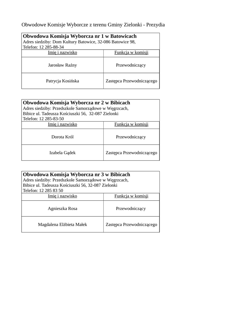 Obwodowe Komisje Wyborcze z terenu Gminy Zielonki - Prezydia Obwodowa Komisja Wyborcza nr 1 w Batowicach Adres siedziby: Dom Kultury Batowice, 32-086 Batowice 98, Telefon: 12 285-88-34 Imię i nazwisko Funkcja w komisji Jarosław Raźny Przewodniczący Patrycja Kosińska Zastępca Przewodniczącego Obwodowa Komisja Wyborcza nr 2 w Bibicach Adres siedziby: Przedszkole Samorządowe w Węgrzcach, Bibice ul. Tadeusza Kościuszki 56, 32-087 Zielonki Telefon: 12 285-83-50 Imię i nazwisko Funkcja w komisji Dorota Król Przewodniczący Izabela Gądek Zastępca Przewodniczącego Obwodowa Komisja Wyborcza nr 3 w Bibicach Adres siedziby: Przedszkole Samorządowe w Węgrzcach, Bibice ul. Tadeusza Kościuszki 56, 32-087 Zielonki Telefon: 12 285 83 50 Imię i nazwisko Funkcja w komisji Agnieszka Rosa Przewodniczący Magdalena Elżbieta Małek Zastępca Przewodniczącego Obwodowa Komisja Wyborcza nr 4 w Bibicach Adres siedziby: Zespół Szkół w Bibicach, Bibice ul. Tadeusza Kościuszki 56a, 32-087 Zielonki Telefon: 12 285 94 62 Imię i nazwisko Funkcja w komisji Agnieszka Walczak Przewodniczący Anna Olbrich Zastępca Przewodniczącego Obwodowa Komisja Wyborcza nr 5 w Bibicach Adres siedziby: Zespół Szkół w Bibicach, Bibice ul. Tadeusza Kościuszki 56a, 32-087 Zielonki Telefon: 12 285 94 62 Imię i nazwisko Funkcja w komisji Grzegorz Skwara Przewodniczący Walerian Gądek Zastępca Przewodniczącego Obwodowa Komisja Wyborcza nr 6 w Zielonkach Adres siedziby: Zespół Szkół w Zielonki, ul. Księdza Michalika 2, 32-087 Zielonki Telefon: 12 285 08 66 Imię i nazwisko Funkcja w komisji Piotr Rajmund Adamczuk Przewodniczący Ilona Maria Calik Zastępca Przewodniczącego Obwodowa Komisja Wyborcza nr 7 w Zielonkach Adres siedziby: Zespół Szkół w Zielonki, ul. Księdza Michalika 2, 32-087 Zielonki Telefon: 12 285 08 66 Imię i nazwisko Funkcja w komisji Dawid Suder Przewodniczący Marek Konderak Zastępca Przewodniczącego Obwodowa Komisja Wyborcza nr 8 w Zielonkach Adres siedziby: Zespół Szkół w Zielonkach, ul. Księdza Michalika 2, 32-087 Zielonki Telefon: 12 285 08 66 Imię i nazwisko Funkcja w komisji Damian Pałka Przewodniczący Wioletta Konderak Zastępca Przewodniczącego Obwodowa Komisja Wyborcza nr 9 w Zielonkach Adres siedziby: Sala Konferencyjna, ul. Krakowskie Przedmieście 116, 32-087 Zielonki Telefon: 12 285 06 50 Imię i nazwisko Funkcja w komisji Beata Pocha Przewodniczący Lucyna Zielińska Zastępca Przewodniczącego Obwodowa Komisja Wyborcza nr 10 w Korzkwi Adres siedziby: Zespół Szkół w Korzkwi, 32- 088 Korzkiew 18 Telefon: 12 419 41 09 Imię i nazwisko Funkcja w komisji Elżbieta Cich Przewodniczący Ewelina Radecka Zastępca Przewodniczącego Obwodowa Komisja Wyborcza nr 11 w Woli Zachariaszowskiej Adres siedziby: 32-087 Wola Zachariaszowkska 105 Telefon: 12 419 42 57 Imię i nazwisko Funkcja w komisji Anna Calik Przewodniczący Mariusz Zieliński Zastępca Przewodniczącego Obwodowa Komisja Wyborcza nr 12 w Owczarach Adres siedziby: Szkoła Podstawowa w Owczarach, ul. Długa 72, 32-088 Owczary Telefon: 12 419 41 93 Imię i nazwisko Funkcja w komisji Barbara Bryła Przewodniczący Grażyna Kosowska Zastępca Przewodniczącego Obwodowa Komisja Wyborcza nr 13 w Owczarach Adres siedziby: Dom Pomocy Społecznej w Owczarach, ul. Kasztanowa 20, 32-088 Owczary Telefon: 12 419 40 86 Imię i nazwisko Funkcja w komisji Rafał Stawiarski Przewodniczący Michał Pasiut Zastępca Przewodniczącego Obwodowa Komisja Wyborcza nr 14 w Batowicach Adres siedziby: Dom Pomocy Społecznej w Batowicach, 32-086 Batowice 1 Telefon: 12 285 70 71 Imię i nazwisko Funkcja w komisji Paulina Zdybał Przewodniczący Ewa Król Zastępca Przewodniczącego