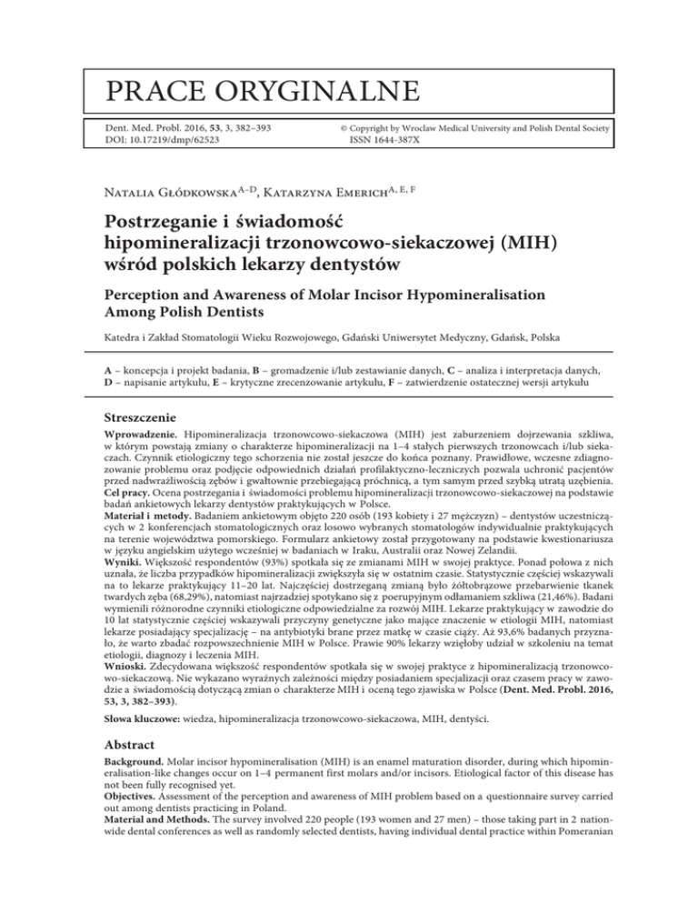 PRACE ORYGINALNE Dent. Med. Probl. 2016, 53, 3, 382–393 DOI: 10.17219/dmp/62523 © Copyright by Wroclaw Medical University and Polish Dental Society ISSN 1644-387X Natalia GłódkowskaA–D, Katarzyna EmerichA, E, F Postrzeganie i świadomość hipomineralizacji trzonowcowo-siekaczowej (MIH) wśród polskich lekarzy dentystów Perception and Awareness of Molar Incisor Hypomineralisation Among Polish Dentists Katedra i Zakład Stomatologii Wieku Rozwojowego, Gdański Uniwersytet Medyczny, Gdańsk, Polska A – koncepcja i projekt badania, B – gromadzenie i/lub zestawianie danych, C – analiza i interpretacja danych, D – napisanie artykułu, E – krytyczne zrecenzowanie artykułu, F – zatwierdzenie ostatecznej wersji artykułu Streszczenie Wprowadzenie. Hipomineralizacja trzonowcowo-siekaczowa (MIH) jest zaburzeniem dojrzewania szkliwa, w którym powstają zmiany o charakterze hipomineralizacji na 1–4 stałych pierwszych trzonowcach i/lub siekaczach. Czynnik etiologiczny tego schorzenia nie został jeszcze do końca poznany. Prawidłowe, wczesne zdiagnozowanie problemu oraz podjęcie odpowiednich działań profilaktyczno-leczniczych pozwala uchronić pacjentów przed nadwrażliwością zębów i gwałtownie przebiegającą próchnicą, a tym samym przed szybką utratą uzębienia. Cel pracy. Ocena postrzegania i świadomości problemu hipomineralizacji trzonowcowo-siekaczowej na podstawie badań ankietowych lekarzy dentystów praktykujących w Polsce. Materiał i metody. Badaniem ankietowym objęto 220 osób (193 kobiety i 27 mężczyzn) – dentystów uczestniczących w 2 konferencjach stomatologicznych oraz losowo wybranych stomatologów indywidualnie praktykujących na terenie województwa pomorskiego. Formularz ankietowy został przygotowany na podstawie kwestionariusza w języku angielskim użytego wcześniej w badaniach w Iraku, Australii oraz Nowej Zelandii. Wyniki. Większość respondentów (93%) spotkała się ze zmianami MIH w swojej praktyce. Ponad połowa z nich uznała, że liczba przypadków hipomineralizacji zwiększyła się w ostatnim czasie. Statystycznie częściej wskazywali na to lekarze praktykujący 11–20 lat. Najczęściej dostrzeganą zmianą było żółtobrązowe przebarwienie tkanek twardych zęba (68,29%), natomiast najrzadziej spotykano się z poerupyjnym odłamaniem szkliwa (21,46%). Badani wymienili różnorodne czynniki etiologiczne odpowiedzialne za rozwój MIH. Lekarze praktykujący w zawodzie do 10 lat statystycznie częściej wskazywali przyczyny genetyczne jako mające znaczenie w etiologii MIH, natomiast lekarze posiadający specjalizację – na antybiotyki brane przez matkę w czasie ciąży. Aż 93,6% badanych przyznało, że warto zbadać rozpowszechnienie MIH w Polsce. Prawie 90% lekarzy wzięłoby udział w szkoleniu na temat etiologii, diagnozy i leczenia MIH. Wnioski. Zdecydowana większość respondentów spotkała się w swojej praktyce z hipomineralizacją trzonowcowo-siekaczową. Nie wykazano wyraźnych zależności między posiadaniem specjalizacji oraz czasem pracy w zawodzie a świadomością dotyczącą zmian o charakterze MIH i oceną tego zjawiska w Polsce (Dent. Med. Probl. 2016, 53, 3, 382–393). Słowa kluczowe: wiedza, hipomineralizacja trzonowcowo-siekaczowa, MIH, dentyści. Abstract Background. Molar incisor hypomineralisation (MIH) is an enamel maturation disorder, during which hipomineralisation-like changes occur on 1–4 permanent first molars and/or incisors. Etiological factor of this disease has not been fully recognised yet. Objectives. Assessment of the perception and awareness of MIH problem based on a questionnaire survey carried out among dentists practicing in Poland. Material and Methods. The survey involved 220 people (193 women and 27 men) – those taking part in 2 nationwide dental conferences as well as randomly selected dentists, having individual dental practice within Pomeranian 383 Postrzeganie i świadomość MIH Voivodeship, Poland. The questionnaire has been prepared based on existing English version which was previously used in similar surveys in Iraq, Australia and New Zealand. Results. Majority of the respondents (93%) have met with MIH changes in their practice. Over half of them stated that a number of hypomineralisation cases increased in last years. The most frequently recognised change related to hypomineralisation was a yellow-brown demarcation (68.29%), whereas most seldom was post-eruption breakdown of the enamel (21.46%). Genetic predisposition was statistically more often linked to MIH occurrence by dentist practicing 0–10 years, while certificated doctors pointed statistically more often to the antibiotics taken during pregnancy. As much as 93.6% respondents have admitted that it would be of significant importance to investigate the MIH problem in Poland. Almost 90% of dentists expressed their willingness to participate in training regarding etiology, diagnosis and treatment of MIH. Conclusions. Majority of respondents have encountered MIH problem in their practice. According to the results obtained, there is no clear relation between MIH awareness or perception of this problem in Poland and possession of specialization or the duration of working as a dentist (Dent. Med. Probl. 2016, 53, 3, 382–393). Key words: knowledge, molar incisor hypomineralisation, MIH, dentists. Większe zainteresowanie problematyką zaburzeń rozwojowych zębów w ostatnich latach ma niewątpliwie związek ze zmniejszającą się liczbą przypadków występowania próchnicy u dzieci w wielu krajach. Dzięki temu naukowcy mogli skoncentrować się na pracach badawczych ukierunkowanych na poznanie i dogłębną analizę czynników powodujących zaburzenia prawidłowego rozwoju twardych tkanek zęba oraz skali tego zjawiska. Rozpoznano ich jak dotąd wiele, jednak zdecydowaną większość zaklasyfikowano jako hipoplazję albo hipomineralizację [1]. Szczególną uwagę badaczy zwróciły zmiany 