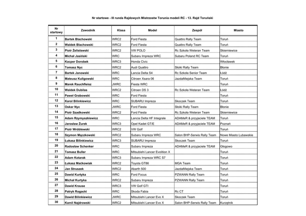 Nr startowe - III runda Rajdowych Mistrzostw Torunia modeli RC - 13. Rajd Toruński Nr startowy Zawodnik Klasa Model Zespół Miasto 1 Bartek Blachowski WRC2 Ford Fiesta Quattro Rally Team Toruń 2 Waldek Blachowski WRC2 Ford Fiesta Quattro Rally Team Toruń 3 Piotr Żelisławski WRC2 VW POLO Rc Szkoła Weteran Team Skierniewice 4 Michał Jasiński WRC Subaru Impreza WRC Subaru Poland RC Team Toruń 5 Kacper Dorobek WRC3 Honda Civic 6 Tomasz Nyc WRC2 Audi Quattro Słoiki Rally Team 7 Bartek Janowski WRC Lancia Delta S4 Rc Szkoła Senior Team Łódź 8 Mateusz Kuligowski WRC Citroen Xsara 06 JazdaMiejska Team Toruń 9 Marek Rauchfleisz JWRC Fiesta WRC 10 Waldek Dubilas WRC2 Citroen DS 3 11 Paweł Grabowski WRC Ford Fiesta Włocławek Błonie Toruń Rc Szkoła Weteran Team Łódź Toruń 12 Karol Bilinkiewicz WRC SUBARU Impreza Skoczek Team Toruń 13 Oskar Nyc JWRC Ford Fiesta Słoiki Rally Team Błonie 14 Piotr Szadkowski WRC2 Ford Fiesta Rc Szkoła Weteran Team Skierniewice 15 Adam Rzymyszkiewicz WRC Lancia Delta HF Integrale ADAMeR & przyjaciele TEAM Toruń 16 Jarosław Żurek WRC3 Opel Kadet GT/E ADAMeR & przyjaciele TEAM Poznań 17 Piotr Wróblewski WRC2 VW Golf 18 Szymon Mączkowski WRC2 Subaru Impreza WRC Salon BHP-Serwis Rally Team Nowe Miasto Lubawskie 19 Łukasz Bilinkiewicz WRC3 SUBARU Impreza Skoczek Team Toruń 20 Radosław Schenker WRC Subaru Impreza ADAMeR & przyjaciele TEAM Głogowo Toruń 21 Tomasz Buller WRC Mitsubishi Lancer Evolition X Toruń 22 Adam Kotarak WRC3 Subaru Impreza WRC S7 Toruń 23 Łukasz Maćkowiak WRC2 Toyota GT86 MGA Team Toruń 24 Jan Struszek WRC2 Abarth 500 JazdaMiejska Team Toruń 25 Dawid Kurtyka WRC Ford Focus PZWANN Rally Team Toruń PZWANN Rally Team Toruń 26 Michał Kurtyka WRC2 Subaru Impreza 27 Dawid Krause WRC3 VW Golf GTI 28 Patryk Rogacki WRC Skoda Fabia Rc CT Toruń 29 Dawid Bilinkiewicz JWRC Mitsubishi Lancer Evo X Skoczek Team Toruń 30 Kamil Najdrowski WRC2 Mitsubishi Lancer Evo X Salon BHP-Serwis Rally Team Kurzętnik Toruń