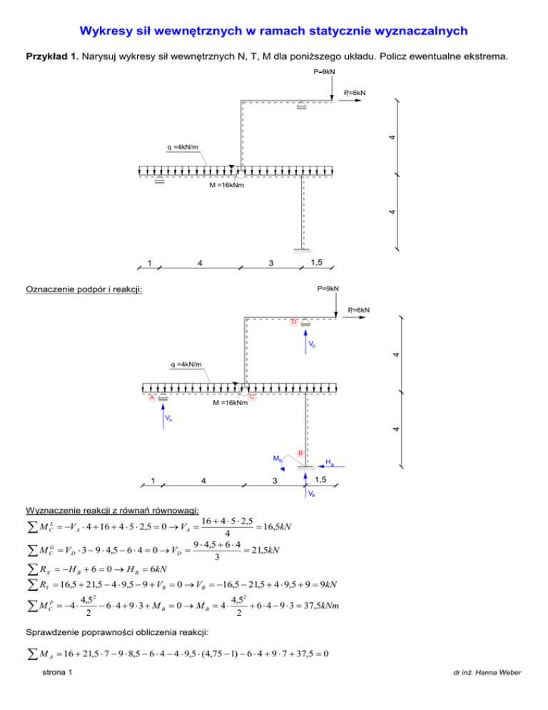 Wykresy sił wewnętrznych w ramach statycznie wyznaczalnych Przykład 1. Narysuj wykresy sił wewnętrznych N, T, M dla poniższego układu. Policz ewentualne ekstrema. 4 P=6kN 1 q =4kN/m 4 M =16kNm 1 1,5 3 4 P=9kN Oznaczenie podpór i reakcji: P=6kN 1 D 4 VD q =4kN/m A M =16kNm C 4 VA MB 1 4 3 B HB 1,5 VB Wyznaczenie reakcji z równań równowagi: 16 + 4 ⋅ 5 ⋅ 2,5 = 16,5kN 4 9 ⋅ 4,5 + 6 ⋅ 4 = 21,5kN ∑ M CG = VD ⋅ 3 − 9 ⋅ 4,5 − 6 ⋅ 4 = 0 → VD = 3 ∑ RX = −H B + 6 = 0 → H B = 6kN ∑M ∑R Y L C = −VA ⋅ 4 + 16 + 4 ⋅ 5 ⋅ 2,5 = 0 → VA = = 16,5 + 21,5 − 4 ⋅ 9,5 − 9 + VB = 0 → VB = −16,5 − 21,5 + 4 ⋅ 9,5 + 9 = 9kN ∑ M CP = −4 ⋅ 4,52 4,52 − 6⋅ 4 + 9⋅3+ M B = 0 → MB = 4⋅ + 6 ⋅ 4 − 9 ⋅ 3 = 37,5kNm 2 2 Sprawdzenie poprawności obliczenia reakcji: ∑M A = 16 + 21,5 ⋅ 7 − 9 ⋅ 8,5 − 6 ⋅ 4 − 4 ⋅ 9,5 ⋅ (4,75 − 1) − 6 ⋅ 4 + 9 ⋅ 7 + 37,5 = 0 strona 1 dr inż. Hanna Weber Umieszczenie wartości reakcji na układzie: P=9kN P=6kN 1 4 D VD=21,5kN q =4kN/m A C 4 M =16kNm VA=16,5kN MB=37,5kNm 1 3 4 B H B= 6kN 1,5 VB=9kN Oznaczenie punktów, w których należy policzyć wykresy - początek i koniec układu, przed podporą i za podporą, przed węzłem, przed obciążeniem i za obciążeniem. P=9kN 8 9 10 11 12 13 14 15 P=6kN 1 7 q =4kN/m 1 2 3 46 5 M =16kNm 16 Rysowanie wykresów sił wewnętrznych: Siła normalna w danym punkcie to suma rzutów wszystkich sił po jednej stronie przekroju na kierunek równoległy do osi pręta. Dla lepszej widoczności, niebieskim kolorem zaznaczono układ, czarnym wykresy. Siła normalna jest dodatnia, jeżeli powoduje rozciąganie elementu, ujemna, gdy ściskanie. Siła tnąca w danym punkcie to suma rzutów wszystkich sił po jednej stronie przekroju na kierunek prostopadły do osi pręta. Siła tnąca jest dodatnia, jeżeli powoduje obrót pręta zgodnie z ruchem wskazówek zegara, ujemna, gdy wywołuje obrót pręta przeciwnie do ruchu wskazówek zegara. Tam, gdzie siła tnąca osiąga wartość równą 0, na wykresie momentów pojawia się ekstremum. strona 2 dr inż. Hanna Weber 6 Wykres sił normalnych: 6 + 12,5 + 12,5 9 6 6 N [kN] - 9 Wykres sił tnących: 9 9 + 6 12,5 x1 12,5 x2 9 6 + - 12,5 + 6 4 + - e1 6 3,5 -3 + e2 T [kN] + 6 Wyznaczenie ekstremum: P=9kN P=6kN 1 x1 VD=21,5kN q =4kN/m x2 C A 4 M =16kNm VA=16,5kN MB=37,5kNm 1 4 D 4 3 B H B= 6kN 1,5 VB=9kN strona 3 dr inż. Hanna Weber Ekstremum 1: Dla ułatwienia obliczeń ekstremum liczone jest z lewej strony przekroju α-α: - równanie na siłę tnącą w przekroju α-α: 1 T [ x1 ] = 16,5 − 4 x1 = 0 → x1 = q =4kN/m 16,5 = 4,125m 4 - równanie na moment w przekroju α-α (moment rozciągający spód piszemy ze znakiem "+"): x1 2 M [ x1 ] = 16,5 ⋅ ( x1 − 1) − 4 x1 ⋅ A - moment ekstremalny: VA=16,5kN M ekstr.[ x1 = 4,125m] = 16,5 ⋅ ( 4,125 − 1) − 4 ⋅ 4,125 ⋅ (x1-1) 1 4,125 = 17,53kNm 2 Ekstremum 2: Dla ułatwienia obliczeń ekstremum liczone jest z prawej strony przekroju β-β: x2 - równanie na siłę tnącą w przekroju β-β: T [ x2 ] = −9 + 4 x2 = 0 → x2 = 9 = 2,25m 4 - równanie na moment w przekroju β-β (moment rozciągający spód piszemy ze znakiem "+"): M [ x2 ] = 9 ⋅ ( x2 − 1,5) − 4 x2 ⋅ x2 − 6 ⋅ 4 + 37,5 2 - moment ekstremalny: B M =37,5kNm M ekstr.[ x2 = 2,25m] = 9 ⋅ ( 2,25 − 1,5) − 4 ⋅ 2,25 ⋅ H B= 6kN 2,25 − 6 ⋅ 4 + 37,5 = 10,125kNm 2 1,5 VB=9kN Wykres momentów zginających: 13,5 24 Sprawdzenie równowagi momentów w węzłach: 24 + 4,5kNm 9kNm + 4,5 2 - 13,5 - + + 10,125 16 17,53 13,5kNm ∑ M = −9 − 4,5 + 13,5 = 0 9 - 24kNm M [kNm] 37,5 24kNm ∑ M = −24 + 24 = 0 strona 4 dr inż. Hanna Weber 2 Przykład 2. Narysuj wykresy sił wewnętrznych N, T, M dla poniższego układu. Policz ewentualne ekstrema. P=24kN 1 2 P=18kN 2 M =28kNm 4 q =6kN/m 1,5 1 2 1,5 1,5 Oznaczenie podpór i reakcji: VB 2 B P=24kN 1 2 P=18kN 2 M =28kNm C 4 q =6kN/m MA A HA 1,5 1 2 1,5 1,5 VA Wyznaczenie reakcji z równań równowagi: X 24 ⋅ 2 − 18 = 5kN 6 = − H A − 24 + 6 ⋅ 6 = 0 → H A = 36 − 24 = 12kN Y = VA − 18 − 5 = 0 → VA = 18 + 5 = 23kN ∑M ∑R ∑R ∑M P C L C = −VB ⋅ 6 + 24 ⋅ 2 − 18 ⋅1 = 0 → VB = = 6 ⋅ 6 ⋅1 − 12 ⋅ 4 + 28 − M A = 0 → M A = 36 − 12 ⋅ 4 + 28 = 16kNm Sprawdzenie poprawności obliczenia reakcji: ∑M B = −24 ⋅ 2 + 18 ⋅ 5 + 28 + 6 ⋅ 6 ⋅ (2 + 3) − 12 ⋅ 8 − 23 ⋅ 6 − 16 = 0 strona 5 dr inż. Hanna Weber Umieszczenie wartości reakcji na układzie: VB=5kN 2 B P=24kN 1 2 P=18kN 2 M =28kNm C 4 q =6kN/m MA=16kNm A H A= 12kN 1,5 1 1,5 2 1,5 VA=23kN Oznaczenie punktów, w których należy policzyć wykresy: 2 14 13 12 4 2 P=18kN 2 M =28kNm 3 1 2 7 5 8 9 P=24kN 1 10 11 4 q =6kN/m 6 1,5 1 2 1,5 Rysowanie wykresów sił wewnętrznych: Rozłożenie sił na pręcie ukośnym na składowe w celu policzenia sił tnących i normalnych: VB VB sin =5 0,8=4kN V B cos =5 0,6=3kN cos α = 3 = 0,6 5 sin α = 4 = 0,8 5 P 1 cos =24 0,6=14,4kN P=24kN 1 P1 sin =24 0,8=19,2kN strona 6 dr inż. Hanna Weber Wykres sił normalnych: 4 4 18,4 23 - 18,4 24 24 - N [kN] 23 Wykres sił tnących: + 3 23 16,2 - + + 12 23 5 + 5 12 - 16,2 T [kN] 2 e1 + 12 Wyznaczenie ekstremum: Z uwagi na symetryczny kształt wykresu sił tnących na pręcie pionowym, na podstawie rysunku widać, że ekstremum znajduje się w połowie wysokości dolnej części słupa: 2 VB=5kN P=24kN 1 2 P=18kN 2 M =28kNm 4 q =6kN/m 2 MA=16kNm H A= 12kN 1,5 1 2 1,5 1,5 VA=23kN strona 7 dr inż. Hanna Weber Ekstremum: Dla ułatwienia obliczeń moment ekstremalny liczony jest od dołu przekroju α-α: - moment ekstremalny: MA=16kNm M ekstr.[ x = 2m] = 16 + 12 ⋅ 2 − 6 ⋅ 2 ⋅ 2 q =6kN/m 2 = 28kNm 2 H A= 12kN VA=23kN Wykres momentów zginających: Sprawdzenie równowagi momentów w węzłach: 7,5 28 12kNm 28 28kNm - 12 + 16 16kNm + 33 23 + 33 28 ∑ M = 28 − 12 − 16 = 0 M [kNm] 33kNm 16 33kNm ∑ M = −33 + 33 = 0 strona 8 dr inż. Hanna Weber
