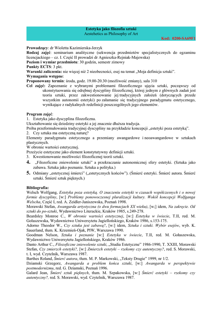 Estetyka jako filozofia sztuki Aestehetics as Philosophy of Art Kod: 0200-SA69F1 Prowadzący: dr Wioletta Kazimierska-Jerzyk Rodzaj zajęć: seminarium analityczne (sekwencja przedmiotów specjalistycznych do egzaminu licencjackiego – cz. I. Część II prowadzi dr Agnieszka-Rejniak-Majewska) Poziom i wymiar przedmiotu: 30 godzin, semestr zimowy Punkty ECTS: 3 pkt. Warunki zaliczenia: nie więcej niż 2 nieobecności, esej na temat „Moja definicja sztuki”. Wymagania wstępne: Proponowany termin: środa, godz. 19.00-20.30 (możliwość zmiany), sala 310 Cel zajęć: Zapoznanie z wybranymi problemami filozoficznego ujęcia sztuki, począwszy od ukonstytuowania się odrębnej dyscypliny filozoficznej, której jednym z głównych zadań jest teoria sztuki, przez zakwestionowanie jej tradycyjnych założeń (dotyczących przede wszystkim autonomii estetyki) po załamanie się tradycyjnego paradygmatu estetycznego, wynikające z radykalnych redefinicji poszczególnych jego elementów. Program zajęć: 1. Estetyka jako dyscyplina filozoficzna. Ukształtowanie się dziedziny estetyki a jej znacznie dłuższa tradycja. Próba przeformułowania tradycyjnej dyscypliny na przykładzie koncepcji „estetyki poza estetyką”. 2. Czy sztuka ma estetyczną naturę? Elementy paradygmatu estetycznego a przemiany awangardowe i neoawangardowe w sztukach plastycznych. W obronie wartości estetycznej. Przeżycie estetyczne jako element konstytutywny definicji sztuki. 3. Kwestionowanie możliwości filozoficznej teorii sztuki. 4. „Filozoficzne zniewolenie sztuki” a przekraczanie autonomicznej sfery estetyki. (Sztuka jako zabawa. Sztuka jako poznanie. Sztuka a polityka.) 5. Odmiany „estetycznej śmierci” („estetycznych końców”). (Śmierć estetyki. Śmierć autora. Śmierć sztuki. Śmierć sztuk pięknych.) Bibliografia: Welsch Wolfgang, Estetyka poza estetyką. O znaczeniu estetyki w czasach współczesnych i o nowej formie dyscypliny, [w:] Problemy ponowoczesnej pluralizacji kultury. Wokół koncepcji Wolfganga Welscha, Część I, red. A. Zeidler-Janiszewska, Poznań 1998. Morawski Stefan, Awangarda artystyczna (o dwu formacjach XX wieku), [w;] idem, Na zakręcie. Od sztuki do po-sztuki, Wydawnictwo Literackie, Kraków 1985, s.249-278. Beardsley Monroe C., W obronie wartości estetycznej, [w:] Estetyka w świecie, T.II, red. M. Gołaszewska, Wydawnictwo Uniwersytetu Jagiellońskiego, Kraków 1986, s.153-175. Adorno Theodor W., Czy sztuka jest zabawą?, [w:] idem, Sztuka i sztuki. Wybór esejów, wyb. K. Sauerland, tłum. K. Krzemień-Ojak, PIW, Warszawa 1990. Goodman Nelson, Sztuka i poznanie [w:] Estetyka w świecie, T.II, red. M. Gołaszewska, Wydawnictwo Uniwersytetu Jagiellońskiego, Kraków 1986. Danto Arthur C., Filozoficzne zniewolenie sztuki, „Studia Estetyczne” 1986-1990, T. XXIII, Morawski Stefan, Czy zmierzch estetyki?, [w:] Zmierzch estetyki – rzekomy czy autentyczny?, red. S. Morawski, t. I, wyd. Czytelnik, Warszawa 1987. Barthes Roland, Śmierć autora, tłum. M. P. Markowski, „Teksty Drugie” 1999, nr 1/2. Dziamski Grzegorz, Awangarda a problem końca sztuki, [w:] Awangarda w perspektywie postmodernizmu, red. G. Dziamski, Poznań 1996. Galard Jean, Śmierć sztuk pięknych, tłum. M. Szpakowska, [w:] Śmierć estetyki – rzekomy czy autentyczny?, red. S. Morawski, wyd. Czytelnik, Warszawa 1987.