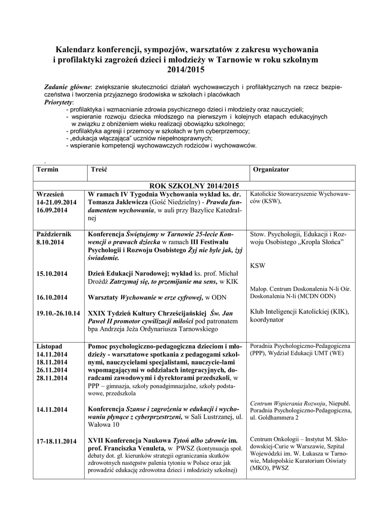 Kalendarz konferencji, sympozjów, warsztatów z zakresu wychowania i profilaktyki zagrożeń dzieci i młodzieży w Tarnowie w roku szkolnym 2014/2015 Zadanie główne: zwiększanie skuteczności działań wychowawczych i profilaktycznych na rzecz bezpieczeństwa i tworzenia przyjaznego środowiska w szkołach i placówkach Priorytety: - profilaktyka i wzmacnianie zdrowia psychicznego dzieci i młodzieży oraz nauczycieli; - wspieranie rozwoju dziecka młodszego na pierwszym i kolejnych etapach edukacyjnych w związku z obniżeniem wieku realizacji obowiązku szkolnego; - profilaktyka agresji i przemocy w szkołach w tym cyberprzemocy; - „edukacja włączająca” uczniów niepełnosprawnych; - wspieranie kompetencji wychowawczych rodziców i wychowawców. . Termin Treść Organizator ROK SZKOLNY 2014/2015 Wrzesień 14-21.09.2014 16.09.2014 W ramach IV Tygodnia Wychowania wykład ks. dr. Tomasza Jaklewicza (Gość Niedzielny) - Prawda fundamentem wychowania, w auli przy Bazylice Katedralnej Katolickie Stowarzyszenie Wychowawców (KSW), Październik 8.10.2014 Konferencja Świętujemy w Tarnowie 25-lecie Konwencji o prawach dziecka w ramach III Festiwalu Psychologii i Rozwoju Osobistego Żyj nie byle jak, żyj świadomie. Stow. Psychologii, Edukacji i Rozwoju Osobistego „Kropla Słońca” 15.10.2014 Dzień Edukacji Narodowej; wykład ks. prof. Michał Drożdż Zatrzymaj się, to przemijanie ma sens, w KIK 16.10.2014 Warsztaty Wychowanie w erze cyfrowej, w ODN 19.10.-26.10.14 XXIX Tydzień Kultury Chrześcijańskiej Św. Jan Paweł II promotor cywilizacji miłości pod patronatem bpa Andrzeja Jeża Ordynariusza Tarnowskiego Klub Inteligencji Katolickiej (KIK), koordynator Listopad 14.11.2014 18.11.2014 26.11.2014 28.11.2014 Pomoc psychologiczno-pedagogiczna dzieciom i młodzieży - warsztatowe spotkania z pedagogami szkolnymi, nauczycielami specjalistami, nauczycie-lami wspomagającymi w oddziałach integracyjnych, doradcami zawodowymi i dyrektorami przedszkoli, w PPP – gimnazja, szkoły ponadgimnazjalne, szkoły podsta- Poradnia Psychologiczno-Pedagogiczna (PPP), Wydział Edukacji UMT (WE) KSW Małop. Centrum Doskonalenia N-li Ośr. Doskonalenia N-li (MCDN ODN) wowe, przedszkola 14.11.2014 Konferencja Szanse i zagrożenia w edukacji i wychowaniu płynące z cyberprzestrzeni, w Sali Lustrzanej, ul. Wałowa 10 17-18.11.2014 XVII Konferencja Naukowa Tytoń albo zdrowie im. prof. Franciszka Venuleta, w PWSZ (kontynuacja społ. debaty dot. gł. kierunków strategii ograniczania skutków zdrowotnych następstw palenia tytoniu w Polsce oraz jak prowadzić edukację zdrowotna dzieci i młodzieży szkolnej) Centrum Wspierania Rozwoju, Niepubl. Poradnia Psychologiczno-Pedagogiczna, ul. Goldhammera 2 Centrum Onkologii – Instytut M. Skłodowskiej-Curie w Warszawie, Szpital Wojewódzki im. W. Łukasza w Tarnowie, Małopolskie Kuratorium Oświaty (MKO), PWSZ 20.11.2014 Konferencja Depresja wśród młodzieży, sala konferencyjna w Pałacu Młodzieży 20.11.2014 Z cyklu W trosce o język wykład Retoryka jako sztuka komunikacji społecznej prof. dr. hab. Andrzeja Borowskiego, w PWSZ 26.11.2014 IV Konferencja Nowe technologie, przestrzeń publiczna, seksualizacja życia – jak chronić nasze dzieci? z udziałem Lesława Sierockiego dyrektora Stowarzyszenia Twoja Sprawa - w Sali Lustrzanej, ul. Wałowa 10 Młodzieżowa Rada Miejska (MRM), Pałac Młodzieży (PM), SPPT, Komenda Miejska Policji Wydział Prewencji Tow. Literackie w Tarnowie, Liderzy Tarnowskiej Inicjatywy Edukacyjnej e-ducaTIO KCEM „Kana”, Centrum Systemowego Rozwoju 27.11.2014 Konferencja naukowa Przeciwdziałanie bezdomności dzieci (poprzedzona cyklem warsztatów o tym samym tytule), ul. Waryńskiego 14 Małopolska Wyższa Szkoła Ekonomiczna (MWSE), Katedra Nauk o Wychowaniu 29.11.2014 Konferencja Dziecko wobec przemocy w ramach Programu Ochrony Ofiar Przemocy w Rodzinie dla Miasta Tarnowa w Tygodniu „Białej Wstążki” z udziałem psychologa Ryszarda Izdebskiego z Krakowa – dla pedagogów szkolnych MOPS Grudzień 1.12.2014 Debata Oksfordzka – teza: Wychowanie bez klapsa nie jest możliwe, w TCKP w ramach Kampanii „Biała Wstążka” Tarnowski Ośrodek Interwencji Kryzysowej i Wsparcia Ofiar Przemocy (TOIK i WOP) 3.12.2014 XXV Miejska Konferencja Wychowawcza Zdrowie psychiczne dzieci i młodzieży - profilaktyka, interwencja, wsparcie środowiskowe, w Sali Lustrzanej, ul. Wałowa 10 Specjalistyczna Poradnia Profilaktyczno-Terapeutyczna (SPPT), Wydział Edukacji (WE) UMT 7.11.2014 III Sezon Tarnowskiej Ligii Debatanckiej - Debata Oksfordzka – teza: Portale społecznościowe są zagrożeniem dla młodych ludzi, w Pałacu Młodzieży Stow. Nowe Przestrzenie, III LO i IV LO 9.12.2014 Warsztaty dla rodziców i Rad Rodziców G i SPG na temat kondycji psychicznej tarnowskiej młodzieży (wyniki raportu SPPT) w ZS Ogólnokształcących i Technicznych WE, PPP, ZS Ogólnokształcących i Technicznych (ZSOiT Szkoła Szczepanika) 11-12.12.2014 Konferencja Edukacja na rozdrożu w MCDN ODN dot. aktualnych problemów wiążących się z edukacją w Polsce – dla środowiska nauczycieli z Tarnowa i Powiatu Tarnowskiego Wyższa Szkoła Biznesu NLU w Nowym Sączu, Wyższa Szkoła Menadżerska w Warszawie, Polski Oddział Kultury Europejskiej (SEC), UMT, Starostwo Powiatu Tarnowskiego Styczeń 30.01.2015 Konferencja Praca z uczniem z dysfunkcjami Małopolski Kurator Oświaty (MKO), Woj. Szpital im. św. Łukasza, Tarnowski Ośrodek Onkologiczny Luty 5.02.2015 Spotkanie warsztatowe z przedstawicielami organizacji pozarządowych dot. składania ofert do konkur- w szkole ogólnodostępnej dla dyrektorów, nauczycieli i pedagogów szkolnych, w auli Małopolskiego Urzędu Wojewódzkiego Delegatura Urzędu w Tarnowie, Al. Solidarności 5-9 Samodzielne Stanowisko ds. Współpracy z Organizacjami Pozarządowymi, su ofert na dotacje, UMT ul. Goldhammera 3 Wydział Edukacji 5.02.2015 Spotkanie grupy wsparcia nauczycieli wspomagających w 
