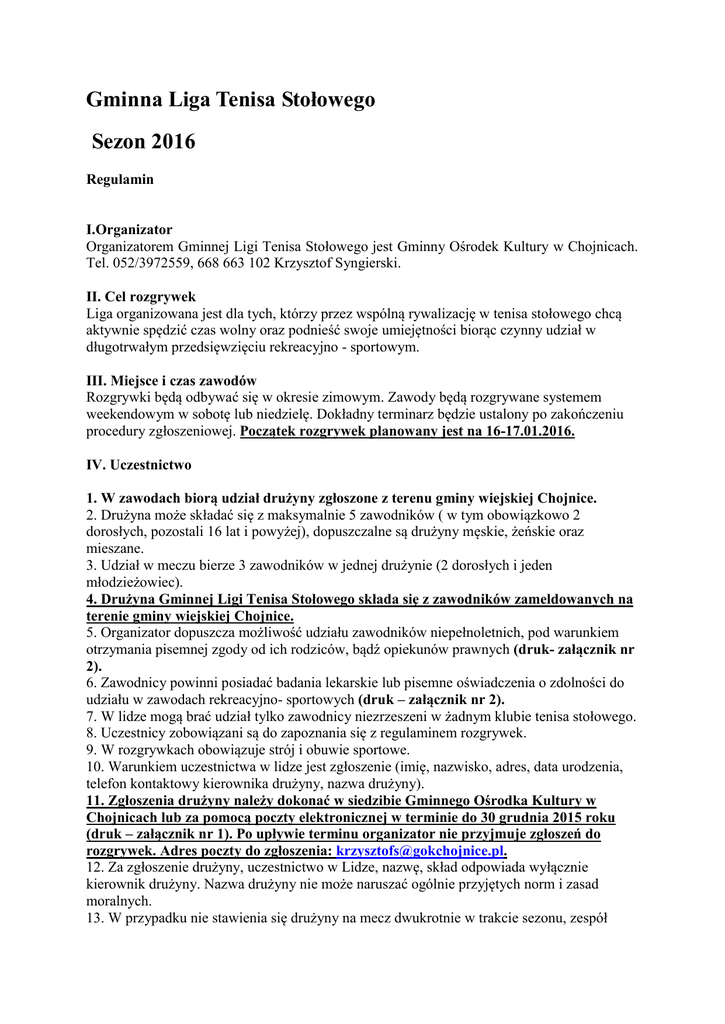 Gminna Liga Tenisa Stołowego Sezon 2016 Regulamin I.Organizator Organizatorem Gminnej Ligi Tenisa Stołowego jest Gminny Ośrodek Kultury w Chojnicach. Tel. 052/3972559, 668 663 102 Krzysztof Syngierski. II. Cel rozgrywek Liga organizowana jest dla tych, którzy przez wspólną rywalizację w tenisa stołowego chcą aktywnie spędzić czas wolny oraz podnieść swoje umiejętności biorąc czynny udział w długotrwałym przedsięwzięciu rekreacyjno - sportowym. III. Miejsce i czas zawodów Rozgrywki będą odbywać się w okresie zimowym. Zawody będą rozgrywane systemem weekendowym w sobotę lub niedzielę. Dokładny terminarz będzie ustalony po zakończeniu procedury zgłoszeniowej. Początek rozgrywek planowany jest na 16-17.01.2016. IV. Uczestnictwo 1. W zawodach biorą udział drużyny zgłoszone z terenu gminy wiejskiej Chojnice. 2. Drużyna może składać się z maksymalnie 5 zawodników ( w tym obowiązkowo 2 dorosłych, pozostali 16 lat i powyżej), dopuszczalne są drużyny męskie, żeńskie oraz mieszane. 3. Udział w meczu bierze 3 zawodników w jednej drużynie (2 dorosłych i jeden młodzieżowiec). 4. Drużyna Gminnej Ligi Tenisa Stołowego składa się z zawodników zameldowanych na terenie gminy wiejskiej Chojnice. 5. Organizator dopuszcza możliwość udziału zawodników niepełnoletnich, pod warunkiem otrzymania pisemnej zgody od ich rodziców, bądź opiekunów prawnych (druk- załącznik nr 2). 6. Zawodnicy powinni posiadać badania lekarskie lub pisemne oświadczenia o zdolności do udziału w zawodach rekreacyjno- sportowych (druk – załącznik nr 2). 7. W lidze mogą brać udział tylko zawodnicy niezrzeszeni w żadnym klubie tenisa stołowego. 8. Uczestnicy zobowiązani są do zapoznania się z regulaminem rozgrywek. 9. W rozgrywkach obowiązuje strój i obuwie sportowe. 10. Warunkiem uczestnictwa w lidze jest zgłoszenie (imię, nazwisko, adres, data urodzenia, telefon kontaktowy kierownika drużyny, nazwa drużyny). 11. Zgłoszenia drużyny należy dokonać w siedzibie Gminnego Ośrodka Kultury w Chojnicach lub za pomocą poczty elektronicznej w terminie do 30 grudnia 2015 roku (druk – załącznik nr 1). Po upływie terminu organizator nie przyjmuje zgłoszeń do rozgrywek. Adres poczty do zgłoszenia: [email protected]. 12. Za zgłoszenie drużyny, uczestnictwo w Lidze, nazwę, skład odpowiada wyłącznie kierownik drużyny. Nazwa drużyny nie może naruszać ogólnie przyjętych norm i zasad moralnych. 13. W przypadku nie stawienia się drużyny na mecz dwukrotnie w trakcie sezonu, zespół zostaje zdyskwalifikowany, a wyniki spotkań tej drużyny, jeżeli zostało rozegranych mniej niż 50% spotkań z całego sezonu zostają anulowane, w przypadku powyżej 50% wszystkie zespoły otrzymują walkower. 14. W przypadku wycofania się drużyny z rozgrywek obowiązują zasady z powyższego punktu (tj. 13). 15. W trakcie trwania sezonu zawodnik nie może zmienić przynależności do zespołu.(Dany zawodnik może w trakcie jednego sezonu występować wyłącznie w jednej drużynie). Imiennego zgłoszenia zawodników należy dokonać w siedzibie GOK w Chojnicach lub za pomocą poczty elektronicznej przynajmniej na jeden dzień przed pierwszym ligowym meczem (druk – załącznik nr 3). V. Zasady gry 1. Liga rozgrywana jest systemem dwurundowym (mecz i rewanż). 2. Mecze rozgrywane będą zgodnie z obowiązującymi przepisami PZTS. 3. W zależności od liczby zgłoszeń partie w meczu będą rozgrywane systemem „ każdy z każdym”, bądź wg następującego klucza: A-Y, 2.B-X, 3.C-Z, 4.A-X, 5.C-Y, 6.B-Z, gdzie: A,B,C – zawodnicy drużyny I, X,Y,Z – zawodnicy drużyny II. 4. Jeżeli mecze będą rozgrywane wg w/w klucza, to rozstawienie zawodników dokonane będzie na podstawie losowania przeprowadzonego bezpośrednio przed spotkaniem. 5. Mecz ligowy rozgrywany systemem „ każdy z każdym” składa się z 9 partii singlowych, natomiast mecz rozgrywany wg klucza obejmuje 6 partii singlowych. 6. Na zwycięstwo partii składa się wygranie 2 setów (11-punktowy system liczenia), w przypadku stanu 1:1 w setach rozgrywany jest tie-break, również do 11 pkt. 7. Do meczu dopuszcza się drużynę składającą się minimum z dwóch zawodników, z tym że spotkania trzeciego zawodnika zalicza się jako walkower dla drużyny przeciwnej. 8. Dopuszczalne są maksymalnie 2 zmiany w trakcie meczu, tj. za zawodnika grającego może wejść jeden z rezerwowych, ale pozostaje on w grze do końca meczu ( nie ma zmian powrotnych). 9. Zawodnik rezerwowy, który wszedł do gry nie może być zmieniony przez drugiego rezerwowego. 10. Drużyna, która spóźni się na mecz powyżej 15 minut od wyznaczonego terminu spotkania, przegrywa walkowerem. 11. Sędziami spotkań ligowych będą sami zawodnicy lub osoby wyznaczone przez organizatora rozgrywek. 12. Przed każdą partią zawodnikom przysługuje dwuminutowa rozgrzewka przy stole. VI. Klasyfikacja 1. W lidze obowiązuje następująca punktacja: a. Zwycięstwo - 2 pkt., b. Remis - 1 pkt. (w przypadku rozgrywania meczu wg klucza), c. Porażka – 0 pkt. 2. O kolejności miejsc w tabeli decyduje suma zdobytych punktów. W przypadku równej ilości punktów uzyskanych przez dwie drużyny, decyduje: a. Stosunek meczów między tymi drużynami, b. Stosunek gier (partii), c. Stosunek setów, d. Większa liczba wygranych gier (partii). 3. Prowadzona będzie także klasyfikacja indywidualna na najlepszego zawodnika Ligi. 4. O kolejności w klasyfikacji indywidualnej zawodników decydują kolejno: a. Liczba punktów (3 pkt – wygranie partii 2:0 w setach przez danego zawodnika, 1 pkt – wygranie partii 2:1 w setach przez danego zawodnika, 0 pkt - przegranie partii przez danego zawodnika) b. Liczba wygranych setów, c. Liczba przegranych setów, d. Stosunek „małych punktów”. 5. Liczba punktów wyłoni zwycięzców Gminnej Ligi Tenisa Stołowego. Punktacja ligowa, uzupełniana po każdej kolejce, będzie dostępna w si