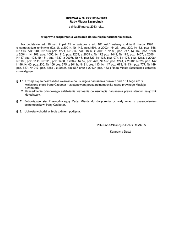 UCHWAŁA Nr XXXIII/304/2013 Rady Miasta Szczecinek z dnia 25 marca 2013 roku. w sprawie rozpatrzenia wezwania do usunięcia naruszenia prawa. Na podstawie art. 18 ust. 2 pkt 15 w związku z art. 101 ust.1 ustawy z dnia 8 marca 1990 r. o samorządzie gminnym (Dz. U. z 2001r. Nr 142, poz.1591, z 2002r. Nr 23, poz. 220, Nr 62, poz. 558, Nr 113, poz. 984, Nr 153 poz. 1271, Nr 214, poz. 1806, z 2003 r. Nr 80, poz. 717, Nr 162, poz. 1568, z 2004 r. Nr 102, poz. 1055, Nr 116, poz. 1203, z 2005 r. Nr 172 poz. 1441, Nr 175, poz. 1457, z 2006 r. Nr 17 poz. 128, Nr 181, poz. 1337, z 2007r. Nr 48, poz.327, Nr 138, poz. 974, Nr 173, poz. 1218, z 2008r. Nr 180, poz. 1111, Nr 223, poz. 1458, z 2009r. Nr 52, poz. 420, Nr 157, poz. 1241, z 2010r. Nr 28, poz. 142 i 146, Nr 40, poz. 230, Nr 106 poz. 675, z 2011r. Nr 21, poz. 113, Nr 117 poz. 679, Nr 134, poz. 777, Nr 149, poz. 887, Nr 217, poz. 1281 , z 2012r. poz.567 oraz z 2013r. poz. 153 ) Rada Miasta Szczecinek uchwala, co następuje: § 1.1. Uznaje się za bezzasadne wezwanie do usunięcia naruszenia prawa z dnia 13 lutego 2013r. wniesione przez Irenę Czebotar – zastępowaną przez pełnomocnika radcę prawnego Macieja Czebotara. 2. Uzasadnienie odmownego załatwienia wezwania do usunięcia naruszenia prawa stanowi załącznik do uchwały. § 2. Zobowiązuje się Przewodniczącą Rady Miasta do doręczenia uchwały wraz z uzasadnieniem pełnomocnikowi Ireny Czebotar. § 3. Uchwała wchodzi w Ŝycie z dniem podjęcia. PRZEWODNICZĄCA RADY MIASTA Katarzyna Dudź Załącznik do uchwały Nr XXXIII/304/2013 Rady Miasta Szczecinek z dnia 25 marca 2013 roku. Pismem z dnia 13 lutego 2013r. Pani Irena Czebotar reprezentowana przez pełnomocnika radcę prawnego Macieja Czebotara wezwała Radę Miasta Szczecinek do usunięcia naruszenia prawa poprzez uchylenie uchwały Rady Miasta Szczecinek Nr XXIX/244/2012 z dnia 12 listopada 2012r. w sprawie określenia wysokości stawek podatku od nieruchomości. W wezwaniu, wnioskodawczyni, podnosi zarzut, Ŝe sesja Rady Miasta Szczecinek w dniu 12 listopada 2012r. została zwołana przez „osobę niebędącą radnym, ani przewodniczącym rady” poniewaŜ mandat Mirosława Wacławskiego, pełniącego funkcję Przewodniczącego Rady Miasta Szczecinek, który zwołał w/w sesję wygasł „z dniem 27 lutego 2012r.”, zgodnie z zarządzeniem zastępczym Wojewody Zachodniopomorskiego z dnia 27 lutego 2012r., które uprawomocniło się w dniu 10 stycznia 2013r. W ocenie wnioskodawczyni sesja Rady Miasta Szczecinek odbyta w dniu 12 listopada 2012r. była posiedzeniem nieformalnym, które nie miało „charakteru sesji Rady Miasta”. Wnioskodawczyni w dalszej części swojego wezwania stwierdza, Ŝe „wobec faktu, Ŝe w dniu 12 listopada 2012r. nie doszło do sesji rady, nie mogła zostać podjęta uchwała nr XXIX”. W ocenie Rady Miasta Szczecinek, wezwanie do usunięcia naruszeń prawa Pani Ireny Czebotar nie zasługuje na uwzględnienie, poniewaŜ brak jest jakichkolwiek podstaw prawnych, które pozwalałyby uznać stanowisko zawarte w w/w wezwaniu za zasadne. Analiza przepisów: ustawy z dnia z dnia 8 marca 1990 r. o samorządzie gminnym (Dz. U. z 2001r. Nr 142, poz.1591, z późn. zm.), ustawy z dnia 16 lipca 1998 r. Ordynacja wyborcza do rad gmin, rad powiatów i sejmików województw (Dz. U. z 2010r. Nr 176, z późn.zm.) oraz orzecznictwa sądowego upowaŜnia do jednoznacznego stwierdzenia, Ŝe uchwały podjęte przez Radę Miasta Szczecinek na sesjach zwołanych przez Pana Mirosława Wacławskiego, pełniącego funkcję Przewodniczącego Rady Miasta Szczecinek w okresie do 10 stycznia 2013r., w tym na sesji odbytej w dniu 12 listopada 2012r. są waŜne i podjęte zostały na sesjach zwołanych przez osobę uprawnioną do tego na postawie art. 20 ust.1 ustawy o samorządzie gminnym. Zgodnie ze stanowiskiem prezentowanym w piśmiennictwie i orzecznictwie sądów administracyjnych, m.in. w wyrokach: wyroku WSA w Rzeszowie z dnia 11 lipca 2007r. (sygn.akt II SA/Rz 339/07), wyroku NSA z 10 marca 2008r. (sygn.akt II OSK 1775/07) oraz wyroku NSA z 10 marca 2008r. (sygn.akt II OSK 1814/07) mandat radnego Pana Mirosława Wacławskiego istniał do chwili ogłoszenia przez Naczelny Sąd Administracyjny w dniu 10 stycznia 2013r. wyroku oddalającego jego skargę kasacyjną od wyroku Wojewódzkiego Sądu Administracyjnego w Szczecinie z dnia 08.08.2012r., sygn.akt II SA/Sz 447/12 oddalającego skargę Pana Mirosława Wacławskiego na zarządzenie zastępcze Wojewody Zachodniopomorskiego z dnia 27 lutego 2012r. nr 1/2012 w przedmiocie wygaśnięcia mandatu radnego. Oznacza to, Ŝe Pan Mirosław Wacławski do momentu ogłoszenia w/w wyroku przez NSA był członkiem Rady Miasta Szczecinek, jako jej radny, był zobowiązany i uprawniony do brania udziału w pracach Rady Miasta, w tym równieŜ zobowiązany i uprawniony do wykonywania obowiązków Przewodniczącego Rady Miasta Szczecinek, miał oczywiście równieŜ prawo czynnego uczestniczenia w pracach Rady Miasta, w tym w zwoływanych sesjach i komisjach, w tym brania udziału w głosowaniach. Zgodnie z przywołanymi wyŜej orzeczeniami sądowymi „Radny do chwili podjęcia przez radę gminy uchwały o stwierdzeniu wygaśnięcia mandatu posiadał, /…/ mandat, był członkiem Rady Gminy, zobowiązanym do brania udziału w pracach Rady, a więc powinien być zawiadomiony o sesji Rady, w której miał prawo czynnego uczestniczenia, za wyjątkiem głosowania w sprawie wygaśnięcia swojego mandatu (art. 25a ustawy o samorządzie gminnym). /…/bez podjęcia uchwały stwierdzającej wygaśnięcie mandatu radnego, mandat ten w dalszym ciągu istnieje. Zatem do chwili podjęcia przez Radę Gminy prawnie skutecznej uchwały o stwierdzeniu wygaśnięcia mandatu radnego, skarŜący dysponował mandatem radnego i powinien być zawiadomiony o sesji Rady w przewidzianym przez Statut terminie. JeŜeli bowiem płynący z ustawy skutek prawny (np. wygaśnięcie mandatu radnego) wymaga jeg