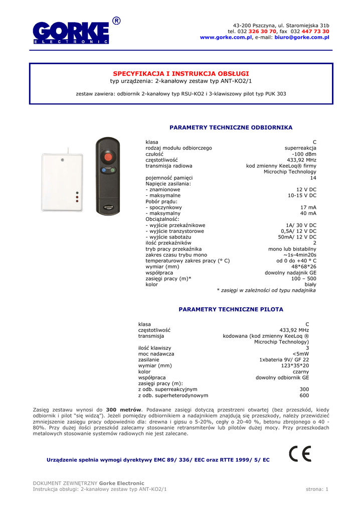 43-200 Pszczyna, ul. Staromiejska 31b tel. 032 326 30 70, fax 032 447 73 30 www.gorke.com.pl, e-mail: [email protected] SPECYFIKACJA I INSTRUKCJA OBSŁUGI typ urządzenia: 2-kanałowy zestaw typ ANT-KO2/1 zestaw zawiera: odbiornik 2-kanałowy typ RSU-KO2 i 3-klawiszowy pilot typ PUK 303 PARAMETRY TECHNICZNE ODBIORNIKA klasa rodzaj modułu odbiorczego czułość częstotliwość transmisja radiowa C superreakcja -100 dBm 433,92 MHz kod zmienny KeeLoq® firmy Microchip Technology 14 pojemność pamięci Napięcie zasilania: - znamionowe 12 V DC - maksymalne 10-15 V DC Pobór prądu: - spoczynkowy 17 mA - maksymalny 40 mA Obciążalność: - wyjście przekaźnikowe 1A/ 30 V DC - wyjście tranzystorowe 0,5A/ 12 V DC - wyjście sabotażu 50mA/ 12 V DC ilość przekaźników 2 tryb pracy przekaźnika mono lub bistabilny zakres czasu trybu mono ~1s-4min20s temperaturowy zakres pracy (° C) od 0 do +40 ° C wymiar (mm) 48*68*26 współpraca dowolny nadajnik GE zasięgi pracy (m)* 100 – 500 kolor biały * zasięgi w zależności od typu nadajnika PARAMETRY TECHNICZNE PILOTA klasa częstotliwość transmisja ilość klawiszy moc nadawcza zasilanie wymiar (mm) kolor współpraca zasięgi pracy (m): z odb. superreakcyjnym z odb. superheterodynowym C 433,92 MHz kodowana (kod zmienny KeeLoq ® Microchip Technology) 3 <5mW 1xbateria 9V/ GF 22 123*35*20 czarny dowolny odbiornik GE 300 600 Zasięg zestawu wynosi do 300 metrów. Podawane zasięgi dotyczą przestrzeni otwartej (bez przeszkód, kiedy odbiornik i pilot “się widzą”). Jeżeli pomiędzy odbiornikiem a nadajnikiem znajdują się przeszkody, należy przewidzieć zmniejszenie zasięgu pracy odpowiednio dla: drewna i gipsu o 5-20%, cegły o 20-40 %, betonu zbrojonego o 40 80%. Przy dużej ilości przeszkód zalecamy stosowanie retransmiterów lub pilotów dużej mocy. Przy przeszkodach metalowych stosowanie systemów radiowych nie jest zalecane. Urządzenie spełnia wymogi dyrektywy EMC 89/ 336/ EEC oraz RTTE 1999/ 5/ EC DOKUMENT ZEWNĘTRZNY Gorke Electronic Instrukcja obsługi: 2-kanałowy zestaw typ ANT-KO2/1 strona: 1 INSTRUKCJA OBSŁUGI ODBIORNIKA PRZEZNACZENIE ELEMENTÓW Dioda kontrola ZASILANIA (zielona ZAS) – wskazuje doprowadzenie zasilania do odbiornika Dioda kontrola KANAŁU 1 (czerwona K1) - sygnalizuje stan załączenia przekaźnika 1 Dioda K2 (czerwona) - sygnalizuje stan załączenia przekaźnika 2, a w czasie nauki sygnalizuje czynności programowania Przycisk NAUKA - uruchamia procedury programowania ANTYSABOTAŻ - umożliwia podłączenie urządzenia do linii antysabotażowej Wyjście S - stosowane jest do podłączenia sygnalizatora akustycznego, który krótkimi sygnałami informuje o tym czy przekaźnik jest załączany czy wyłączany np. przy otwieraniu ścieżki dostępu do szyfratora czy uzbrajaniu prostego obwodu alarmowego. Przy załączeniu przekaźnika na wyjściu S pojawia się jeden krótki sygnał, a przy wyłączeniu dwa. Wyjście to można obciążyć max 0,5A/ 12 V DC, co w zupełności wystarcza nawet przy stosowaniu syren o wysokim poziomie głośności. Zacisk dodatni sygnalizatora należy podłączyć do +12 V, a zacisk ujemny sygnalizatora do wyjścia S na listwie zaciskowej. SAB 12 V Warunki instalacji odbiornika. Zaleca się montowanie odbiornika możliwie wysoko, z dala od urządzeń metalowych i elektrycznych, albowiem odbiornik superreakcyjny jest czuły na zakłócenia elektromagnetyczne. Dla warunków wysokich zakłóceń elektromagnetycznych zalecamy stosowanie odbiorników superheterodynowych np. typu OPC. Odbiornik RSU-KO2 wymaga dla instalacji miejsc suchych i zamkniętych. Kod transmisji. Oparta na kodzie zmiennym (KeeLoq ® firmy Microchip Technology Inc. USA) transmisja radiowa zapewnia wysokie bezpieczeństwo użytkowania. Każda transmisja jest inna od poprzedniej. Warunkiem podstawowym zadziałania odbiornika jest wpisanie pilota do jego pamięci. Pilot może być zaprogramowany do nieograniczonej ilości odbiorników. „Zgubienie” 15 kolejnych transmisji (użycie pilota poza zasięgiem odbiornika) wymaga dwukrotnego przesłania sygnału (2x nacisnąć klawisz pilota). Zastosowanie. Odbiornik stosowany jest we wszelkiego typu zdalnym sterowaniu np. pracą takich urządzeń jak: bramy i szlabany, zamki elektromagnetyczne, oświetlenie itd. W systemach alarmowych stosowany jest: • jako przycisk antynapadowy • do zdalnego sterowania pracy innych urządzeń systemu np. czujki • do rozbrajania/ uzbrajania systemu, stref itd. Częstotliwość. Odbiornik pracuje w oparciu o częstotliwość 433,92 MHz. Pasmo to w większości państw UE (i tu w Polsce) nie wymaga specjalnych zezwoleń i koncesji na użytkowanie. DOKUMENT ZEWNĘTRZNY Gorke Electronic Instrukcja obsługi: 2-kanałowy zestaw typ ANT-KO2/1 strona: 2 UWAGA ! Wejście do trybu programowania jest możliwe TYLKO przy wyłączonym przekaźniku (dioda K1 nie świeci). Aby wyłączyć przekaźnik należy nacisnąć klawisz pilota lub chwilowo odłączyć napięcie zasilania odbiornika. 1. REJESTRACJA PILOTA DWUKLAWISZOWEGO a) naciśnij przycisk NAUKA na więcej niż 0,5s lecz mniej niż 4s - dioda K2 zaświeci się b) naciśnij ten klawisz pilota który ma sterować kanałem 1 - dioda K2 zgaśnie c) naciśnij ponownie klawisz pilota który ma sterować kanałem 2 - dioda K2 zaświeci się na 3s, po czym będzie pulsować i zgaśnie. Koniec rejestracji nowego pilota Gdy próba wpisania nowego pilota przebiegnie niepomyślnie dioda K2 mignie 1 raz i zgaśnie. Należy rozpocząć rejestrację od początku. Jeżeli pamięć odbiornika jest pełna (wpisano 14 pilotów) to wpisanie kolejnego, nowego pilota powoduje wykasowanie pilota wpisanego jako pierwszy. W przypadku większej jak 14 liczby użytkowników należy stosować odbiorniki z rozszerzoną pamięcią wersję S (113 nadajników), lub konfigurację modułu odbiorczego WLC 201 z odpowiednią ilością odbiorników wersji LC (dwóch dla 226 użytkowników, trzech dla 339 it