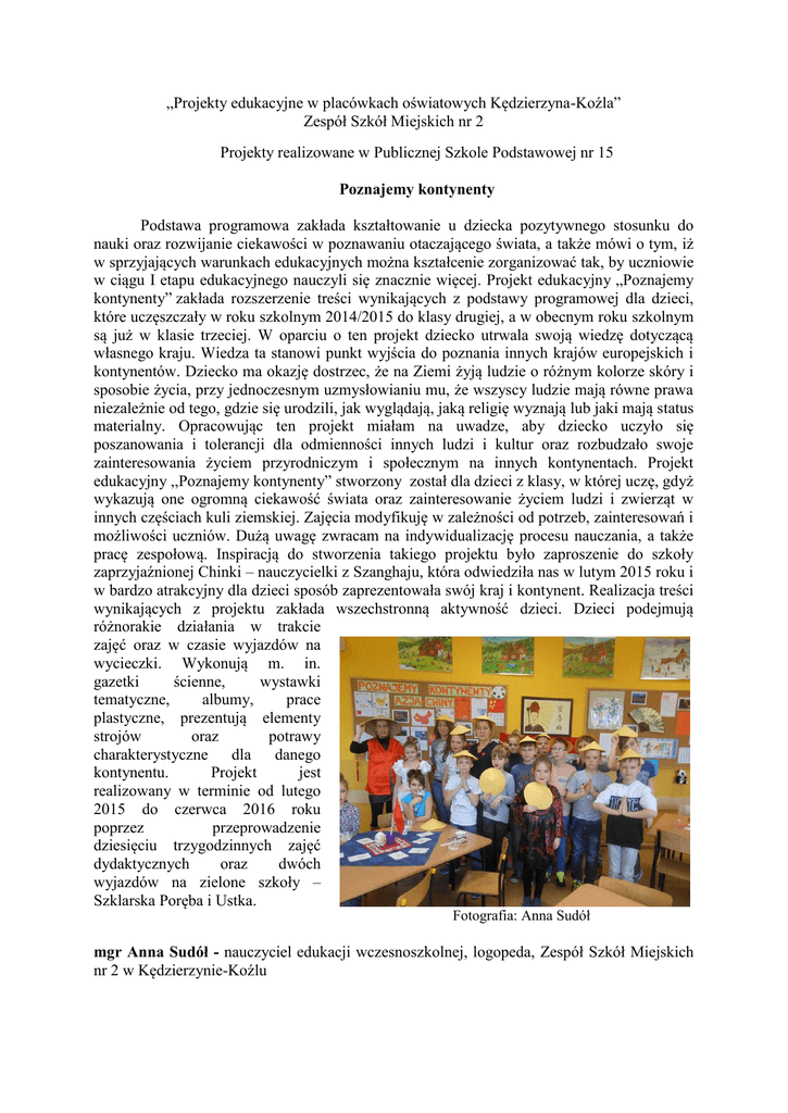 „Projekty edukacyjne w placówkach oświatowych Kędzierzyna-Koźla” Zespół Szkół Miejskich nr 2 Projekty realizowane w Publicznej Szkole Podstawowej nr 15 Poznajemy kontynenty Podstawa programowa zakłada kształtowanie u dziecka pozytywnego stosunku do nauki oraz rozwijanie ciekawości w poznawaniu otaczającego świata, a także mówi o tym, iż w sprzyjających warunkach edukacyjnych można kształcenie zorganizować tak, by uczniowie w ciągu I etapu edukacyjnego nauczyli się znacznie więcej. Projekt edukacyjny „Poznajemy kontynenty” zakłada rozszerzenie treści wynikających z podstawy programowej dla dzieci, które uczęszczały w roku szkolnym 2014/2015 do klasy drugiej, a w obecnym roku szkolnym są już w klasie trzeciej. W oparciu o ten projekt dziecko utrwala swoją wiedzę dotyczącą własnego kraju. Wiedza ta stanowi punkt wyjścia do poznania innych krajów europejskich i kontynentów. Dziecko ma okazję dostrzec, że na Ziemi żyją ludzie o różnym kolorze skóry i sposobie życia, przy jednoczesnym uzmysłowianiu mu, że wszyscy ludzie mają równe prawa niezależnie od tego, gdzie się urodzili, jak wyglądają, jaką religię wyznają lub jaki mają status materialny. Opracowując ten projekt miałam na uwadze, aby dziecko uczyło się poszanowania i tolerancji dla odmienności innych ludzi i kultur oraz rozbudzało swoje zainteresowania życiem przyrodniczym i społecznym na innych kontynentach. Projekt edukacyjny ,,Poznajemy kontynenty” stworzony został dla dzieci z klasy, w której uczę, gdyż wykazują one ogromną ciekawość świata oraz zainteresowanie życiem ludzi i zwierząt w innych częściach kuli ziemskiej. Zajęcia modyfikuję w zależności od potrzeb, zainteresowań i możliwości uczniów. Dużą uwagę zwracam na indywidualizację procesu nauczania, a także pracę zespołową. Inspiracją do stworzenia takiego projektu było zaproszenie do szkoły zaprzyjaźnionej Chinki – nauczycielki z Szanghaju, która odwiedziła nas w lutym 2015 roku i w bardzo atrakcyjny dla dzieci sposób zaprezentowała swój kraj i kontynent. Realizacja treści wynikających z projektu zakłada wszechstronną aktywność dzieci. Dzieci podejmują różnorakie działania w trakcie zajęć oraz w czasie wyjazdów na wycieczki. Wykonują m. in. gazetki ścienne, wystawki tematyczne, albumy, prace plastyczne, prezentują elementy strojów oraz potrawy charakterystyczne dla danego kontynentu. Projekt jest realizowany w terminie od lutego 2015 do czerwca 2016 roku poprzez przeprowadzenie dziesięciu trzygodzinnych zajęć dydaktycznych oraz dwóch wyjazdów na zielone szkoły – Szklarska Poręba i Ustka. Fotografia: Anna Sudół mgr Anna Sudół - nauczyciel edukacji wczesnoszkolnej, logopeda, Zespół Szkół Miejskich nr 2 w Kędzierzynie-Koźlu Ratuj pszczoły Bez pszczół nie ma życia na ziemi. Tę prawdę powtarzają co jakiś czas naukowcy alarmując, że liczba tych pożytecznych owadów gwałtownie spada. W naszej szkole postanowiliśmy pomóc pszczołom. W tym celu opiekun koła ekologicznego p. Beata Polak w ZSM nr 2 w Kędzierzynie-Koźlu przygotowała program, który ma za zadanie edukację społeczeństwa z zakresu życia pszczół oraz wpływanie na zmianę zachowań ludzi, które mają związek z ich ochroną. W ramach projektu członkowie koła z opiekunem podjęli różnorodne działania. Jednym z jego najważniejszych punktów były realizowane w ciekawej formie zajęcia edukacyjne przeznaczone dla przedszkolaków oraz uczniów klas 1-3. Na nich dzieci mogły między innymi uzyskać odpowiedź na pytanie w jaki sposób powstaje miód. Dowiedziały się również jak wiele dostajemy dzięki ciężkiej pracy pszczołowatych. Zrozumienie mechanizmu zapylania roślin i kluczowej roli pszczół w tym procesie pozwoliło młodym ludziom lepiej pojąć związek między pszczołami a choćby owocami, które jadają codziennie w szkole. Na zajęciach poruszyli również temat zagrożeń, które dotykają pszczoły w dzisiejszych czasach. Dzieci dowiedziały się nie tylko dlaczego pszczół jest coraz mniej, ale przede wszystkim co każdy z nas może zrobić żeby pomóc tym pożytecznym stworzeniom. Nie od dziś wiadomo, że świetnym sposobem na naukę jest zabawa. Dlatego nasi uczniowie przygotowali i wykonali układ taneczny do piosenki „Taniec Mai“. Ponadto chętni uczniowie wzięli udział w dodatkowych zajęciach, na których zbudowali gniazda dla owadów, które prezentowali później podczas zajęć. Najciekawszym punktem programu było spotkanie z ludźmi, którzy o pszczołach wiedzą wszystko, czyli miejscowymi pszczelarzami. Podzielili się oni z uczniami mnóstwem ciekawych informacji o pszczołach, a spotkanie zakończyło się degustacją miodu. By nie być gołosłownym postanowiliśmy sprawić, żeby nasze otoczenie było przyjazne dla pszczół i wraz z uczniami zasadzić na terenie szkoły miododajne rośliny. Te wszystkie działania miały na celu uwrażliwienie naszego społeczeństwa na problemy, które prędzej czy później dotkną nas wszystkich i pokazanie, że każdy z nas Fotografia: Izabela Zajdowicz może coś z tym zrobić. A najwięcej możemy wszyscy razem. mgr inż. Beata Polak - nauczyciel przyrody, Zespół Szkół Miejskich nr 2 w KędzierzynieKoźlu Projekty realizowane w Publicznym Gimnazjum nr 2 British Royal Family - Kto odziedziczy tron królewski? Takim projektem zaprezentowali się uczniowie klasy 2A Publicznego Gimnazjum nr 2 całej społeczności szkolnej Zespołu Szkół Miejskich nr 2, dyrekcji oraz rodzicom uczniów. Dwunastu gimnazjalistów wraz z opiekunem grupy projektowej p. Hanną Pokorską (nauczycielem j. angielskiego) 4 miesiące przygotowywali się do prezentacji swojego projektu. Sami podzielili się na grupy, w których każda pod czujnym okiem opiekuna projektu miała do wykonania różne zadania. Grupy były odpowiedzialne m. in. za zaprojektowanie i wykonanie drzewa genealogic