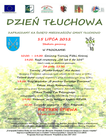 DZIEŃ TŁUCHOWA ZAPRASZAMY NA ŚWIĘTO MIESZKAŃCÓW GMINY TŁUCHOWO 15 LIPCA 2012 Stadion gminny W PROGRAMIE: 10.00. – 14.00. Gminny Turniej Piłki Nożnej 14.00. Rajd rowerowy „Od lat 5 do 105” Start i meta na stadionie gminnym Od godz. 15.30. Turniej „Miotło hokeja” dla dzieci drużyny 5 osobowe zgłaszają swój udział do 13 lipca w GOKu Talent show występy zespołów i grup działających przy GOKu 18.00. Bieg strażaka „O puchar Świętego Floriana” Pokaz Akcji Ratowniczej przygotowany przez Państwowe i Gminne Jednostki Straży Pożarnej Pokaz Pracy Psa Policyjnego przygotowany przez Komendę Powiatową Policji w Lipnie 19:00. Zabawa przy muzyce kapeli REWIR 21.00. Gwiazda wieczoru – Piotr Pręgowski PIETREK ŚPIEWA Od godz. 22.00. DYSKOTEKA PONADTO: Wesołe miasteczko dla dzieci /batuty, trampoliny, bungee, karuzela, basen z piłeczkami/ Regionalne smakołyki przygotowane przez Koła Gospodyń z terenu Gminy Tłuchowo