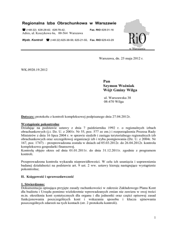 Regionalna Izba Obrachunkowa w Warszawie (+48 22) 628-28-62, 628-78-42, Adres, ul. Koszykowa 6a, 00-564 Warszawa Wydz. Kontroli Fax. RIO 628-31-16 (+48 22) 625-38-59, 625-21-55, Fax. RIO 629-43-29 Warszawa, dn. 25 maja 2012 r. WK.0920.19.2012 Pan Szymon Woźniak Wójt Gminy Wilga ul. Warszawska 38 08-470 Wilga Dotyczy: protokołu z kontroli kompleksowej podpisanego dnia 27.04.2012r. Wystąpienie pokontrolne Działając na podstawie ustawy z dnia 7 października 1992 r. o regionalnych izbach obrachunkowych (j.t. Dz. U. z 2001r. Nr 55, poz. 577 ze zm.) i rozporządzenia Prezesa Rady Ministrów z dnia 16 lipca 2004 r. w sprawie siedzib i zasięgu terytorialnego regionalnych izb obrachunkowych oraz szczegółowej organizacji izb i trybu postępowania (Dz. U. z 2004r. Nr 167, poz. 1747) – przeprowadzona została w dniach od 05.03.2012r. do 26.04.2012r. kontrola kompleksowa gospodarki finansowej. Kontrolą objęto okres od dnia 01.01.2011r. do dnia 31.12.2011r. zgodnie z programem kontroli. Przeprowadzona kontrola wykazała nieprawidłowości. W celu ich usunięcia i usprawnienia badanej działalności na podstawie art. 9 ust. 2 ww. ustawy kieruję następujące wystąpienie pokontrolne; II. Księgowość i sprawozdawczość 1. Stwierdzono: Dokumentacja opisująca przyjęte zasady rachunkowości w zakresie Zakładowego Planu Kont dla budżetu i Urzędu pomimo wielokrotnie wprowadzanych zmian nie zawiera w swej treści m.in. określenia kont syntetycznych dla organu i dla jednostki oraz części opisowej zasad funkcjonowania poszczególnych kont i wskazania sposobu i klucza ujmowania poszczególnych zdarzeń na tych kontach (str. 2 protokołu kontroli). 1 Wnioskuję: Dokonać ujednolicenia treści Zakładowego Planu Kont, tak aby w pełni spełniał wymogi określone: - ustawą z dnia 29 września 1994r. o rachunkowości (tj. Dz. U. z 2009r. Nr 152, poz.1223 z późn. zm.), - rozporządzeniem Ministra Finansów z dnia 5 lipca 2010r. w sprawie szczególnych zasad rachunkowości oraz planów kont dla budżetu państwa, budżetów jednostek samorządu terytorialnego, jednostek budżetowych, samorządowych zakładów budżetowych, państwowych funduszy celowych oraz państwowych jednostek budżetowych mających siedzibę poza granicami Rzeczypospolitej Polskiej (Dz. U. Nr 128, poz. 861 z późn. zm.), - rozporządzeniem Ministra Finansów z dnia 25 października 2010r. w sprawie zasad rachunkowości oraz planów kont dla organów podatkowych jednostek samorządu terytorialnego (Dz. U. Nr 208, poz. 1375). 2. Stwierdzono: Nie prowadzono ewidencji analitycznej do kont budżetu 222 „Rozliczenie dochodów budżetowych” i 223 „Rozliczenie wydatków budżetowych”, umożliwiającej ustalenie stanu rozliczeń ze wszystkimi jednostkami budżetowymi – Szkołami Podstawowymi (str. 10 protokołu kontroli). Wnioskuję: Ewidencję rozliczeń z jednostkami budżetowymi z tytułu zrealizowanych przez te jednostki dochodów budżetowych oraz z tytułu przekazanych jednostkom środków na wydatki prowadzić zgodnie z zasadami określonymi w rozporządzeniu Ministra Finansów z dnia 5 lipca 2010r. w sprawie szczególnych zasad rachunkowości oraz planów kont dla budżetu państwa, budżetów jednostek samorządu terytorialnego, jednostek budżetowych, samorządowych zakładów budżetowych, państwowych funduszy celowych oraz państwowych jednostek budżetowych mających siedzibę poza granicami Rzeczypospolitej Polskiej (Dz. U. Nr 128, poz. 861 z późn. zm.). III. Budżet jednostki samorządu terytorialnego 3. Stwierdzono: W zakresie prowadzenia rachunkowości podatków : - dla podatników, na których ciążyły jednocześnie zobowiązania z tytułu podatku od nieruchomości, rolnego i leśnego, nie prowadzono odrębnych kont w każdym podatku (str. 22 i 27 protokołu kontroli), - nie prowadzono ewidencji szczegółowej przypisów zobowiązania podatkowego z tytułu podatku rolnego od osób prawnych (str. 25 protokołu kontroli), - przypisu zobowiązania podatkowego z tytułu podatku od nieruchomości, rolnego oraz od środków transportowych dokonywano na indywidualnych kontach podatników w łącznej kwocie za cały rok podatkowy 2011 (str. 21, 23-25, 28-30 protokołu kontroli), - przypis zwiększający zobowiązanie podatkowe w podatku od nieruchomości na skutek zdarzenia powstałego w ciągu roku podatkowego dokonywany był z opóźnieniem (str. 23 protokołu kontroli), - przypisu zobowiązania podatkowego z tytułu podatku od nieruchomości dokonano niezgodnie ze złożoną deklaracją (str. 21 protokołu kontroli), - przypisów poszczególnych rat podatku od nieruchomości i podatku rolnego dokonywano przed dniem wydania decyzji ustalających zobowiązanie podatkowe (str. 22 i 25 protokołu kontroli), 2 - umorzenia odsetek od zaległości w podatku od nieruchomości dokonano pomimo braku skutecznego doręczenia podatnikowi decyzji w tej sprawie (str. 21 protokołu kontroli). Wnioskuję: Przestrzegać z § 11 ust. 4 pkt 1 rozporządzenia Ministra Finansów z dnia 25 października 2010r. w sprawie zasad rachunkowości oraz planów kont dla organów podatkowych jednostek samorządu terytorialnego (Dz. U. z 2010r. Nr 208, poz. 1375). Przypisów i odpisów zobowiązań podatkowych dokonywać zgodnie z zasadami wynikającymi z § 3 pkt 1 i § 4 ust. 1 pkt 1 i 2 oraz ust. 2 pkt 6 cyt. wyżej rozporządzenia w związku z art. 21 § 1 pkt 2 oraz art. 207 § 1 i art. 212 ustawy z dnia 29 sierpnia 1997r. Ordynacja podatkowa (Dz. U. z 2005r. Nr 8 poz.60 ze zm.). 4. Stwierdzono: Wpłaty rat podatku od nieruchomości od osób prawnych nie były rozliczane proporcjonalnie na należność główną i odsetki (str. 21 protokołu kontroli). Wnioskuję: Przestrzegać art. 55 § 2 ustawy z dnia 29 sierpnia 1997 r. Ordynacja podatkowa (Dz. U. z 2005 r. Nr 8, poz. 60 ze zm.), zgodnie z którym, jeżeli dokonana wpłata nie pokrywa kwoty zaległości podatkowej wraz z odsetkami za zwłokę, wpłatę tę zalicza się p