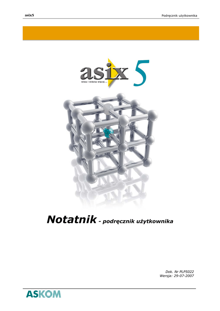 asix5 Podręcznik użytkownika Notatnik - podręcznik użytkownika Dok. Nr PLP5022 Wersja: 29-07-2007 asix5 Podręcznik użytkownika ASKOM® i asix™ to zastrzeżone znaki firmy ASKOM Sp. z o. o., Gliwice. Inne występujące w tekście znaki firmowe bądź towarowe są zastrzeżonymi znakami ich właścicieli. Wszelkie prawa zastrzeżone. Nieautoryzowane rozpowszechnianie całości lub fragmentu niniejszej publikacji w jakiejkolwiek postaci jest zabronione. Wykonywanie kopii metodą kserograficzną, fotograficzną lub inną powoduje naruszenie praw autorskich niniejszej publikacji. ASKOM Sp. z o. o. nie bierze żadnej odpowiedzialności za jakiekolwiek szkody wynikłe z wykorzystywania zawartych w publikacji treści. Copyright © 2007, ASKOM Sp. z o. o., Gliwice ASKOM Sp. z o. o., ul. Józefa Sowińskiego 13, 44-121 Gliwice, tel. +48 (0) 32 3018100, fax +48 (0) 32 3018101, http://www.askom.com.pl, e-mail: [email protected] asix5 1. Notatnik Dyspozytorski Opis programu 1.1. Opis programu Notatnik Dyspozytorski Notatnik Dyspozytorski jest programem ułatwiającym dyspozytorom prowadzenie rejestru notatek. Przede wszystkim zastępuje on tradycyjny zeszyt w kratkę przewyższając go jednocześnie takimi cechami jak możliwość poprawiania notatek (oczywiście tylko wprowadzonych przez samego autora), automatyczne numerowanie notatek, opatrywanie ich datą, czasem utworzenia oraz nazwą autora. Cechy programu Notatnik Dyspozytorski, które są niedostępne w tradycyjnym notatniku to szybkie odnajdywanie notatek, wyszukiwanie notatek spełniających zadane kryteria oraz tworzenie z bazy notatek raportów. 1.2. Pierwsze uruchomienie - utworzenie bazy użytkowników Pierwsze uruchomienie programu Notatnik Dyspozytorski powinien wykonywać lokalny administrator. Przy pierwszym uruchomieniu program tworzy pustą bazy notatek i pustą bazę użytkowników. Następnie wyświetla okienko Panel Administratora umożliwiając administratorowi utworzenie kont użytkowników uprawnionych do korzystania z programu. Przy pierwszym uruchomieniu programu hasło administratora jest puste. 1.3. Główne okno programu Główne okno programu Notatnik Dyspozytorski składa się z belki tytułowej okna, menu, paska narzędzi panelu edycji notatki, samego panelu edycji notatki, pasku narzędzi bazy notatek, panelu bazy notatek oraz paska statusu. ©ASKOM, Gliwice Lipiec 2007 1 Notatnik Dyspozytorski asix5 Belka tytułowa okna zawiera nazwę zalogowanego dyspozytora. Pasek statusu zawiera aktualną datę i czas oraz liczbę notatek znajdujących się w bazie notatek. Umieszczenie kursora myszy nad dowolnym elementem okna głównego powoduje wyświetlenie krótkiej podpowiedzi objaśniającej jego funkcję. Podobnie dzieje się w oknach dialogowych programu. 1.4. Wprowadzenie pierwszej notatki Po uruchomieniu programu Notatnik Dyspozytorski wyświetlane jest okienko z listą zdefiniowanych dyspozytorów. Należy podświetlić nazwę jednego z dyspozytorów używając klawiszy strzałek, wybrać nazwę naciskając klawisz Enter, podać hasło wybranego dyspozytora i ponownie nacisnąć Enter. Pojawia się główne okno i program jest gotowy do wprowadzania notatek. Aby wprowadzić notatkę należy z menu Notatka wybrać polecenie Nowa albo nacisnąć klawisze Ctrl-N. Tworzona jest nowa, pusta notatka, a kursor znajduje się w polu zawierającym godzinę utworzenia notatki. Można zmodyfikować godzinę lub od razu nacisnąć przycisk Tab aby przejść do następnego pola o nazwie Ważna. Jeśli to pole jest zaznaczone to notatka jest traktowana jako ważna. Ważne notatki są wyświetlane i drukowane czcionką pogrubioną. Aby zaznaczyć, że notatka jest ważna należy nacisnąć przycisk Spacja. Ponownie naciskając klawisz Tab znajdziemy się w polu edycji notatki. Należy teraz wprowadzić treść notatki. Po zakończeniu wprowadzania treści notatki należy notatkę 2 Lipiec 2007 ©ASKOM, Gliwice asix5 Notatnik Dyspozytorski zapisać. Aby to zrobić należy z menu Notatka wybrać polecenie Zachowaj albo nacisnąć klawisze Ctrl-S. Notatka znika z panelu wprowadzania notatek i pojawia się w panelu bazy notatek. W ten sposób zakończono wprowadzanie pierwszej notatki. 2. Funkcje dostępne w programie 2.1. Zalogowanie dyspozytora Aby dyspozytor mógł wprowadzać nowe notatki musi się przedstawić czyli zalogować. Po uruchomieniu programu pierwszym wyświetlanym oknem jest okno wyboru dyspozytora. Okno to można również wywołać z głównego okna programu klikając myszką na pierwszy przycisk paska narzędzi lub wybierając z menu Dyspozytor polecenie Zaloguj. Okno wyboru dyspozytora zawiera listę zdefiniowanych przez Administratora dyspozytorów. Dyspozytora można wybrać używając myszki lub przesuwając podświetlenie dyspozytora za pomocą klawiszy strzałek w górę i w dół. Aby zatwierdzić wybór dyspozytora należy kliknąć myszką przycisk OK lub nacisnąć klawisz Enter. Pojawia się wtedy okno, w którym należy wprowadzić hasło wybranego dyspozytora. ©ASKOM, Gliwice Lipiec 2007 3 Notatnik Dyspozytorski asix5 Podczas wprowadzaniu hasła, dla bezpieczeństwa, w oknie nie pojawia się samo hasło lecz gwiazdki. Po wprowadzeniu hasła należy kliknąć myszką przycisk OK lub nacisnąć klawisz Enter. Aby zrezygnować z logowania się należy w oknie wyboru dyspozytora kliknąć myszką przycisk Anuluj lub nacisnąć klawisz Esc. Okno wyboru dyspozytora umożliwia również zmianę hasła dyspozytora. Aby zmienić hasło należy w oknie wyboru dyspozytora kliknąć myszką przycisk Zmiana hasła lub nacisnąć klawisze Alt-Z. Pojawia się okienko zmiany hasła: Należy wprowadzić stare hasło dyspozytora i nowe hasło. Nowe hasło musi być wprowadzone dwukrotnie, aby wykluczyć możliwość pomyłki. Po wprowadzeniu haseł należy kliknąć myszką przycisk OK lub nacisnąć klawisz Enter. 2.2. Wylogowanie dyspozytora Dyspozytor, aby się wylogować z programu, może kliknąć myszką dr