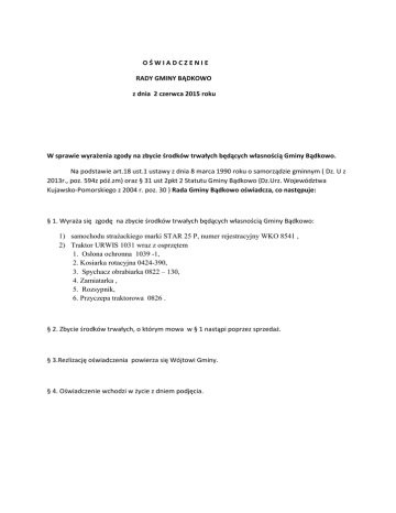 OŚWIADCZENIE RADY GMINY BĄDKOWO z dnia 2 czerwca 2015 roku W sprawie wyrażenia zgody na zbycie środków trwałych będących własnością Gminy Bądkowo. Na podstawie art.18 ust.1 ustawy z dnia 8 marca 1990 roku o samorządzie gminnym ( Dz. U z 2013r., poz. 594z póź.zm) oraz § 31 ust 2pkt 2 Statutu Gminy Bądkowo (Dz.Urz. Województwa Kujawsko-Pomorskiego z 2004 r. poz. 30 ) Rada Gminy Bądkowo oświadcza, co następuje: § 1. Wyraża się zgodę na zbycie środków trwałych będących własnością Gminy Bądkowo: 1) samochodu strażackiego marki STAR 25 P, numer rejestracyjny WKO 8541 , 2) Traktor URWIS 1031 wraz z osprzętem 1. Osłona ochronna 1039 -1, 2. Kosiarka rotacyjna 0424-390, 3. Spychacz obrabiarka 0822 – 130, 4. Zamiatarka , 5. Rozsypnik, 6. Przyczepa traktorowa 0826 . § 2. Zbycie środków trwałych, o którym mowa w § 1 nastąpi poprzez sprzedaż. § 3.Rezlizację oświadczenia powierza się Wójtowi Gminy. § 4. Oświadczenie wchodzi w życie z dniem podjęcia.