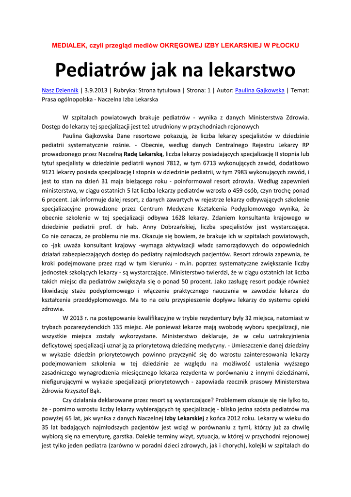 MEDIALEK, czyli przegląd mediów OKRĘGOWEJ IZBY LEKARSKIEJ W PŁOCKU Pediatrów jak na lekarstwo Nasz Dziennik | 3.9.2013 | Rubryka: Strona tytułowa | Strona: 1 | Autor: Paulina Gajkowska | Temat: Prasa ogólnopolska - Naczelna Izba Lekarska W szpitalach powiatowych brakuje pediatrów - wynika z danych Ministerstwa Zdrowia. Dostęp do lekarzy tej specjalizacji jest też utrudniony w przychodniach rejonowych Paulina Gajkowska Dane resortowe pokazują, że liczba lekarzy specjalistów w dziedzinie pediatrii systematycznie rośnie. - Obecnie, według danych Centralnego Rejestru Lekarzy RP prowadzonego przez Naczelną Radę Lekarską, liczba lekarzy posiadających specjalizację II stopnia lub tytuł specjalisty w dziedzinie pediatrii wynosi 7812, w tym 6713 wykonujących zawód, dodatkowo 9121 lekarzy posiada specjalizację I stopnia w dziedzinie pediatrii, w tym 7983 wykonujących zawód, i jest to stan na dzień 31 maja bieżącego roku - poinformował resort zdrowia. Według zapewnień ministerstwa, w ciągu ostatnich 5 lat liczba lekarzy pediatrów wzrosła o 459 osób, czyn trochę ponad 6 procent. Jak informuje dalej resort, z danych zawartych w rejestrze lekarzy odbywających szkolenie specjalizacyjne prowadzone przez Centrum Medyczne Kształcenia Podyplomowego wynika, że obecnie szkolenie w tej specjalizacji odbywa 1628 lekarzy. Zdaniem konsultanta krajowego w dziedzinie pediatrii prof. dr hab. Anny Dobrzańskiej, liczba specjalistów jest wystarczająca. Co nie oznacza, że problemu nie ma. Okazuje się bowiem, że brakuje ich w szpitalach powiatowych, co -jak uważa konsultant krajowy -wymaga aktywizacji władz samorządowych do odpowiednich działań zabezpieczających dostęp do pediatry najmłodszych pacjentów. Resort zdrowia zapewnia, że kroki podejmowane przez rząd w tym kierunku - m.in. poprzez systematyczne zwiększanie liczby jednostek szkolących lekarzy - są wystarczające. Ministerstwo twierdzi, że w ciągu ostatnich lat liczba takich miejsc dla pediatrów zwiększyła się o ponad 50 procent. Jako zasługę resort podaje również likwidację stażu podyplomowego i włączenie praktycznego nauczania w zawodzie lekarza do kształcenia przeddyplomowego. Ma to na celu przyspieszenie dopływu lekarzy do systemu opieki zdrowia. W 2013 r. na postępowanie kwalifikacyjne w trybie rezydentury były 32 miejsca, natomiast w trybach pozarezydenckich 135 miejsc. Ale ponieważ lekarze mają swobodę wyboru specjalizacji, nie wszystkie miejsca zostały wykorzystane. Ministerstwo deklaruje, że w celu uatrakcyjnienia deficytowej specjalizacji uznał ją za priorytetową dziedzinę medycyny. - Umieszczenie danej dziedziny w wykazie dziedzin priorytetowych powinno przyczynić się do wzrostu zainteresowania lekarzy podejmowaniem szkolenia w tej dziedzinie ze względu na możliwość ustalenia wyższego zasadniczego wynagrodzenia miesięcznego lekarza rezydenta w porównaniu z innymi dziedzinami, niefigurującymi w wykazie specjalizacji priorytetowych - zapowiada rzecznik prasowy Ministerstwa Zdrowia Krzysztof Bąk. Czy działania deklarowane przez resort są wystarczające? Problemem okazuje się nie lylko to, że - pomimo wzrostu liczby lekarzy wybierających tę specjalizację - blisko jedna szósta pediatrów ma powyżej 65 lat, jak wynika z danych Naczelnej Izby Lekarskiej z końca 2012 roku. Lekarzy w wieku do 35 lat badających najmłodszych pacjentów jest wciąż w porównaniu z tymi, którzy już za chwilę wybiorą się na emeryturę, garstka. Dalekie terminy wizyt, sytuacja, w której w przychodni rejonowej jest tylko jeden pediatra (zarówno w poradni dzieci zdrowych, jak i chorych), kolejki w szpitalach do specjalisty to codzienność wielu rodziców borykających się z brakiem dostępu do lekarza, a Dokończenie ze s. 1 Problemem - również w dużych miastach -jest wyznaczenie w miarę rozsądnego terminu wizyty (nawet dla osób mających skierowanie) do pediatry specjalisty, np. neurologa. Nierzadko okazuje się również, że nawet po odstaniu w kolejce kilku godzin dla chorego dziecka nie ma już numerka, ponieważ w placówce jest tylko jeden pediatra. - Przy rutynowych kontrolach nie mamy zazwyczaj problemu, trzeba się zapisywać z wyprzedzeniem. Ale gdy dziecko choruje, sytuacja staje się uciążliwa. Trzeba rano stać w bardzo długiej kolejce do lekarza, który przyjmuje zaledwie kilka godzin. Zapisy do pediatry powinny być ułatwione. Gdy dziecko gorączkuje, nie sposób go zostawić, żeby stać w kolejce - mówi Natalia Stępień z Warszawy, mama 3-letniej Helenki. - Dziura pokoleniowa, jeśli chodzi o lekarzy pediatrów, jest przeogromna. Dziś, podejrzewam, każdy rodzic ma mniejszy lub większy problem z dostaniem się do tego specjalisty. Coraz częściej jedynym rozwiązaniem jest wybranie prywatnej poradni, co oczywiście wiąże się z niemałymi kosztami. Stan zdrowia dzieci i młodzieży wcale się nie poprawia. Oddziały dziecięce w szpitalach pękają w szwach. Zadowolenie z własnych działań jest czymś typowym dla obecnego rządu. Nie zmienia to jednak faktu, że problem z ustaleniem terminu wizyty - zwłaszcza u specjalisty, co już graniczy niemal ż cudem -jest bardzo poważny i kosztuje zdrowie, a czasem i życie najmłodszych pacjentów - zauważa senator Bolesław Piecha (PiS), były minister zdrowia. Jego zdaniem, odwlekanie przez resort zdrowia uznania pediatrii za dziedzinę deficytową obecnie również pociąga za sobą skutki. Na realia przyjmowania jednego dnia kilkudziesięciu małych pacjentów skarżą się sami lekarze. Pani Ewa z Warszawy studia medyczne skończyła już prawie ćwierć wieku temu. Mimo że w przychodni, w której pracuje, są jeszcze dwie lekarki, to problemy kadrowe dają się we znaki. - Jedna z nas pracuje jeszcze dodatkowo w poradni rodzinnej w przychodni dla dorosłych, co powoduje, że jest tylko jeden dzień w tygodniu w poradni dziecięcej i nie w pełnym wymiarze. Fizycznie nie mamy moż