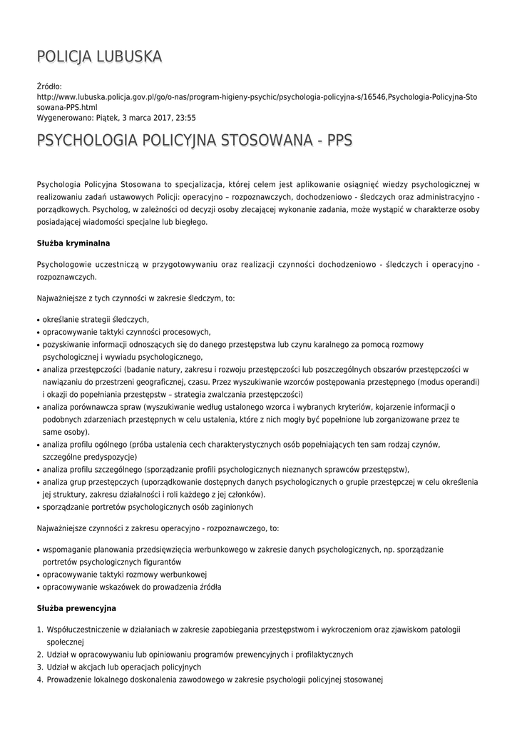 POLICJA LUBUSKA Źródło: http://www.lubuska.policja.gov.pl/go/o-nas/program-higieny-psychic/psychologia-policyjna-s/16546,Psychologia-Policyjna-Sto sowana-PPS.html Wygenerowano: Piątek, 3 marca 2017, 23:55 PSYCHOLOGIA POLICYJNA STOSOWANA - PPS Psychologia Policyjna Stosowana to specjalizacja, której celem jest aplikowanie osiągnięć wiedzy psychologicznej w realizowaniu zadań ustawowych Policji: operacyjno – rozpoznawczych, dochodzeniowo - śledczych oraz administracyjno porządkowych. Psycholog, w zależności od decyzji osoby zlecającej wykonanie zadania, może wystąpić w charakterze osoby posiadającej wiadomości specjalne lub biegłego. Służba kryminalna Psychologowie uczestniczą w przygotowywaniu oraz realizacji czynności dochodzeniowo - śledczych i operacyjno rozpoznawczych. Najważniejsze z tych czynności w zakresie śledczym, to: ● określanie strategii śledczych, ● opracowywanie taktyki czynności procesowych, ● pozyskiwanie informacji odnoszących się do danego przestępstwa lub czynu karalnego za pomocą rozmowy psychologicznej i wywiadu psychologicznego, ● analiza przestępczości (badanie natury, zakresu i rozwoju przestępczości lub poszczególnych obszarów przestępczości w nawiązaniu do przestrzeni geograficznej, czasu. Przez wyszukiwanie wzorców postępowania przestępnego (modus operandi) i okazji do popełniania przestępstw – strategia zwalczania przestępczości) ● analiza porównawcza spraw (wyszukiwanie według ustalonego wzorca i wybranych kryteriów, kojarzenie informacji o podobnych zdarzeniach przestępnych w celu ustalenia, które z nich mogły być popełnione lub zorganizowane przez te same osoby). ● analiza profilu ogólnego (próba ustalenia cech charakterystycznych osób popełniających ten sam rodzaj czynów, szczególne predyspozycje) ● analiza profilu szczególnego (sporządzanie profili psychologicznych nieznanych sprawców przestępstw), ● analiza grup przestępczych (uporządkowanie dostępnych danych psychologicznych o grupie przestępczej w celu określenia jej struktury, zakresu działalności i roli każdego z jej członków). ● sporządzanie portretów psychologicznych osób zaginionych Najważniejsze czynności z zakresu operacyjno - rozpoznawczego, to: ● wspomaganie planowania przedsięwzięcia werbunkowego w zakresie danych psychologicznych, np. sporządzanie portretów psychologicznych figurantów ● opracowywanie taktyki rozmowy werbunkowej ● opracowywanie wskazówek do prowadzenia źródła Służba prewencyjna 1. Współuczestniczenie w działaniach w zakresie zapobiegania przestępstwom i wykroczeniom oraz zjawiskom patologii społecznej 2. Udział w opracowywaniu lub opiniowaniu programów prewencyjnych i profilaktycznych 3. Udział w akcjach lub operacjach policyjnych 4. Prowadzenie lokalnego doskonalenia zawodowego w zakresie psychologii policyjnej stosowanej Ocena: 0/5 (0) Tweetnij