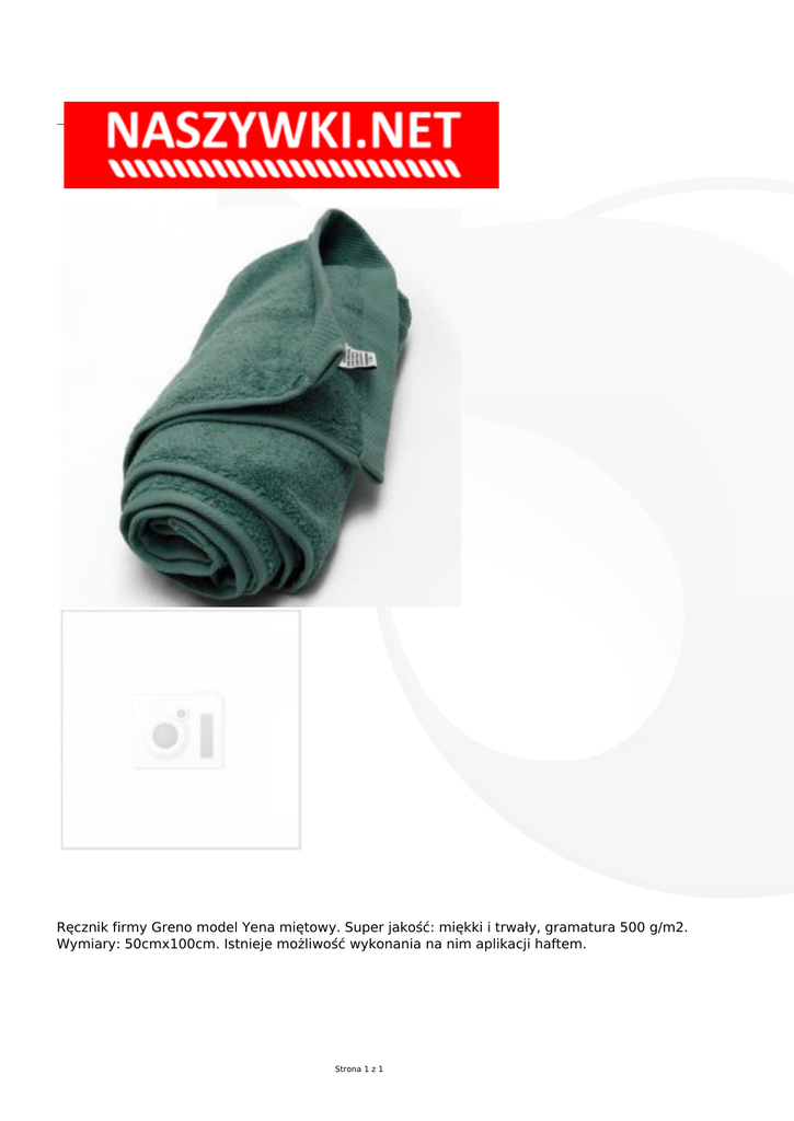 Ręcznik firmy Greno model Yena miętowy. Super jakość: miękki i trwały, gramatura 500 g/m2. Wymiary: 50cmx100cm. Istnieje możliwość wykonania na nim aplikacji haftem. Strona 1 z 1