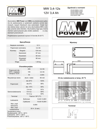 MW 3,4-12s 12V 3,4 Ah Zgodność z normami PN-EN 60896-21:2007 PN-EN 60896-22:2007 PN-EN 61056-1:2008 PN-EN 61056-2:2003(U) PN-E-83016:1999 Akumulatory MW Power serii MW-s są dedykowane głównie do zastosowania w systemach zasilania central alarmowych, kasach fiskalnych oraz automatyki. Dzięki bardzo dobrej relacji jakości do ceny akumulatory MW-s zdobyły uznanie wielu klientów. Akumulatory tego typu można również wykorzystywać jako źródło zasilania w urządzeniach przenośnych. Projektowana żywotność wynosi 3-5 lat dla 20-25 oC Specyfikacja Napięcie nominalne 12 V Pojemność nominalna Wymiary Wymiary 3,4 Ah Długość 134 mm Szerokość 67 mm Wysokość 60 mm Wysokość całkowita Waga 66 mm 1,30 kg Charakterystyka Pojemność dla 25oC i napięcia odcięcia 10,5V Rezystancja wewn. Pojemność Samorozładowanie Terminal Ładowanie 20h 3,4 Ah 10h 3,0 Ah 5h 2,6Ah akum. naład. 46 mΩ dla 20oC 100% dla 0oC 85% dla -15oC 65% 3 m-ce 6 m-cy 91% 82% 12 m-cy 64% Ch-ka rozładowania w temp. 25 oC Fast-on 187 (T1) Buforowe 13,50-13,80V Cykliczne 14,40-15,00V Max. prąd 0,95A ładowania Max. prąd 35 A (5 sek.) rozładowania Temperatury pracy: Rozładowanie: -20°C ÷ 50°C Ładowanie: -20°C ÷ 50°C Przechowywanie: -20°C ÷ 50°C Terminal