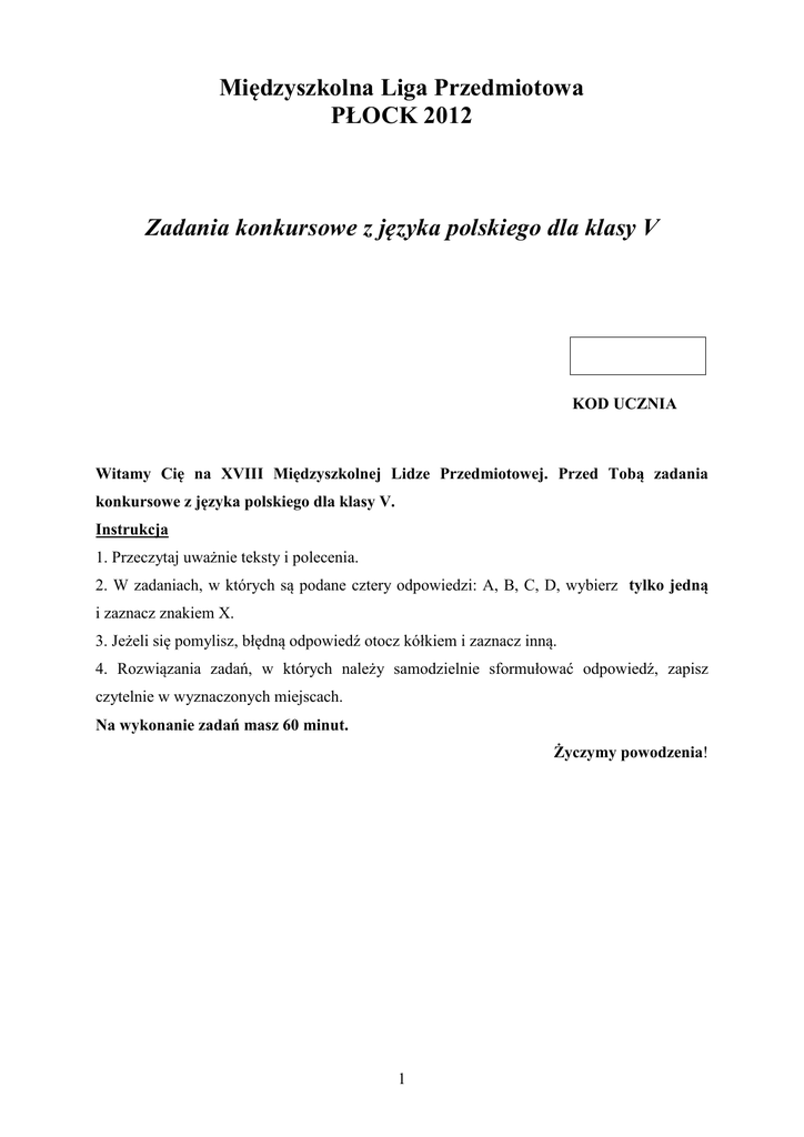 Międzyszkolna Liga Przedmiotowa PŁOCK 2012 Zadania konkursowe z języka polskiego dla klasy V KOD UCZNIA Witamy Cię na XVIII Międzyszkolnej Lidze Przedmiotowej. Przed Tobą zadania konkursowe z języka polskiego dla klasy V. Instrukcja 1. Przeczytaj uważnie teksty i polecenia. 2. W zadaniach, w których są podane cztery odpowiedzi: A, B, C, D, wybierz tylko jedną i zaznacz znakiem X. 3. Jeżeli się pomylisz, błędną odpowiedź otocz kółkiem i zaznacz inną. 4. Rozwiązania zadań, w których należy samodzielnie sformułować odpowiedź, zapisz czytelnie w wyznaczonych miejscach. Na wykonanie zadań masz 60 minut. Życzymy powodzenia! 1 Przeczytaj tekst i wykonaj zadania 1. – 8. Czesław Miłosz Odbicia Mrówka zdeptana a nad nią obłoki. Zdeptana mrówka a nad nią kolumna błękitu. A w dali znaczy niebieskie swe kroki Wisła czy Dniepr na łożu z granitu. Taki obraz odbija się w wodzie: Miasto zburzone a nad nim obłoki. Zburzone miasto a nad nim kolumna błękitu. A w dali mija niebieskie swe progi Dziejów ostatek, albo wiosna mitu. Mysz polna martwa i żuki-grabarze Na ścieżce, którą biegnie radość siedmioletnia. W ogrodzie tęcza piłki, roześmiane twarze I żółty pada blask maja albo kwietnia. Taki obraz odbija się w wodzie: Plemię pobite, pancerni grabarze, Drogami biegnie radość tysiącletnia. Pole bławatków kwitnie po pożarze I cisza jest niebieska, powszednia. Taki obraz odbija się w wodzie. Czesław Miłosz, Wiersze, Kraków 1987, s.202. Zadanie 1. (0-1) Odbicia są opisane A. w pierwszej i ostatniej zwrotce. B. w drugiej i czwartej zwrotce. C. tylko w czwartej zwrotce. D. w drugiej i trzeciej zwrotce. Zadanie 2. (0-1) W wierszu występuje kontrast. W którym wersie jest on widoczny? A. „Taki obraz odbija się w wodzie”. B. „Drogami biegnie radość siedmioletnia”. C. „Zburzone miasto a nad nim kolumna błękitu”. D. „I żółty pada blask maja albo kwietnia”. Zadanie 3. (0-1) Wiersz Odbicia uświadamia, że A. na wodzie można obserwować lustrzane odbicia. B. dzieci są zajęte wyłącznie zabawami. C. radość ma przewagę nad tragicznymi wydarzeniami. D. nikt nie zwraca uwagi na martwe zwierzęta. 2 Zadanie 4. (0-1) Z ostatniej strofki wypisz dwa wyrażenia z epitetem. W każdym wyrażeniu podkreśl epitet. 1) ………………………………………………………………………………………………. 2) ………………………………………………………………………………………………. Zadanie 5. (0-2) Podaj przykład 1) uosobienia:…………………………………………………………………………………. 2) przenośni: ………………………………………………………………………………….. Zadanie 6. (0-1) Układ rymów w wierszu przedstawia się następująco: A. aabb. B. abab. C. abba. D. ababcc. Zadanie 7. (0-1) W każdej zwrotce występuje rym A. parzysty, męski, dokładny. B. okalający, żeński, niedokładny. C. nieregularny, żeński, niedokładny. D. przeplatany (krzyżowy), żeński, dokładny. Zadanie 8. (0-6) Opisz swoje odbicie w lustrze. Twoja praca powinna zająć przynajmniej 10 linijek. …………………………………………………………………………………… …………………………………………………………………………………… …………………………………………………………………………………… …………………………………………………………………………………… …………………………………………………………………………………… …………………………………………………………………………………… …………………………………………………………………………………… …………………………………………………………………………………… …………………………………………………………………………………… …………………………………………………………………………………… …………………………………………………………………………………… …………………………………………………………………………………… 3 …………………………………………………………………………………… …………………………………………………………………………………… …………………………………………………………………………………… …………………………………………………………………………………… ………………………………………………………………………………......... ................................................................................................................................. ................................................................................................................................. ................................................................................................................................. ................................................................................................................................. ................................................................................................................................. ................................................................................................................................. ................................................................................................................................. ................................................................................................................................. ..........................................................................................