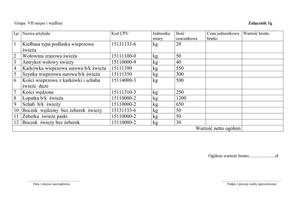 Grupa VII mięso i wędliny Załącznik 1g Lp. Nazwa artykułu Kod CPV Jednostka miary Ilość szacunkowa Kiełbasa typu podlaska wieprzowa świeża 2 Wołowina zrazowa świeża 3 Antrykot wołowy świezy 4 Karkówka wieprzowa surowa b/k świeża 5 Szynka wieprzowa surowa b/k świeża 6 Kości wieprzowe z karkówki i schabu świeże duże 7 Kości wędzone 8 Łopatka b/k świeża 9 Schab b/k świeży 10 Boczek wędzony bez żeberek świeży 11 Żeberka świeże paski 12 Boczek świeży bez żeberek 15131133-6 kg 20 15111100-0 15110000-9 15111390 15111350 15114000-3 kg kg kg kg kg 50 40 550 300 500 15111310-3 15110000-2 15110000-2 15131133-6 15110000-2 15110000-2 kg kg kg. kg kg kg 250 1200 650 50 50 30 1 Cena jednostkowa Wartość brutto brutto Wartość netto ogółem Ogółem wartość brutto........................zł ................................................................ Data i miejsce sporządzenia ......................................................................... Podpis i pieczęć osoby upoważnionej