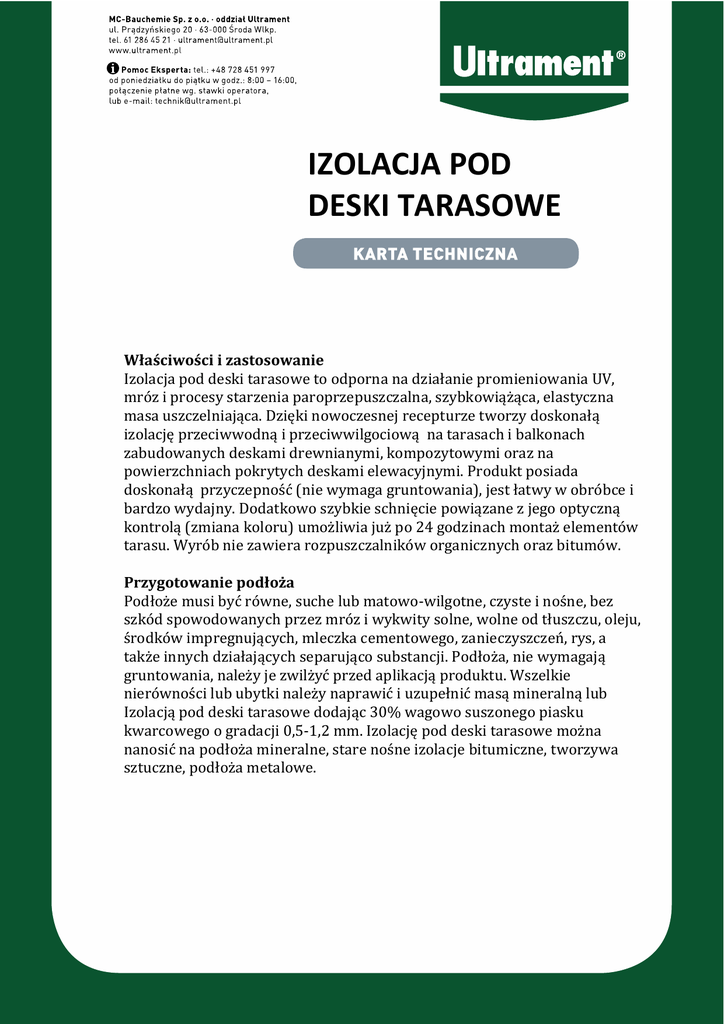 IZOLACJA POD DESKI TARASOWE Właściwości i zastosowanie Izolacja pod deski tarasowe to odporna na działanie promieniowania UV, mróz i procesy starzenia paroprzepuszczalna, szybkowiążąca, elastyczna masa uszczelniająca. Dzięki nowoczesnej recepturze tworzy doskonałą izolację przeciwwodną i przeciwwilgociową na tarasach i balkonach zabudowanych deskami drewnianymi, kompozytowymi oraz na powierzchniach pokrytych deskami elewacyjnymi. Produkt posiada doskonałą przyczepność (nie wymaga gruntowania), jest łatwy w obróbce i bardzo wydajny. Dodatkowo szybkie schnięcie powiązane z jego optyczną kontrolą (zmiana koloru) umożliwia już po 24 godzinach montaż elementów tarasu. Wyrób nie zawiera rozpuszczalników organicznych oraz bitumów. Przygotowanie podłoża Podłoże musi być równe, suche lub matowo-wilgotne, czyste i nośne, bez szkód spowodowanych przez mróz i wykwity solne, wolne od tłuszczu, oleju, środków impregnujących, mleczka cementowego, zanieczyszczeń, rys, a także innych działających separująco substancji. Podłoża, nie wymagają gruntowania, należy je zwilżyć przed aplikacją produktu. Wszelkie nierówności lub ubytki należy naprawić i uzupełnić masą mineralną lub Izolacją pod deski tarasowe dodając 30% wagowo suszonego piasku kwarcowego o gradacji 0,5-1,2 mm. Izolację pod deski tarasowe można nanosić na podłoża mineralne, stare nośne izolacje bitumiczne, tworzywa sztuczne, podłoża metalowe. Obróbka Izolacja pod deski tarasowe dostarczana jest w pojemniku, w którym znajdują się dwa odpowiednio odmierzone komponenty. Do pustego pojemnika należy wlać komponent płynny, a następnie wsypać komponent proszkowy. Mieszać ok. 2 minuty, aż powstanie masa o jednorodnej konsystencji, bez grudek. Do mieszania wykorzystywać mieszadło wolnoobrotowe. Po czasie dojrzewania wynoszącym 2 minuty jeszcze raz krótko zamieszać przygotowana masę. Na podłoże materiał nanosimy przy pomocy pacy. Przed nałożeniem pierwszej warstwy należy wykonać warstwę kontaktową poprzez szpachlowanie drapane- wypełniające. Izolację pod deski tarasowe nanosi się minimum w dwóch warstwach pędzlem, pacą lub przy użyciu urządzenia natryskowego. W przypadku izolacji przeciwwilgociowej druga warstwę można nanosić metodą świeże na świeże, w przypadku izolacji wodochronnej, zanim przystąpi się do nakładania drugiej warstwy, poprzednia musi być na tyle wyschnięta, aby nie uszkodzić jej przy nakładaniu kolejnej. Wtopienie siatki nie jest wymagane. Przejścia delatycyjne, połączenia powierzchni pionowych i poziomych, połączenia z obróbką blacharską należy przeprowadzać przy użyciu Taśmy Uszczelniającej Ultrament. Taśmę należy przeszpachlować podczas wykonywania drugiej warstwy. Proces schnięcia Izolacji pod deski tarasowe można uznać za zakończony gdy kolor w stanie świeżym jasno szary zmieni się w ciemnoszary. Wskazówki Układanie desek tarasowych powinno odbywać się po 24 godzinach metodą podłogi pływającej. Należy zwrócić szczególną uwagę na to, aby nie przewiercać mechanicznie położonej wcześniej Izolacji pod deski tarasowe. Legary powinny być układane na podkładkach dystansowych z tworzywa sztucznego aby nie uszkodzić mechanicznie izolacji. Wszystkie podane parametry odnoszą się do temperatury +23ºC i 50% wilgotności względnej powietrza. Wyższe temperatury i niższa wilgotność przyspieszają, a niższe temperatury i wyższa wilgotność spowalniają przebieg procesu wiązania. Prace należy prowadzić zgodnie ze sztuką budowlaną i zachowaniem zasad BHP. Prace prowadzić starannie, aby uniknąć nieszczelności. Izolacja pod deski tarasowe może być użyta do wykonywania izolacji w miejscach stale narażonych na obciążenie wodą takich jak oczka wodne i baseny. Nie obrabiać przy temperaturze podłoża i otoczenia niższej niż +5ºC oraz wilgotności wyższej niż 80%. Rodzaj izolacji: Izolacja przeciwwodna: spiętrzająca się woda infiltracyjna / woda pod ciśnieniem: w stanie mokrym - grubość warstwy 2,8 mm w stanie suchym - grubość warstwy 2,5 mm Zużycie: 3,3 kg/m² wszystkie warstwy. Szpachlowanie wypełniające Zużycie: 0,5-1,2 kg/m² 1,65 kg/m2 na jedną warstwę w zależności od podłoża. Tabela przeglądowa Izolacji pod deski tarasowe Baza materiałowa Dyspersja tworzyw sztucznych, cement, dodatki Konsystencja Kolor Gęstość Sd- Współczynnik Sucha warstwa: 2,0 mm 2,5 mm Pasta Szary ~ 1,18 kg/dm³ Max.grubość w stanie momokrym Odporność na deszcz Odporność na ściskanie Czas obróbki Mocowanie płyt ochronnych i termoizolacji Obciążenie mechaniczne Temperatura obróbki I podłoża Czyszczenie Czyszczenie Przechowywanie 20 mm Po 3 godzinach 3 N/mm² ~ 45 Minut Po 4 godzinach Opakowanie 8 kg- Wiadro 4 kg Komponent płynny (A) 4 kg Komponent proszkowy (B) Proporcja mieszania 1:1 ~ 40 m ~ 50 m Po 24 godzinach 0d +50 C do + 300 C Woda w stanie świeżym Mechanicznie w stanie suchym W suchym i chłodnym miejscu , chronić przed mrozem 12 miesięcy w oryginalnie zamkniętym opakowaniu UWAGA: Zawarte w karcie technicznej dane są wynikiem naszego doświadczenia zdobytego w oparciu o jak najbardziej rzetelną wiedzę, nie mniej nie są one wiążące. Dane te powinny zostać określone każdorazowo w oparciu o cechy charakterystyczne danego obiektu budowlanego, zastosowanie i specyficzne lokalne wymagania. Uwzględniając to założenie ponosimy odpowiedzialność za prawidłowość podanych danych w ramach naszych warunków sprzedaży i dostawy. Zalecenia odbiegające od zaleceń podanych w treści karty technicznej są jedynie wiążące, jeśli zostały podane na piśmie przez naszych pracowników. Wszystkie wskazówki techniczne dotyczące zastosowań odpowiadają aktualnemu stanowi wiedzy. Nr karty technicznej TM 01/2016/001 (stan na dzień 25.03.2016). Niniejszy druk został aktualizowany pod względem technicznym. Wraz z opublikowaniem te