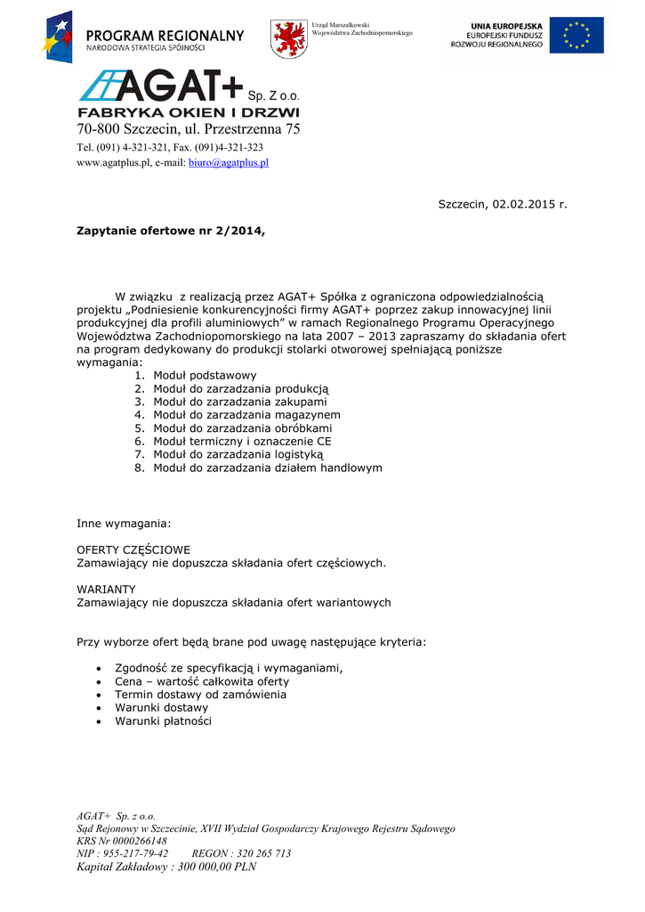 Urząd Marszałkowski Województwa Zachodniopomorskiego 70-800 Szczecin, ul. Przestrzenna 75 Tel. (091) 4-321-321, Fax. (091)4-321-323 www.agatplus.pl, e-mail: [email protected] Szczecin, 02.02.2015 r. Zapytanie ofertowe nr 2/2014, W związku z realizacją przez AGAT+ Spółka z ograniczona odpowiedzialnością projektu „Podniesienie konkurencyjności firmy AGAT+ poprzez zakup innowacyjnej linii produkcyjnej dla profili aluminiowych” w ramach Regionalnego Programu Operacyjnego Województwa Zachodniopomorskiego na lata 2007 – 2013 zapraszamy do składania ofert na program dedykowany do produkcji stolarki otworowej spełniającą poniższe wymagania: 1. Moduł podstawowy 2. Moduł do zarzadzania produkcją 3. Moduł do zarzadzania zakupami 4. Moduł do zarzadzania magazynem 5. Moduł do zarzadzania obróbkami 6. Moduł termiczny i oznaczenie CE 7. Moduł do zarzadzania logistyką 8. Moduł do zarzadzania działem handlowym Inne wymagania: OFERTY CZĘŚCIOWE Zamawiający nie dopuszcza składania ofert częściowych. WARIANTY Zamawiający nie dopuszcza składania ofert wariantowych Przy wyborze ofert będą brane pod uwagę następujące kryteria: Zgodność ze specyfikacją i wymaganiami, Cena – wartość całkowita oferty Termin dostawy od zamówienia Warunki dostawy Warunki płatności AGAT+ Sp. z o.o. Sąd Rejonowy w Szczecinie, XVII Wydział Gospodarczy Krajowego Rejestru Sądowego KRS Nr 0000266148 NIP : 955-217-79-42 REGON : 320 265 713 Kapitał Zakładowy : 300 000,00 PLN Urząd Marszałkowski Województwa Zachodniopomorskiego 70-800 Szczecin, ul. Przestrzenna 75 Tel. (091) 4-321-321, Fax. (091)4-321-323 www.agatplus.pl, e-mail: [email protected] Prosimy o podanie terminu ważności oferty. Oferty prosimy składać listownie lub osobiście na adres: Agat+ Sp. z o.o. ul. Przestrzenna 75 70-800 Szczecin i pocztą elektroniczną na adres: [email protected] Na kopercie lub w tytule wiadomości elektronicznej prosimy o podanie informacji „Konkurs ofert” Ostateczny termin składania ofert ubiega w dniu 11.02.2015 r. Oferty złożone po tym dniu nie będą brane pod uwagę przy ocenie ofert. AGAT+ Sp. z o.o. Sąd Rejonowy w Szczecinie, XVII Wydział Gospodarczy Krajowego Rejestru Sądowego KRS Nr 0000266148 NIP : 955-217-79-42 REGON : 320 265 713 Kapitał Zakładowy : 300 000,00 PLN