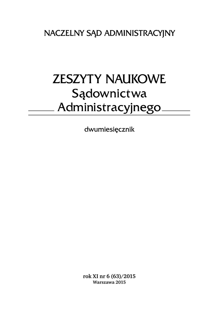 rok XI nr 6 (63)/2015 Warszawa 2015 WYDAWCA Naczelny Sąd Administracyjny KOMITET REDAKCYJNY Barbara Adamiak, Stefan Babiarz, Stanisław Biernat, Irena Chojnacka, Jan Filip, Andrzej Gomułowicz (zastępca redaktora naczelnego), Bogusław Gruszczyński, Roman Hauser, Andrzej Kisielewicz, Małgorzata Sawicka-Jezierczuk (sekretarz redakcji), Andrzej Skoczylas, Janusz Trzciński (redaktor naczelny), Maria Wiśniewska, Andrzej Wróbel Korekta: Justyna Woldańska ADRES REDAKCJI Naczelny Sąd Administracyjny 00-011 Warszawa, ul. G.P. Boduena 3/5 tel. 22 826-74-88, fax 22 826-74-54, e-mail: [email protected] © Copyright by Naczelny Sąd Administracyjny Warszawa 2015 ISSN 1734-803X Nr indeksu 204358 „Zeszyty Naukowe Sądownictwa Administracyjnego” znajdują się w wykazie czasopism punktowanych przez Ministerstwo Nauki i Szkolnictwa Wyższego na potrzeby oceny parametrycznej jednostek naukowych. Liczba punktów za publikację wynosi 6. W celu upowszechniania za granicą opracowań ukazujących się w „Zeszytach Naukowych Sądownictwa Administracyjnego” (ZNSA) Wydawca uzgodnił z redakcją „The Central European Journal of Social Sciences and Humanities” (CEJSH) internetową publikację ich streszczeń w języku angielskim. Wersją podstawową (referencyjną) czasopisma jest wersja papierowa. Wolters Kluwer SA 01-208 Warszawa, ul. Przyokopowa 33 www.wolterskluwer.pl Dyrektor Działu Czasopism: Klaudiusz Kaleta, tel. +48 604 290 764, [email protected] Sekretariat: tel. 22 535 82 03 Szczegółowe informacje o prenumeracie czasopism można uzyskać pod numerem infolinii 801 044 545, faks 22 535 80 87, [email protected] Skład i łamanie: Andytex, Warszawa Druk ukończono w grudniu 2015 roku. Nakład 1000 egz. SPIS TREŚCI Spis treści STUDIA I ARTYKUŁY Prof. dr hab. Antoni Hanusz (Uniwersytet Marii Curie-Skłodowskiej w Lublinie) Urzędowe interpretacje przepisów prawa podatkowego w Polsce oraz ich sądowoadministracyjna kontrola ......................................................................................... Summary .................................................................................................................................... 9 16 Dr Marek Mrówczyński (adiunkt, Uniwersytet Kazimierza Wielkiego w Bydgoszczy) Legitymacja skargowa w postępowaniu sądowoadministracyjnym wynikająca z ustaw szczególnych .......................................................................................................................... Summary .................................................................................................................................... 17 40 Mgr Adam Drozdek (asystent, Uniwersytet Śląski w Katowicach) Przedawnienie prawa do powiadomienia dłużnika o kwocie należności celnych powstałych w wyniku popełnienia czynu podlegającego postępowaniu karnemu skarbowemu .......................................................................................................................... Summary .................................................................................................................................... 42 53 Dr Ireneusz Nowak (adiunkt, Uniwersytet Łódzki) Dr Rafał Bucholski (adiunkt, Uniwersytet Zielonogórski) Dostęp doktorów nauk prawnych do zawodów prawniczych – wybrane problemy ............ Summary .................................................................................................................................... 54 68 VARIA Dr Tomasz Grzybowski (asystent sędziego, Naczelny Sąd Administracyjny) Między teorią a praktyką orzecznictwa sądów administracyjnych – uwagi na tle monografi i „Argument z linii orzeczniczej w orzecznictwie sądów administracyjnych” .............................................................................................................. 69 ORZECZNICTWO I. Trybunał Sprawiedliwości Unii Europejskiej (wybór i opracowanie: Andrzej Wróbel, Piotr Wróbel) Zasady równoważności i skuteczności – Powaga rzeczy osądzonej – Zwrot nienależnych kwot – Zwrot podatków pobranych przez państwo członkowskie z naruszeniem prawa Unii – Prawomocne orzeczenie sądu nakładające obowiązek zapłaty podatku niezgodnego z prawem Unii – Wniosek o wznowienie postępowania w odniesieniu do takiego orzeczenia sądu – Przepisy krajowe umożliwiające wznowienie postępowania, w świetle późniejszych wyroków Trybunału wydanych w trybie prejudycjalnym, jedynie w odniesieniu do prawomocnych orzeczeń w sprawach administracyjnych Wyrok TSUE z dnia 6 października 2015 r. w sprawie C-69/14 Dragoș Constantin Târșia przeciwko Statul român, Serviciul public comunitar regim permise de conducere și înmatriculare a autovehiculelor ........................................................................................ 79 II. III. IV. V. VI. Europejski Trybunał Praw Człowieka (wybór i opracowanie: Agnieszka Wilk-Ilewicz) Sankcje za odmowę reprezentowania strony Wyrok ETPC z dnia 27 października 2015 r. w sprawie Konstantin Stefanov przeciwko Bułgarii (skarga nr 35399/05) ......................................................................................... Trybunał Konstytucyjny (wybór: Irena Chojnacka, opracowanie: Mieszko Nowicki) 1. Wyrok TK z dnia 9 kwietnia 2015 r. (sygn. akt K 14/13)[dot. niekonstytucyjności art. 284 ust. 2 ustawy o finansach publicznych] .......................................................... 2. Wyrok TK z dnia 12 maja 2015 r. (sygn. akt P 46/13)[dot. niezgodności z Konstytucją art. 156 § 2 k.p.a. w zakresie, w jakim nie wyłącza dopuszczalności stwierdzenia nieważności decyzji wydanej z rażącym naruszeniem prawa] .................................... Sąd Najwyższy (wybór i opracowanie: Dawid Miąsik) Postanowienie SN z dnia 16 kwietnia 2015 r. (sygn. akt III SK 30/14) [dot. pytania prejudycjalnego w sprawie art. 107 Traktatu o funkcjonowaniu Unii Europejskiej] ........ Naczelny Sąd Administracyjny