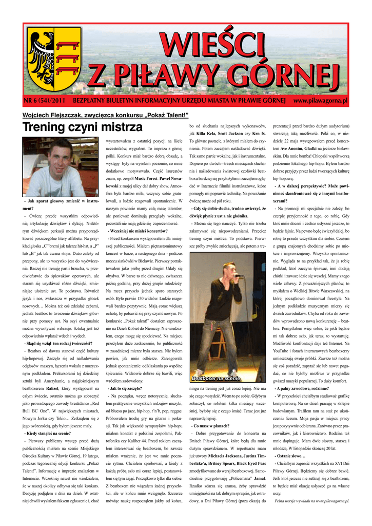 WIEŚCI Z PIŁAWY GÓRNEJ NR 6 (54)/2011 BEZPŁATNY BIULETYN INFORMACYJNY URZĘDU MIASTA W PIŁAWIE GÓRNEJ www.pilawagorna.pl Wojciech Flejszczak, zwycięzca konkursu „Pokaż Talent!” Trening czyni mistrza - Jak aparat głosowy zmienić w instrument? - Ćwiczę przede wszystkim odpowiednią artykulację dźwięków i dykcję. Niektó- bo od słuchania najlepszych wykonawców, prezentacji przed bardzo dużym audytorium) jak Killa Kela, Scott Jackson czy Krn fx. stwarzają taką możliwość. Póki co, w nie- wystartowałem z ostatniej pozycji na liście To główne postacie, z którymi miałem do czy- dzielę 22 maja występowałem przed koncer- uczestników, wygrałem. To impreza z górnej nienia. Potem zacząłem naśladować dźwięki. tem Ave Anonim, Gładki na jeziorze bielaw- półki. Konkurs miał bardzo dobrą obsadę, a Tak samo partie wokalne, jak i instrumentalne. skim. Dla mnie bomba! Chłopaki współtworzą występy były na wysokim poziomie, co mnie Dopiero po dwóch – trzech miesiącach słucha- podziemie lokalnego hip-hopu. Byłem bardzo dodatkowo motywowało. Część laureatów nia i naśladowania światowej czołówki beat- dobrze przyjęty przez ludzi tworzących kulturę znam, np. zespół Music Forest. Paweł Nowa- boxu bardziej się przyłożyłem i zacząłem oglą- hip-hopową. kowski z mojej ulicy dał dobry show. Atmos- dać w Internecie filmiki instruktażowe, które - A w dalszej perspektywie? Może powi- fera była bardzo miła, wszyscy sobie gratu- pomogły mi poprawić technikę. Na poważanie nieneś skonfrontować się z innymi beatbo- lowali, a ludzie reagowali spontanicznie. W ćwiczę może od pół roku. xerami? naszym powiecie mamy całą masę talentów, ale ponieważ dominują przeglądy wokalne, pozostali nie mają gdzie się zaprezentować. - Gdy się ciebie słucha, trudno uwierzyć, że dźwięk płynie z ust a nie głośnika. - Na promocji mi specjalnie nie zależy, bo czerpię przyjemność z tego, co robię. Gdy - Można się tego nauczyć. Tylko nie trzeba ktoś mnie doceni i zechce usłyszeć jeszcze, to rym dźwiękom perkusji można przyporząd- - Wcześniej nie miałeś koncertów? załamywać się niepowodzeniami. Przecież będzie fajnie. Na pewno będę ćwiczył dalej, bo kować poszczególne litery alfabetu. Na przy- - Przed konkursem występowałem dla mniej- trening czyni mistrza. To podstawa. Pierw- robię to przede wszystkim dla siebie. Czasem kład głoska „C” brzmi jak talerze hit-hat, a „P” szej publiczności. Miałem piętnastominutowy sze próby zwykle zniechęcają, ale potem z tre- z grupą znajomych chodzimy sobie po mie- lub „B” jak tak zwana stopa. Dużo zależy od koncert w barze, a następnego dnia - podczas ście i improwizujemy. Wszystko spontanicz- przepony, ale to wszystko jest do wyćwicze- meczu siatkówki w Bielawie. Pierwszy potrak- nie. Wygląda to na przykład tak, że ja robię nia. Raczej nie trenuję partii brzucha, w prze- towałem jako próbę przed drugim Udały się podkład, ktoś zaczyna śpiewać, inni dodają ciwieństwie do śpiewaków operowych, ale obydwa. W barze to nic dziwnego, zwłaszcza chórki i zawsze idzie się weselej. Mamy z tego staram się uzyskiwać różne dźwięki, zmie- późną godziną, przy dużej grupie młodzieży. wiele zabawy. Z poważniejszych planów, to niając ułożenie ust. To podstawa. Również Na mecz przyszło jednak sporo starszych myślałem o Wielkiej Bitwie Warszawskiej, na język i nos, zwłaszcza w przypadku głosek osób. Było prawie 150 widzów. Ludzie reago- której początkowo dominował freestyle. Na nosowych… Można też coś zdziałać zębami, wali bardzo pozytywnie. Mają coraz większą jednym podkładzie muzycznym mierzy się jednak beatbox to tworzenie dźwięków głów- ochotę, by pobawić się przy czymś nowym. Po dwóch zawodników. Chyba od roku do zawo- nie przy pomocy ust. Na szyi ewentualnie konkursie „Pokaż talent!” dostałem zaprosze- dów wprowadzono nową konkurencję – beat- można wywoływać wibracje. Sztuką jest też nie na Dzień Kobiet do Niemczy. Nie wiedzia- box. Pomyślałem więc sobie, że jeśli będzie odpowiednio wplatać wdech i wydech. łem, czego mogę się spodziewać. Na miejscu mi tak dobrze szło, jak teraz, to wystartuję. - Skąd się wziął ten rodzaj twórczości? przeżyłem duże zaskoczenie, bo publiczność Możliwość konfrontacji daje też Internet. Na - Beatbox od dawna stanowi część kultury w zasadniczej mierze była starsza. Nie byłem YouTube i forach internetowych beatboxerzy hip-hopowej. Zaczęło się od naśladowania pewien, jak mnie odbierze. Zareagowała umieszczają swoje próbki. Zawsze też można odgłosów maszyn, łączenia wokalu z muzycz- jednak spontanicznie: od klaskania po wspólne się coś poradzić, zapytać się lub nawet poga- nym podkładem. Prekursorami tej dziedziny śpiewanie. Widzowie dobrze się bawili, więc sztuki byli Amerykanie, a najgłośniejszym wróciłem zadowolony. beatboxerem Rahzel, który występował na - Jak to się zaczęło? ningu na trening jest już coraz lepiej. Nie ma całym świecie, ostatnio można go zobaczyć - Na początku, wręcz notorycznie, słucha- się czego wstydzić. Wiem to po sobie. Gdybym - W przyszłości chciałbym studiować grafikę jako prowadzącego zawody breakdance „Red łem praktycznie wszystkich rodzajów muzyki, zobaczył, co robiłem kilka miesięcy wcze- komputerową. Na co dzień pracuję w sklepie Bull BC One”. W największych miastach, od bluesa po jazz, hip-hop, r’n’b, pop, reggae. śniej, byłoby się z czego śmiać. Teraz jest już budowlanym. Trafiłem tam na staż po ukoń- Nowym Jorku czy Tokio… Zetknąłem się z Próbowałem trochę gry na gitarze i perku- naprawdę lepiej. czeniu liceum. Moja pasja w miejscu pracy jego twórczością, gdy byłem jeszcze mały. sji. Tak jak większość sympatyków hip-hopu - Co masz w planach? jest pozytywnie odbierana. Zarów