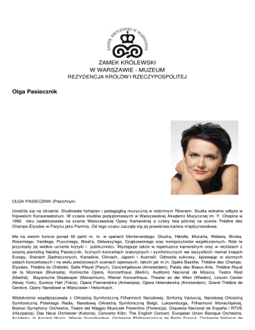 ZAMEK KRÓLEWSKI W WARSZAWIE - MUZEUM REZYDENCJA KRÓLÓW I RZECZYPOSPOLITEJ Olga Pasiecznik OLGA PASIECZNIK (Pasichnyk) Urodziła się na Ukrainie. Studiowała fortepian i pedagogikę muzyczną w rodzinnym Równem. Studia wokalne odbyła w Kijowskim Konserwatorium. W czasie studiów podyplomowych w Warszawskiej Akademii Muzycznej im. F. Chopina w 1992 roku zadebiutowała na scenie Warszawskiej Opery Kameralnej a cztery lata później na scenie Théâtre des Champs-Élysées w Paryżu jako Pamina. Od tego czasu zaczęła się jej prawdziwa kariera międzynarodowa. Ma na swoim koncie ponad 40 partii m. in. w operach Monteverdiego, Glucka, Händla, Mozarta, Webera, Bizeta, Rossiniego, Verdiego, Pucciniego, Biset'a, Debussy'ego, Czajkowskiego oraz kompozytorów współczesnych. Role te przyniosły jej wielkie uznanie krytyki i publiczności. Występuje także w repertuarze kameralnym oraz w recitalach z siostrą pianistką Natalią Pasiecznik, licznych koncertach oratoryjnych i symfonicznych we wszystkich niemal krajach Europy, Stanach Zjednoczonych, Kanadzie, Chinach, Japonii i Australii. Odnosiła sukcesy, śpiewając w słynnych salach koncertowych i na wielu prestiżowych scenach operowych, takich jak m.in. Opéra Bastille, Théâtre des ChampsÉlysées, Théâtre du Châtelet, Salle Pleyel (Paryż), Concertgebouw (Amsterdam), Palais des Beaux-Arts, Théâtre Royal de la Monnaie (Bruksela), Komische Opera, Konzerthaus (Berlin), Auditorio Nacional de Música, Teatro Real (Madrid), Bayerische Staatsoper (Monachium), Wiener Koncerthaus, Theater an der Wien (Wieden), Lincoln Center (Nowy York), Suntory Hall (Tokio), Opera Flamandzka (Antwerpia), Opera Holenderska (Amsterdam), Grand Théâtre de Genève, Opery Narodowe w Warszawie i Helsinkach. Wielokrotnie współpracowała z Orkiestrą Symfoniczną Filharmonii Narodowej, Sinfonią Varsovią, Narodową Orkiestrą Symfoniczną Polskiego Radia, Narodową Orkiestrą Symfoniczną Belgii, Luksemburga, Filharmonii Monachijskiej, Boston Symphony Orchestra, Teatro del Maggio Musicale Fiorentino (Florencja), Orquesta Nacional de España i RTVE (Hiszpania), Das Neue Orchester (Kolonia), Concerto Köln, The English Concert, European Union Baroque Orchestra, Academy of Ancient Music, Wiener Symphoniker, Orchestre Philharmonique de Radio France, Orchestre National de Academy of Ancient Music, Wiener Symphoniker, Orchestre Philharmonique de Radio France, Orchestre National de France, Les Musiciens du Louvre Grenoble, La Grande Écurie et La Chambre du Roy, Orchestre Colonne (Francja), Akademie für Alte Musik Berlin, Freiburger Barockorchester, Orkiestrą XVIII wieku, z zespołem Concerto Vocale, Collegium Vocale Gent i in., pod batutą takich mistrzów, jak m. in. Harry Bicket, Ivor Bolton, Frans Brüggen, JeanClaude Casadesus, Marcus Creed, Paul Mc Creesh, Charles Dutoit, René Jacobs, Roy Goodman, Heinz Holliger, Philippe Herreweghe, Kazimierz Kord, Jerzy Maksymiuk, Jean-Claude Malgoire, Alessandro de Marchi, Marc Minkowski, John Nelson, Peter Neumann, Kazushi Ono, Sakari Oramo, Andrew Parrott, Krzysztof Penderecki, Trevor Pinnock, Marc Soustrot, Andreas Spering, Christoph Spering, Marcello Viotti, Antoni Wit, Massimo Zanetti. Artystka jest laureatką międzynarodowych konkursów wokalnych w s'Hertogenbosch -Holandia (1994 - II nagroda), im. Mirjam Helin w Helsinkach (1999 - II nagroda) oraz im. Królowej Elżbiety w Brukseli (2000 - III nagroda, nagroda specjalna w dziedzinie muzyki oratoryjnej oraz nagroda publiczności). Została wyróżniona także w Polsce - Paszportem tygodnika „Polityka” (1997), nagrodami polskiego przemysłu fonograficznego Fryderyk za najlepsze nagrania solowe w 1997 i 2004 roku (Pieśni kurpiowskie Szymanowskiego i Chantefleurs et Chantefables Lutosławskiego), nagrodą Orfeusz festiwalu „Warszawska Jesień” (1999), Złotym Krzyżem Zasługi (2001) oraz Nagrodą im. A. Hiolskiego (2004) za najlepszą kobiecą rolę operową (Melizanda w operze Debussy'ego - Peleas i Melizanda, Teatr Wielki - Opera Narodowa). W 2005 i 2010 roku została nominowana przez międzynarodowy magazyn operowy Opernwelt do tytułu „Najlepsza śpiewaczka sezonu artystycznego” za rolę Almireny (Händel - Rinaldo) i Roxany (Szymanowski - Krol Roger). W 2006 roku artystka otrzymała także nagrodę monachijskiego festiwalu Opernfestspiele, w 2007 - nagrodę im. Cypriana Kamila Norwida, w roku 2011– doroczną Nagrodę Ministra Kultury i Dziedzictwa Narodowego a w 2012 została odznaczona Krzyżem Oficerskim Orderu Zasługi Rzeczypospolitej Polskiej. W swoim dorobku fonograficznym ma ponad 50 CD i DVD, które nagrała m.in. dla firm Dabringhaus und Grimm, Harmonia Mundi, Naxos i Opus 111. Zamek Królewski w Warszawie - Muzeum. Rezydencja Królów i Rzeczypospolitej www.zamek-krolewski.pl