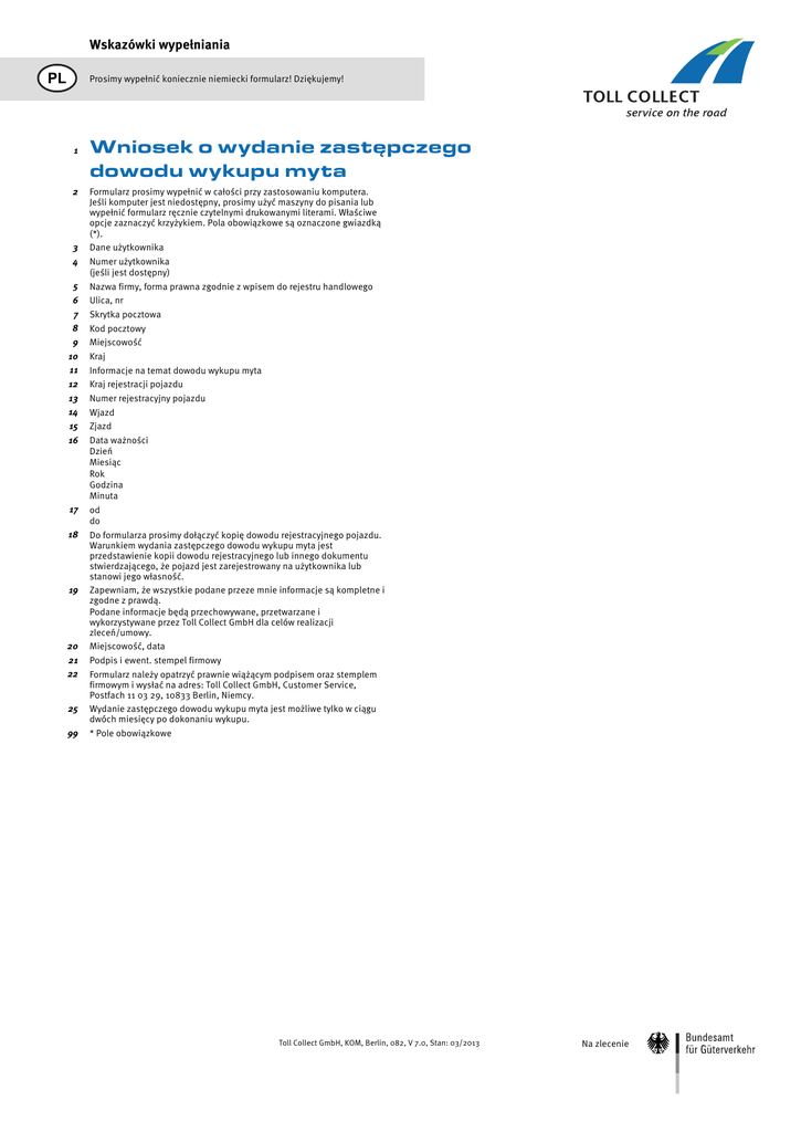 Wskazówki wypełniania PL Prosimy wypełnić koniecznie niemiecki formularz! Dziękujemy! 1 Wniosek o wydanie zastępczego dowodu wykupu myta 2 Formularz prosimy wypełnić w całości przy zastosowaniu komputera. Jeśli komputer jest niedostępny, prosimy użyć maszyny do pisania lub wypełnić formularz ręcznie czytelnymi drukowanymi literami. Właściwe opcje zaznaczyć krzyżykiem. Pola obowiązkowe są oznaczone gwiazdką (*). Dane użytkownika Numer użytkownika (jeśli jest dostępny) Nazwa firmy, forma prawna zgodnie z wpisem do rejestru handlowego Ulica, nr Skrytka pocztowa Kod pocztowy Miejscowość Kraj Informacje na temat dowodu wykupu myta Kraj rejestracji pojazdu Numer rejestracyjny pojazdu Wjazd Zjazd Data ważności Dzień Miesiąc Rok Godzina Minuta od do Do formularza prosimy dołączyć kopię dowodu rejestracyjnego pojazdu. Warunkiem wydania zastępczego dowodu wykupu myta jest przedstawienie kopii dowodu rejestracyjnego lub innego dokumentu stwierdzającego, że pojazd jest zarejestrowany na użytkownika lub stanowi jego własność. Zapewniam, że wszystkie podane przeze mnie informacje są kompletne i zgodne z prawdą. Podane informacje będą przechowywane, przetwarzane i wykorzystywane przez Toll Collect GmbH dla celów realizacji zleceń/umowy. Miejscowość, data Podpis i ewent. stempel firmowy Formularz należy opatrzyć prawnie wiążącym podpisem oraz stemplem firmowym i wysłać na adres: Toll Collect GmbH, Customer Service, Postfach 11 03 29, 10833 Berlin, Niemcy. Wydanie zastępczego dowodu wykupu myta jest możliwe tylko w ciągu dwóch miesięcy po dokonaniu wykupu. * Pole obowiązkowe 3 4 5 6 7 8 9 10 11 12 13 14 15 16 17 18 19 20 21 22 25 99 Toll Collect GmbH, KOM, Berlin, 082, V 7.0, Stan: 03/2013 Powered by TCPDF (www.tcpdf.org) Na zlecenie
