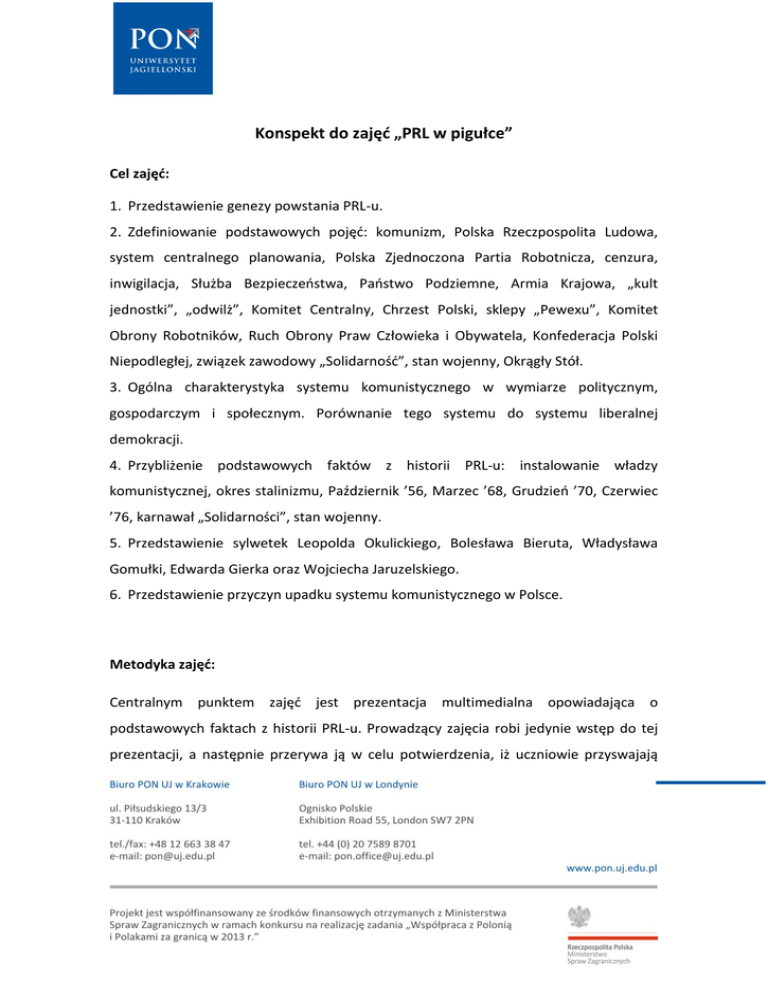 Konspekt do zajęć „PRL w pigułce” Cel zajęć: 1. Przedstawienie genezy powstania PRL-u. 2. Zdefiniowanie podstawowych pojęć: komunizm, Polska Rzeczpospolita Ludowa, system centralnego planowania, Polska Zjednoczona Partia Robotnicza, cenzura, inwigilacja, Służba Bezpieczeństwa, Państwo Podziemne, Armia Krajowa, „kult jednostki”, „odwilż”, Komitet Centralny, Chrzest Polski, sklepy „Pewexu”, Komitet Obrony Robotników, Ruch Obrony Praw Człowieka i Obywatela, Konfederacja Polski Niepodległej, związek zawodowy „Solidarność”, stan wojenny, Okrągły Stół. 3. Ogólna charakterystyka systemu komunistycznego w wymiarze politycznym, gospodarczym i społecznym. Porównanie tego systemu do systemu liberalnej demokracji. 4. Przybliżenie podstawowych faktów z historii PRL-u: instalowanie władzy komunistycznej, okres stalinizmu, Październik ’56, Marzec ’68, Grudzień ’70, Czerwiec ’76, karnawał „Solidarności”, stan wojenny. 5. Przedstawienie sylwetek Leopolda Okulickiego, Bolesława Bieruta, Władysława Gomułki, Edwarda Gierka oraz Wojciecha Jaruzelskiego. 6. Przedstawienie przyczyn upadku systemu komunistycznego w Polsce. Metodyka zajęć: Centralnym punktem zajęć jest prezentacja multimedialna opowiadająca o podstawowych faktach z historii PRL-u. Prowadzący zajęcia robi jedynie wstęp do tej prezentacji, a następnie przerywa ją w celu potwierdzenia, iż uczniowie przyswajają sobie na bieżąco prezentowany materiał. Scenariusz zajęć wskazuje punkty, w których należy zatrzymać prezentację, by podsumować konkretny fragment. Scenariusz zajęć: 1. Wprowadzenie w temat. Prowadzący stawia uczniom kilka podstawowych pytań dotyczących omawianego tematu. Np. „Z czym kojarzy się Państwu komunizm?”; „Czy potrafią Państwo rozszyfrować nazwę PRL?”; „Czy według Państwa wiedzy Polska była kiedyś krajem komunistycznym?”. 2. Zaprezentowanie fragmentu 0:00-3:17. Krótka rozmowa, w trakcie której uczniowie własnymi słowami mają opowiedzieć o genezie powstania PRL-u. 3. Zaprezentowanie fragmentu 3:17-7:01. Krótka rozmowa wokół pytań o podstawowe różnice pomiędzy komunizmem i liberalną demokracją w zakresie politycznym, gospodarczym i społecznym. 4. Zaprezentowanie fragmentu 7:01-13:06. Prośba o scharakteryzowanie przez uczniów podstawowych cech systemu stalinowskiego najważniejszych oraz przywołanie faktów z życia Leopolda Okulickiego oraz Bolesława Bieruta. 5. Zaprezentowanie fragmentu 13:06-20:53. Prośba o scharakteryzowanie przez uczniów okresu rządów Władysława Gomułki, w tym przede wszystkim Obchodów Millenium Chrztu Polski, Marca ’68 oraz Grudnia ’70. 6. Zaprezentowanie fragmentu 20:53-25:06. Prośba o scharakteryzowanie przez uczniów okresu rządów Edwarda Gierka, Czerwca ’76 oraz ruchu społecznego „Solidarność”. 7. Zaprezentowanie fragmentu 25:06-30:27. Rozmowa na temat epoki rządów Wojciecha Jaruzelskiego oraz przyczyn upadku komunizmu w Polsce. 8. Podsumowanie. Prowadzący stawia uczniom pytania dotyczące omawianego tematu. Np. „Czy chcieliby Państwo żyć w takim systemie?”; „Czy komunizm miał jakieś zalety?”; „ Co zrobiliby Państwo żyjąc w takim kraju?” „Dlaczego PRL przetrwał tak długo, pomimo sprzeciwu społeczeństwa?”