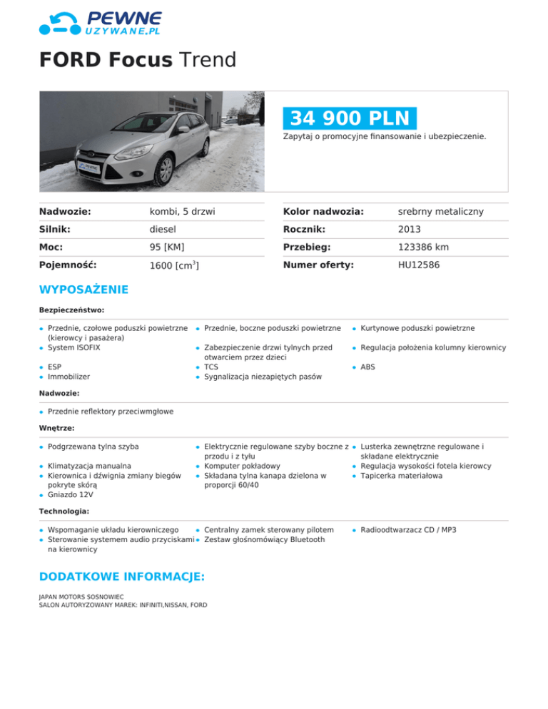 FORD Focus Trend 34 900 PLN Zapytaj o promocyjne finansowanie i ubezpieczenie. Nadwozie: kombi, 5 drzwi Kolor nadwozia: srebrny metaliczny Silnik: diesel Rocznik: 2013 Moc: 95 [KM] Przebieg: 123386 km Pojemność: 1600 [cm ] Numer oferty: HU12586 3 WYPOSAŻENIE Bezpieczeństwo: Przednie, czołowe poduszki powietrzne (kierowcy i pasażera) System ISOFIX ESP Immobilizer Przednie, boczne poduszki powietrzne Kurtynowe poduszki powietrzne Zabezpieczenie drzwi tylnych przed otwarciem przez dzieci TCS Sygnalizacja niezapiętych pasów Regulacja położenia kolumny kierownicy Elektrycznie regulowane szyby boczne z przodu i z tyłu Komputer pokładowy Składana tylna kanapa dzielona w proporcji 60/40 Lusterka zewnętrzne regulowane i składane elektrycznie Regulacja wysokości fotela kierowcy Tapicerka materiałowa Centralny zamek sterowany pilotem Zestaw głośnomówiący Bluetooth Radioodtwarzacz CD / MP3 ABS Nadwozie: Przednie reflektory przeciwmgłowe Wnętrze: Podgrzewana tylna szyba Klimatyzacja manualna Kierownica i dźwignia zmiany biegów pokryte skórą Gniazdo 12V Technologia: Wspomaganie układu kierowniczego Sterowanie systemem audio przyciskami na kierownicy DODATKOWE INFORMACJE: JAPAN MOTORS SOSNOWIEC SALON AUTORYZOWANY MAREK: INFINITI,NISSAN, FORD FORD Focus Trend DZIAŁ SPRZEDAŻY SAMOCHODÓW UŻYWANYCH WIĘCEJSZCZEGÓŁOWYCH INFORMACJI O OFERCIE UZYSKASZ DZWONIĄC DO NASZYCHDORADCÓW: Stępień Konrad – 667-071-253 Adam Musialik – 667-071-110 Samochody z naszej oferty sprzedawane są z opcją OCHRONYKOSZTÓW SERWISOWYCH na rok lub dwa lata. O szczegóły zapytajdoradcę! Przed zaoferowaniem samochodu do sprzedaży stantechniczny auta określamy na podstawie przeglądu przedsprzedażnego. Przegląd wykonywany w JAPAN MOTORS SOSNOWIEC - serwisautoryzowany marek: Infiniti/Nissan/Ford. Zapraszamy donaszego salonu w godzinach: • Pn - Pt: 9:30-18 • Sob:9:00-14 Możliwość zostawienia auta w rozliczeniu. Niniejszeogłoszenie jest wyłącznie informacją handlową i nie stanowioferty w myśl art. 66, § 1. Kodeksu Cywilnego. Sprzedający nieodpowiada za ewentualne błędy lub nieaktualność ogłoszenia.” –Potrzebujesz więcej informacji - skontaktuj się ze sprzedawcą. Pewne Używane Sosnowiec ul. Stawowa 2, tel.:32 721 00 72 www.blog.pgd.pl Nota prawna Dane zawarte w niniejszej propozycji handlowej mają wyłącznie charakter informacyjny. Podane informacje nie stanowią oferty ani zapewnienia, w szczególności w rozumieniu art. 66 § 1 oraz art. 5561 Kodeksu cywilnego. Wiążące ustalenie ceny, wyposażenia oraz specyfikacji samochodu następuje w pisemnej umowie sprzedaży/zamówienia samochodu. Ze względu na ograniczenia techniczne (np. odwzorowanie kolorów przez monitor lub sposób wydruku), kolory przedstawione w niniejszej propozycji handlowej mogą się różnić od rzeczywistych kolorów nadwozia i tapicerki. Niniejsza propozycja handlowa oraz wszelkie załączniki z nią związane są poufne i nie mogą być przekazywane osobom trzecim. Prezentowane zdjęcia mogą zawierać wyposażenie opcjonalne (akcesoryjne), dodatkowo płatne. Warunki oferty maja charakter orientacyjny i mogą zostać zmienione w momencie uaktualnienia cen lub warunków promocji.