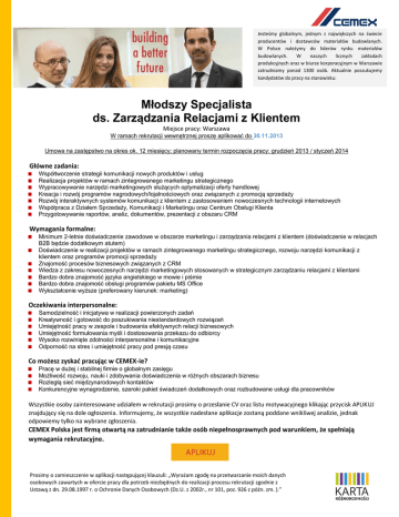 Jesteśmy globalnym, jednym z największych na świecie producentów i dostawców materiałów budowlanych. W Polsce należymy do liderów rynku materiałów budowlanych. W naszych licznych zakładach produkcyjnych oraz w biurze korporacyjnym w Warszawie zatrudniamy ponad 1300 osób. Aktualnie poszukujemy kandydatów do pracy na stanowisku: Młodszy Specjalista ds. Zarządzania Relacjami z Klientem Miejsce pracy: Warszawa W ramach rekrutacji wewnętrznej proszę aplikować do 30.11.2013 Umowa na zastępstwo na okres ok. 12 miesięcy; planowany termin rozpoczęcia pracy: grudzień 2013 / styczeń 2014 Główne zadania: Współtworzenie strategii komunikacji nowych produktów i usług Realizacja projektów w ramach zintegrowanego marketingu strategicznego Wypracowywanie narzędzi marketingowych służących optymalizacji oferty handlowej Kreacja i rozwój programów nagrodowych/lojalnościowych oraz związanych z promocją sprzedaży Rozwój interaktywnych systemów komunikacji z klientem z zastosowaniem nowoczesnych technologii internetowych Współpraca z Działem Sprzedaży, Komunikacji i Marketingu oraz Centrum Obsługi Klienta Przygotowywanie raportów, analiz, dokumentów, prezentacji z obszaru CRM Wymagania formalne: Minimum 2-letnie doświadczenie zawodowe w obszarze marketingu i zarządzania relacjami z klientem (doświadczenie w relacjach B2B będzie dodatkowym atutem) Doświadczenie w realizacji projektów w ramach zintegrowanego marketingu strategicznego, rozwoju narzędzi komunikacji z klientem oraz programów promocji sprzedaży Znajomość procesów biznesowych związanych z CRM Wiedza z zakresu nowoczesnych narzędzi marketingowych stosowanych w strategicznym zarządzaniu relacjami z klientami Bardzo dobra znajomość języka angielskiego w mowie i piśmie Bardzo dobra znajomość obsługi programów pakietu MS Office Wykształcenie wyższe (preferowany kierunek: marketing) Oczekiwania interpersonalne: Samodzielność i inicjatywa w realizacji powierzonych zadań Kreatywność i gotowość do poszukiwania niestandardowych rozwiązań Umiejętność pracy w zespole i budowania efektywnych relacji biznesowych Umiejętność formułowania myśli i dostosowania przekazu do odbiorcy Wysoko rozwinięte zdolności interpersonalne i komunikacyjne Odporność na stres i umiejętność pracy pod presją czasu Co możesz zyskad pracując w CEMEX-ie? Pracę w dużej i stabilnej firmie o globalnym zasięgu Możliwość rozwoju, nauki i zdobywania doświadczenia w różnych obszarach biznesu Rozległą sieć międzynarodowych kontaktów Konkurencyjne wynagrodzenie, szeroki pakiet świadczeń dodatkowych oraz rozbudowane usługi dla pracowników Wszystkie osoby zainteresowane udziałem w rekrutacji prosimy o przesłanie CV oraz listu motywacyjnego klikając przycisk APLIKUJ znajdujący się na dole ogłoszenia. Informujemy, że wszystkie nadesłane aplikacje zostaną poddane wnikliwej analizie, jednak odpowiemy tylko na wybrane zgłoszenia. CEMEX Polska jest firmą otwartą na zatrudnianie także osób niepełnosprawnych pod warunkiem, że spełniają wymagania rekrutacyjne. Prosimy o zamieszczenie w aplikacji następującej klauzuli: „Wyrażam zgodę na przetwarzanie moich danych osobowych zawartych w ofercie pracy dla potrzeb niezbędnych do realizacji procesu rekrutacji zgodnie z Ustawą z dn. 29.08.1997 r. o Ochronie Danych Osobowych (Dz.U. z 2002r., nr 101, poz. 926 z późn. zm. ).”