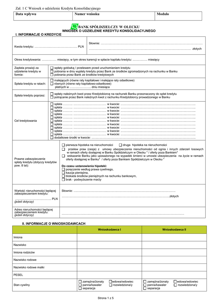 Zał. 1 C Wniosek o udzielenie Kredytu Konsolidacyjnego Data wpływu Numer wniosku Modulo BANK SPÓŁDZIELCZY W OLECKU WNIOSEK O UDZIELENIE KREDYTU KONSOLIDACYJNEGO I. INFORMACJE O KREDYCIE Słownie: ……………………………..…………………….……………………………………… Kwota kredytu: …………….………………………. PLN ………………….………………………………..……………………………………… złotych Okres kredytowania: …………… miesięcy, w tym okres karencji w spłacie kapitału kredytu: …………… miesięcy Zapłata prowizji za udzielenie kredytu w formie: wpłaty gotówką / przelewem przed uruchomieniem kredytu pobrania w dniu wypłaty kredytu przez Bank ze środków zgromadzonych na rachunku w Banku pobrania przez Bank ze środków kredytowych Spłata kredytu w ratach: malejących (równe raty kapitałowe i malejące raty odsetkowe) równych (równe raty kapitałowo-odsetkowe) płatnych w …………………. dniu miesiąca Spłata kredytu poprzez: wpłaty należnych kwot przez Kredytobiorcę na rachunek Banku przeznaczony do spłat kredytu potrącanie przez Bank należnych kwot z rachunku Kredytobiorcy prowadzonego w Banku Cel kredytowania spłata ………. ……………………………. w kwocie: ………………………………………………………………….. spłata ………. ……………………………. w kwocie: ………………………………………………………………….. spłata ………. ……………………………. w kwocie: ………………………………………………………………….. spłata ………. ……………………………. w kwocie: ………………………………………………………………….. spłata ………. ……………………………. w kwocie: ………………………………………………………………….. spłata ………. ……………………………. w kwocie: ………………………………………………………………….. spłata ………. ……………………………. w kwocie: ………………………………………………………………….. spłata ………. ……………………………. w kwocie: ………………………………………………………………….. spłata ………. ……………………………. w kwocie: ………………………………………………………………….. spłata ………. ……………………………. w kwocie: ………………………………………………………………….. dodatkowe środki w kwocie: …………………………………………………………………………………………….. Prawne zabezpieczenie spłaty kredytu (dotyczy kredytów pow. 8 lat): Wartość nieruchomości będącej zabezpieczeniem kredytu: ………………………………. PLN (jeżeli dotyczy) Adres nieruchomości będącej zabezpieczeniem kredytu: (jeżeli dotyczy) pierwsza hipoteka na nieruchomości druga hipoteka na nieruchomości przelew praw (cesja) z umowy ubezpieczenia nieruchomości od ognia i innych zdarzeń losowych w ramach oferty dostępnej w Banku Spółdzielczym w Olecku * / oferty poza Bankiem* wskazanie Banku jako uposażonego na wypadek śmierci w umowie ubezpieczenia na życie w ramach oferty dostępnej w Banku* / oferty poza Bankiem Spółdzielczym w Olecku * Do czasu ustanowienia hipoteki: poręczenie według prawa cywilnego, kaucja pieniężna, blokada środków pieniężnych na rachunku bankowym, brak - podwyższenie marży Słownie: ……………………………..…………………….……………………………………… ………………….………………………………..……………………………………………złotych ………………….………………………………..………………………………………………………… II. INFORMACJE O WNIOSKODAWCACH Wnioskodawca I Wnioskodawca II Imiona Nazwisko Imiona rodziców Nazwisko rodowe Nazwisko rodowe matki PESEL Stan cywilny zamężna/żonaty panna/kawaler separacja wdowa/wdowiec rozwiedziona/y Strona 1 z 5 zamężna/żonaty panna/kawaler separacja wdowa/wdowiec rozwiedziona/y Wnioskodawca I Małżeńska wspólnota majątkowa Cechy dokumentu tożsamości Adres zamieszkania Adres do korespondencji (wpisać jeśli jest inny od adresu zamieszkania) Nr telefonu (do wyboru) tak nie nie dotyczy Wnioskodawca II tak nie nie dotyczy Nazwa: ……………………………………………. Nazwa: ……………………………………………. Seria…………Nr dokumentu: .…………………. Seria…………Nr dokumentu: .…………………. Wydany przez: ................................................. Wydany przez: ................................................. Dnia ……………………………………………….. Dnia ……………………………………………….. Ulica: ………………………….…………………. Ulica: ……………………………………………... Nr domu: ………………….…………………….. Nr domu: …………………………………………. Nr lokalu………………….……………………… Nr lokalu: …………………….…………………… Kod: ……………………………………………... Kod: …………………………….………………… Miejscowość: …………………….……………… Miejscowość………………….………………….. Kraj: ……………………………………………... Kraj: ………………………….…………………… Ulica……...………………………….…………… Ulica……...…………………….….……………… Nr domu: ……...………………………………… Nr domu: ……...…
