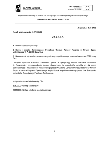 Projekt współfinansowany ze środków Unii Europejskiej w ramach Europejskiego Funduszu Społecznego CZŁOWIEK – NAJLEPSZA INWESTYCJA Załącznik nr 1 do SIWZ Nr ref. postępowania: X-271-03/15 OFERTA 1. Nazwa i siedziba Wykonawcy: 2. Nazwa i siedziba Zamawiającego: Powiatowe Centrum Pomocy Rodzinie w Nowym Sączu, ul. Kilińskiego 72 A, 33-300 Nowy Sącz 3. Nawiązując do ogłoszenia o przetargu nieograniczonym, opublikowanego na stronie internetowej PCPR Nowy Sącz. Oferujemy wykonanie Przedmiotu Zamówienia zgodnie ze specyfikacją istotnych warunków zamówienia tj.: Organizacja i przeprowadzenie kursów edukacyjnych dla uczestników projektu pn. „W stronę samodzielności i niezależności” realizowanego przez Powiatowe Centrum Pomocy Rodzinie w Nowym Sączu w ramach Programu Operacyjnego Kapitał Ludzki współfinansowanego przez Unię Europejską ze środków Europejskiego Funduszu Społecznego. Kod przedmiotu zamówienia według CPV: 80500000-9 Usługi szkoleniowe 80510000-2 Usługi szkolenia specjalistycznego 1 Projekt współfinansowany ze środków Unii Europejskiej w ramach Europejskiego Funduszu Społecznego CZŁOWIEK – NAJLEPSZA INWESTYCJA Zad. 1. Kurs florystyczny dla osób niepełnosprawnych. Rodzaj kosztów Cena jednostk. [PLN] Liczba osób 2 Kurs florystyczny dla osób niepełnosprawnych 2 Zwrot kosztów dojazdu dla uczestnika /średni koszt na 1 osobę/ Materiały szkoleniowe /średni koszt na 1 osobę/ Ubezpieczenie 2 /średni koszt na 1 osobę/ Usługa cateringowa: przerwa kawowa / średni koszt na 1 osobę/ 2 2 RAZEM WARTOŚĆ BRUTTO za realizację zadania 1 [PLN] 2 Wartość ogółem [PLN] Projekt współfinansowany ze środków Unii Europejskiej w ramach Europejskiego Funduszu Społecznego CZŁOWIEK – NAJLEPSZA INWESTYCJA Zadanie 2. Kurs języka niemieckiego dla osób niepełnosprawnych. Rodzaj kosztów Cena jednostk. [PLN] Kurs języka niemieckiego dla osób Liczba osób 2 niepełnosprawnych. 2 Zwrot kosztów dojazdu dla uczestnika /średni koszt na 1 osobę/ Materiały szkoleniowe /średni koszt na 1 osobę/ Ubezpieczenie 2 /średni koszt na 1 osobę/ Usługa cateringowa: przerwa kawowa / średni koszt na 1 osobę/ 2 2 RAZEM WARTOŚĆ BRUTTO za realizację zadania 2 [PLN] 3 Wartość ogółem [PLN] Projekt współfinansowany ze środków Unii Europejskiej w ramach Europejskiego Funduszu Społecznego CZŁOWIEK – NAJLEPSZA INWESTYCJA Zadanie 3. Kurs języka angielskiego dla osób niepełnosprawnych. Rodzaj kosztów Cena jednostk. [PLN] Liczba osób 7 Kurs języka angielskiego dla osób niepełnosprawnych. 7 Zwrot kosztów dojazdu dla uczestnika /średni koszt na 1 osobę/ Materiały szkoleniowe / średni koszt na 1 osobę/ 7 Ubezpieczenie 7 / średni koszt na 1 osobę/ Usługa cateringowa: przerwa kawowa / średni koszt na 1 osobę/ 7 RAZEM WARTOŚĆ BRUTTO za realizację zadania 3 [PLN] 4 Wartość ogółem [PLN] Projekt współfinansowany ze środków Unii Europejskiej w ramach Europejskiego Funduszu Społecznego CZŁOWIEK – NAJLEPSZA INWESTYCJA Zadanie 4. Kurs wizażu dla osób niepełnosprawnych. Rodzaj kosztów Cena jednostk. [PLN] Liczba osób 3 Kurs wizażu dla osób niepełnosprawnych 3 Zwrot kosztów dojazdu dla uczestnika (/ średni koszt na 1 osobę/ Materiały szkoleniowe / średni koszt na 1 osobę/ 3 Ubezpieczenie 3 / średni koszt na 1 osobę/ Usługa cateringowa: przerwa kawowa / średni koszt na 1 osobę/ 3 RAZEM WARTOŚĆ BRUTTO za realizację zadania 4 [PLN] 5 Wartość ogółem [PLN] Projekt współfinansowany ze środków Unii Europejskiej w ramach Europejskiego Funduszu Społecznego CZŁOWIEK – NAJLEPSZA INWESTYCJA Zadanie 5. Kurs krawiecki dla osób niepełnosprawnych. Rodzaj kosztów Kurs krawiecki dla Cena jednostk. [PLN] Liczba osób 1 osób niepełnosprawnych. 1 Zwrot kosztów dojazdu dla uczestnika / średni koszt na 1 osobę/ Materiały szkoleniowe / średni koszt na 1 osobę/ 1 Ubezpieczenie 1 / średni koszt na 1 osobę/ Usługa cateringowa: przerwa kawowa / średni koszt na 1 osobę/ 1 RAZEM WARTOŚĆ BRUTTO za realizację zadania 5 [PLN] 6 Wartość ogółem [PLN] Projekt współfinansowany ze środków Unii Europejskiej w ramach Europejskiego Funduszu Społecznego CZŁOWIEK – NAJLEPSZA INWESTYCJA Zadanie 6. Kurs grafiki komputerowej dla osób niepełnosprawnych. Rodzaj kosztów Cena jednostk. [PLN] Liczba osób 1 Kurs grafiki komputerowej dla osób niepełnosprawnych. 1 Zwrot kosztów dojazdu dla uczestnika / średni koszt na 1 osobę/ Materiały szkoleniowe / średni koszt na 1 osobę/ 1 Ubezpieczenie 1 / średni koszt na 1 osobę/ Usługa cateringowa: przerwa kawowa / średni koszt na 1 osobę/ 1 RAZEM WARTOŚĆ BRUTTO za realizację zadania 6 [PLN] 7 Wartość ogółem [PLN] Projekt współfinansowany ze środków Unii Europejskiej w ramach Europejskiego Funduszu Społecznego CZŁOWIEK – NAJLEPSZA INWESTYCJA Zadanie 7. Kurs komputerowy – poziom podstawowy dla osób niepełnosprawnych. Rodzaj kosztów Cena jednostk. [PLN] 14 Kurs komputerowy – poziom podstawowy dla Liczba osób osób niepełnosprawnych. 7 Zwrot kosztów dojazdu dla uczestnika / średni koszt na 1 osobę/ Koszt transportu uczestnika i opiekuna (średni koszt na 1 osobę) . Trasa przejazdu : Krynica Zdrój – Nowy Sącz - Krynica Zdrój– Materiały szkoleniowe / średni koszt na 1 osobę/ 7 osób z opiekun om 14 14 Ubezpieczenie / średni koszt na 1 osobę/ Usługa cateringowa: przerwa kawowa / średni koszt na 1 osobę/ 14 RAZEM WARTOŚĆ BRUTTO za realizację zadania 7 [PLN] 8 Wartość ogółem [PLN] Projekt współfinansowany ze środków Unii Europejskiej w ramach Europejskiego Funduszu Społecznego CZŁOWIEK – NAJLEPSZA INWESTYCJA Zadanie 8. Kurs komputerowy – zaawansowany dla osób niepełnosprawnych. Rodzaj kosztów Kurs komputerowy zaawansowany dla Cena jednostk. [PLN] Liczba osób 1 – osób niepełnosprawnych. 1 Zwrot kosztów dojazdu dla uczestnika (/ średni koszt na 1 osobę/ Materiały szkoleniowe / średni koszt 
