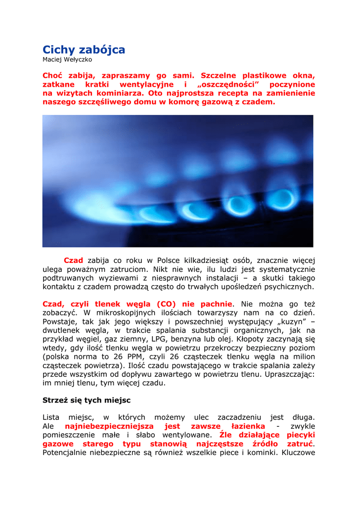 Cichy zabójca Maciej Wełyczko Choć zabija, zapraszamy go sami. Szczelne plastikowe okna, zatkane kratki wentylacyjne i „oszczędności” poczynione na wizytach kominiarza. Oto najprostsza recepta na zamienienie naszego szczęśliwego domu w komorę gazową z czadem. Czad zabija co roku w Polsce kilkadziesiąt osób, znacznie więcej ulega poważnym zatruciom. Nikt nie wie, ilu ludzi jest systematycznie podtruwanych wyziewami z niesprawnych instalacji – a skutki takiego kontaktu z czadem prowadzą często do trwałych upośledzeń psychicznych. Czad, czyli tlenek węgla (CO) nie pachnie. Nie można go też zobaczyć. W mikroskopijnych ilościach towarzyszy nam na co dzień. Powstaje, tak jak jego większy i powszechniej występujący „kuzyn” – dwutlenek węgla, w trakcie spalania substancji organicznych, jak na przykład węgiel, gaz ziemny, LPG, benzyna lub olej. Kłopoty zaczynają się wtedy, gdy ilość tlenku węgla w powietrzu przekroczy bezpieczny poziom (polska norma to 26 PPM, czyli 26 cząsteczek tlenku węgla na milion cząsteczek powietrza). Ilość czadu powstającego w trakcie spalania zależy przede wszystkim od dopływu zawartego w powietrzu tlenu. Upraszczając: im mniej tlenu, tym więcej czadu. Strzeż się tych miejsc Lista miejsc, w których możemy ulec zaczadzeniu jest długa. Ale najniebezpieczniejsza jest zawsze łazienka zwykle pomieszczenie małe i słabo wentylowane. Źle działające piecyki gazowe starego typu stanowią najczęstsze źródło zatruć. Potencjalnie niebezpieczne są również wszelkie piece i kominki. Kluczowe znaczenie dla ich prawidłowego działania ma stan instalacji kominowej – przy niedrożnym kominie gwałtownie rośnie ilość powstającego czadu. W szczególnych warunkach (zwłaszcza zimą, gdy ciężkie zimne powietrze opada w dół) może dojść do zjawiska tzw. ciągu wstecznego, tzn. sytuacji, w której dym zamiast wydostawać się kominem, pompowany jest do mieszkania. Znaczna liczba zaczadzeń zdarza się także w garażach – spalanie benzyny, czy oleju napędowego w silniku również powoduje powstawanie tlenku węgla. Uwagi wymaga nawet zwykła kuchenka gazowa. Jeśli zauważymy jakiekolwiek problemy z paleniem się gazu (np. zmianę koloru z niebieskiego na żółty) wyłączmy urządzenie i wezwijmy fachowca. Żyj i daj żyć Pierwszą linią obrony przed czadem jest zawsze powszechnie lubiany pan w czarnym kombinezonie i cylindrze – kominiarz. - Problem w tym, że ludzie chętniej łapią się za guzik niż za portfel, a potem jest tragedia mówi pan Stanisław, wrocławski kominiarz z przeszło dwudziestoletnim stażem. Stawki kominiarskie nie są może najniższe, ale nie są to też koszty zwalające z nóg. Kompleksowy przegląd w domu jednorodzinnym to zwykle wydatek oscylujący wokół 150 zł, czyszczenie zatkanego komina - 100 do 300 zł. Pamiętajmy, że współczesny kominiarz to nie tylko człowiek ze szczotką i kulą na łańcuchu, lecz także specjalista dysponujący szeregiem nowoczesnych urządzeń – m.in. miernikiem określającym poziom tlenku węgla. Mimo to, wielu rodaków unika jego wizyty, jak może. - Wszystko przez źle rozumianą oszczędność. Dodatkowo rynek psują fałszywi kominiarze, przez których ludzie tracą do nas zaufanie dodaje pan Stanisław. Jeszcze w połowie lat 90-tych XX w. urządzenia elektroniczne wykrywające czad w powietrzu leżały poza zasięgiem finansowym przeciętnego Kowalskiego. Dziś jest zupełnie inaczej. Na rynku obecna jest szeroka oferta krajowych i zagranicznych producentów oferujących domowe wykrywacze CO w cenie 50-250 zł. Czad jest na szczęście gazem łatwym do wykrycia przy użyciu tzw. ogniwa elektrochemicznego (wytwarzającego prąd w przypadku pojawienia się CO). Czujnik bada w ten sposób (zwykle co 15 lub 30 sekund) stężenie tlenku węgla w powietrzu. W przypadku pojawienia się podwyższonego (lecz jeszcze nie niebezpiecznego) stężenia, alarmuje dźwiękiem i miganiem lampki. Urządzenie jest niewielkie i ma zwykle kilkuletnią gwarancję producenta. Mogą być zasilane z baterii i/lub z sieci elektrycznej. Droższe modele potrafią także wykrywać dym, stanowią więc zarazem proste zabezpieczenie przeciwpożarowe. W przypadku ich stosowania należy zawsze pamiętać o umieszczeniu czujnika w pobliżu miejsca możliwego pojawienia się czadu (w łazience, w pobliżu kominka, pieca, kuchni, garażu). Gdy potencjalnych źródeł jest więcej, starajmy się instalować więcej czujników. Choć i tak, lepszy jeden alarm, niż żaden. Przed zakupem warto sprawdzić, czy urządzenie posiada certyfikat zgodności z europejską normą EN 5029: 2001. Truciciel Stwierdzenie, że czad dusi, nie jest szczególnie odkrywcze, ale do działania tego gazu pasuje jak ulał. Trucicielska moc tlenku węgla wynika z ogromnej łatwości, z jaką wchodzi on w reakcję z hemoglobiną – zawierającym żelazo czerwonym barwnikiem krwi. Hemoglobina odpowiada za transport atomów życiodajnego tlenu wewnątrz naszego ciała. W obecności tlenku węgla jednak proces ten zostaje dramatycznie zakłócony – CO niejako „podłącza się” do hemoglobiny zamiast tlenu. Powstała w ten sposób karboksyhemoglobina jest dla organizmu zupełnie bezużyteczna. CO utrudnia jednocześnie przekazywanie atomów tlenu tym cząsteczkom krwi, które zdołały się z nim połączyć. Prowadzi to do nieuchronnego niedotlenienia organizmu – wewnętrznego duszenia się. Brak tlenu upośledza w pierwszej kolejności system nerwowy – stąd m.in. utrata lub zaburzenia przytomności. Wedle nowszych badań, zatrucia tlenkiem węgla przebiegają niejako dwutorowo – prócz mechanizmu opisanego wyżej, występuje jeszcze trujące działanie polegające na uszkadzaniu wewnętrznym komórek i wywoływania stanów zapalnych – także w tkance nerwowej. Szczególnie narażone na zatrucie czadem są dzieci, ludzie starsi i z chorobami krążenia. Czad jest bardzo n