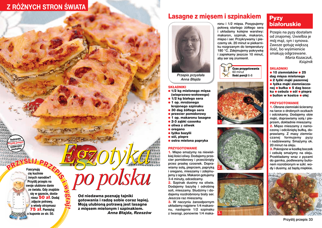 Z RÓŻNYCH STRON ŚWIATA Lasagne z mięsem i szpinakiem ronu i 1/2 mięsa. Posypujemy połową startego żółtego sera i układamy kolejne warstwy: makaron, szpinak, makaron, mięso i ser. Przykrywamy i pieczemy ok. 20 minut w piekarniku rozgrzanym do temperatury 180 °C. Zdejmujemy pokrywkę i zapiekamy jeszcze 10 minut, aby ser się zrumienił. Czas przygotowania 60 minut Ilość porcji 6-8 Przepis przysłała Anna Błajda Testowała pis Przyślij prze redakcyjna kucharka Fascynująą cię kuchhnie innych nnarodów? Przyślij pprzepis na swoje ulubbione danie ze światta. Gdy znajdzie się w ggazecie, dostaniesz 50 zł. Dodaj zdjęciie potrawy, a wteddy otrzymasz 75 zł. Pamiętaj o kuponiee ze str. 50. Egzotyka g y po polsku Od niedawna poznaję tajniki gotowania i radzę sobie coraz lepiej. Moją ulubioną potrawą jest lasagne z mięsem mielonym i szpinakiem. Anna Błajda, Rzeszów SKŁADNIKI ● 1/2 kg mielonego mięsa (wieprzowo-wołowego) ● 1/2 kg białego sera ● 1 op. mrożonego krojonego szpinaku ● 30 dag żółtego sera ● przecier pomidorowy ● 1 op. makaronu lasagne ● 2-3 ząbki czosnku ● oliwa z oliwek ● oregano ● łyżka bazylii ● sól, pieprz ● ostra mielona papryka PRZYGOTOWANIE 1. Mięso smażymy na niewielkiej ilości oliwy. Dodajemy przecier pomidorowy i przeciśnięty przez praskę czosnek. Doprawiamy solą, pieprzem, papryką i oregano, mieszamy i zdejmujemy z ognia. Makaron gotujemy 3-4 minuty, odcedzamy. 2. Szpinak dusimy na oliwie. Dodajemy bazylię i odrobinę soli, mieszamy. Studzimy i dodajemy rozdrobniony biały ser. Jeszcze raz mieszamy. 3. W naczyniu żaroodpornym układamy najpierw 1/4 makaronu, następnie 1/2 szpinaku z twarogi, ponownie 1/4 maka- 1. 2. Pyzy białoruskie Przepis na pyzy dostałam od znajomej. Uwielbia je mój mąż, syn i synowa. Zawsze gotuję większą ilość, bo wyśmienicie smakują odgrzewane. Maria Kozaczuk, Książnik SKŁADNIKI ● 10 ziemniaków ● 25 dag mięsa mielonego ● 2 łyżki mąki pszennej ● łyżka mąki ziemniaczanej ● bułka ● 5 dag boczku ● cebula ● sól ● pieprz ● bulion w kostce ● olej PRZYGOTOWANIE 1. Obrane ziemniaki ścieramy na tarce o drobnych oczkach i odciskamy. Dodajemy obie mąki, doprawiamy solą i pieprzem, dokładnie mieszamy. 2. Mięso mieszamy z namoczoną i odciśniętą bułką, doprawiamy. Z masy ziemniaczanej formujemy pyzy i nadziewamy. Smażymy ok. 20 minut na oleju. k 3. Pokrojone w kostkę boczek i cebulę smażymy na oleju. Przekładamy wraz z pyzami do garnka, podlewamy bulionem rozrobionym w szkl. wody i dusimy, aż będą miękkie. 3. Przyślij przepis 33