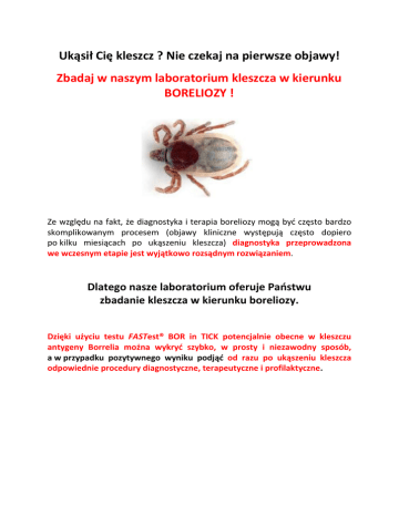 Ukąsił Cię kleszcz ? Nie czekaj na pierwsze objawy! Zbadaj w naszym laboratorium kleszcza w kierunku BORELIOZY ! Ze względu na fakt, że diagnostyka i terapia boreliozy mogą być często bardzo skomplikowanym procesem (objawy kliniczne występują często dopiero po kilku miesiącach po ukąszeniu kleszcza) diagnostyka przeprowadzona we wczesnym etapie jest wyjątkowo rozsądnym rozwiązaniem. Dlatego nasze laboratorium oferuje Państwu zbadanie kleszcza w kierunku boreliozy. Dzięki użyciu testu FASTest® BOR in TICK potencjalnie obecne w kleszczu antygeny Borrelia można wykryć szybko, w prosty i niezawodny sposób, a w przypadku pozytywnego wyniku podjąć od razu po ukąszeniu kleszcza odpowiednie procedury diagnostyczne, terapeutyczne i profilaktyczne. Jak dostarczyć kleszcza do badań ? 1. Usuń bezpiecznie kleszcza ze skóry Po ukąszeniu, kleszcza najlepiej usuwać pęsetą, lassem do usuwania kleszczy lub innymi przyrządami służącymi do tego celu. Nie należy usuwać kleszcza gołymi rękami, gdyż może zwiększyć to ryzyko zakażenia. Należy chwycić kleszcza jak najbliżej skóry i pewnym, ale delikatnym ruchem wyciągnąć go pociągając ku górze. Nie należy kleszcza wykręcać, a także nie wolno zaciskać pęsety na ciele kleszcza. Po wyjęciu kleszcza należy ranę oraz pęsetę zdezynfekować środkiem dezynfekującym rany oraz dokładnie oczyścić ręce wodą z mydłem. Uwaga! Nie wolno smarować kleszcza masłem lub innymi środkami, które mogłyby go podrażnić, gdyż znacznie zwiększa to ryzyko zakażenia drobnoustrojami chorobotwórczymi. 2. Dostarczenie kleszcza do naszego laboratorium Kleszcza należy zapakować w miarę możliwości szczelnie do woreczka foliowego albo pojemnika na mocz lub kał następnie dostarczyć do laboratorium maksymalnie do 48 godzin od usunięcia kleszcza. W czasie przed dostarczeniem do laboratorium przechowywać w lodówce.