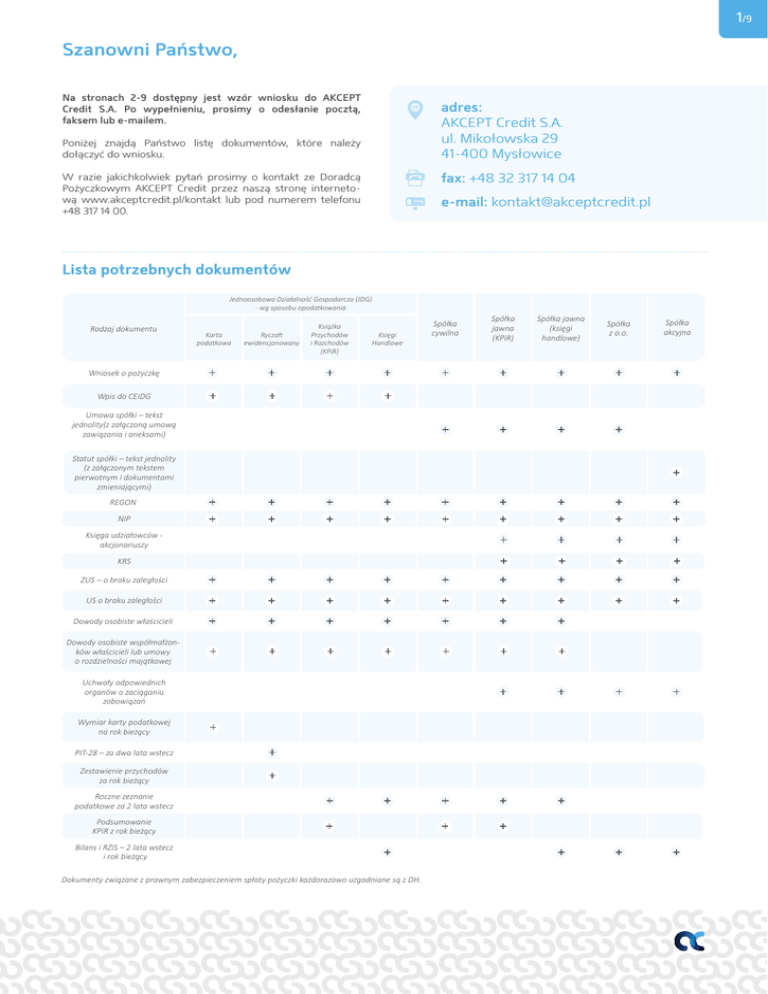 1/9 Szanowni Państwo, Na stronach 2-9 dostępny jest wzór wniosku do AKCEPT Credit S.A. Po wypełnieniu, prosimy o odesłanie pocztą, faksem lub e-mailem. adres: AKCEPT Credit S.A. ul. Mikołowska 29 41-400 Mysłowice Poniżej znajdą Państwo listę dokumentów, które należy dołączyć do wniosku. fax: +48 32 317 14 04 W razie jakichkolwiek pytań prosimy o kontakt ze Doradcą Pożyczkowym AKCEPT Credit przez naszą stronę internetową www.akceptcredit.pl/kontakt lub pod numerem telefonu +48 317 14 00. e-mail: [email protected] Lista potrzebnych dokumentów Jednoosobowa Działalność Gospodarcza (JDG) - wg sposobu opodatkowania Rodzaj dokumentu Karta podatkowa Ryczałt ewidencjonowany Książka Przychodów i Rozchodów (KPiR) Księgi Handlowe Wniosek o pożyczkę Wpis do CEIDG Umowa spółki – tekst jednolity(z załączoną umową zawiązania i aneksami) Statut spółki – tekst jednolity (z załączonym tekstem pierwotnym i dokumentami zmieniającymi) REGON NIP Księga udziałowców akcjonariuszy KRS ZUS – o braku zaległości US o braku zaległości Dowody osobiste właścicieli Dowody osobiste współmałżonków właścicieli lub umowy o rozdzielności majątkowej Uchwały odpowiednich organów o zaciąganiu zobowiązań Wymiar karty podatkowej na rok bieżący PIT-28 – za dwa lata wstecz Zestawienie przychodów za rok bieżący Roczne zeznanie podatkowe za 2 lata wstecz Podsumowanie KPiR z rok bieżący Bilans i RZiS – 2 lata wstecz i rok bieżący Dokumenty związane z prawnym zabezpieczeniem spłaty pożyczki każdorazowo uzgadniane są z DH. Spółka cywilna Spółka jawna (KPiR) Spółka jawna (księgi handlowe) Spółka z o.o. Spółka akcyjna 2/9 Wniosek o: udzielenie pożyczki zmianę warunków pożyczki odnowienie pożyczki wydanie promesy Stempel firmowy Wnioskodawcy 1. Dane firmowe Wnioskodawcy Pełna nazwa REGON NIP Adres siedziby Miejscowość Nr domu Nr lokalu Ulica Kod pocztowy Kraj Województwo Telefon E-mail Adres miejsca prowadzenia działalności/zakładu głównego (proszę wpisać, jeżeli jest inny niż adres siedziby) Miejscowość Nr domu Nr lokalu Ulica Kod pocztowy Kraj Osoba upoważniona do kontaktów z AKCEPT Credit S.A. Województwo Imię i Nazwisko Telefon 2. Dane transakcji Rodzaj transakcji Pożyczka odnawialna Rodzaj wniosku Udzielenie Pożyczka nieodnawialna Odnowienie limitu Zmiana warunków Numer umowy pożyczki (dotyczy odnowienia limitu albo zmiany warunków) Rodzaj wnioskowanej zmiany (proszę wypełnić zgodnie z katalogiem zmian wskazanym na końcu wniosku)1 Waluta PLN EUR Inna Kwota pożyczki Przeznaczenie Opis przedmiotu finansowania Okres finansowania (w miesiącach) 3/9 Wypłata pożyczki Jednorazowo - data uruchomienia (rrrr-mm-dd) - - W transzach 1 transza od - - do - - kwota uruchamianej transzy - - do - - kwota uruchamianej transzy - - do - - kwota uruchamianej transzy - - do - - kwota uruchamianej transzy 2 transza od 3 transza od 4 transza od Formuła spłaty spłata jednorazowa raty równe z odsetkami Typ oprocentowania stałe raty malejące z odsetkami harmonogram nieregularny2 zmienne Okres karencji do dnia w miesiącach (dotyczy tylko pożyczki nieodnawialnej) - - 3. Informacje o prowadzonej działaności gospodarczej Forma działalności gospodarczej osoba fizyczna prowadząca działalność gospodarczą spółka komandytowo-akcyjna spółka cywilna osób fizycznych spółka jawna spółka z ograniczoną odpowiedzialnością spółka partnerska spółka akcyjna Czy działalność jest prowadzona w ramach działów specjalnych produkcji rolnej? (pytanie dotyczy tylko rolników, w pozostałych przypadkach proszę pominąć) spółka komandytowa rolnik tak nie Liczba właścicieli Data rozpoczęcia aktualnie prowadzonej działalności (rrrr-mm-dd) - - Data rozpoczęcia działalności w branży (rrrr-mm-dd) - - PKD przeważającego rodzaju prowadzonej działalności Skrócony opis prowadzonej działalności Działalność sezonowa tak nie Uzasadnienie sezonowości (w jakich okresach występuje i z czego wynika ) Liczba zatrudnionych pracowników (bez przedsiębiorcy/wspólników) Tytuł prawny do nieruchomości w której prowadzona jest działalność własność współwłasność spółdzielcze własnościowe prawo do lokalu dzierżawa inne (jakie) użytkowanie wieczyste najem 4/9 Udział w sprzedaży 4 największych odbiorców Nazwa odbiorcy 1, NIP % w sprzedaży netto ogółem Nazwa odbiorcy 2, NIP % w sprzedaży netto ogółem Nazwa odbiorcy 3, NIP % w sprzedaży netto ogółem Nazwa odbiorcy 4, NIP % w sprzedaży netto ogółem Forma ewidencji i sposób rozliczania z podatku Pełna sprawozdawczość Okres T (bieżący) Okres T-1 (rok ubiegły) Okres T-2 (okres poprzedzający rok ubiegły) Podatkowa księga przychodów i rozchodów Okres T (bieżący) Okres T-1 (rok ubiegły) Okres T-2 (okres poprzedzający rok ubiegły) Ryczałt ewidencjonowany Okres T (bieżący) Okres T-1 (rok ubiegły) Okres T-2 (okres poprzedzający rok ubiegły) Karta podatkowa Okres T (bieżący) Okres T-1 (rok ubiegły) Okres T-2 (okres poprzedzający rok ubiegły) Rolnik ryczałtowy Okres T (bieżący) Okres T-1 (rok ubiegły) Okres T-2 (okres poprzedzający rok ubiegły) Rolnik - czynny podatnik VAT Okres T (bieżący) Okres T-1 (rok ubiegły) Okres T-2 (okres poprzedzający rok ubiegły) Rolnik prowadzący działalność rolniczą w ramach działów specjalnych produkcji rolnej i będący podatnikiem podatku dochodowego od osób fizycznych (niezależnie czy jest rolnikiem ryczałtowym czy czynnym podatnikiem VAT) Okres T (bieżący) Okres T-1 (rok ubiegły) Okres T-2 (okres poprzedzający rok ubiegły) Pozostali rolnicy Okres T (bieżący) Okres T-1 (rok ubiegły) Okres T-2 (okres poprzedzający rok ubiegły) Sposób opodatkowania podatkiem dochodowym od osób fizycznych Okres T (bieżący) Okres T-2 (okres poprzedzający rok ubiegły) Podatek liniowy Okres T-1 (rok ubiegły) Okres T-2 (okres poprzedzający rok ubiegły) Podatek lin