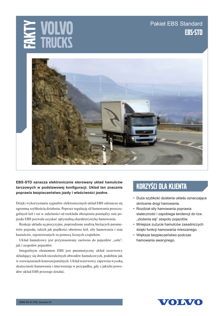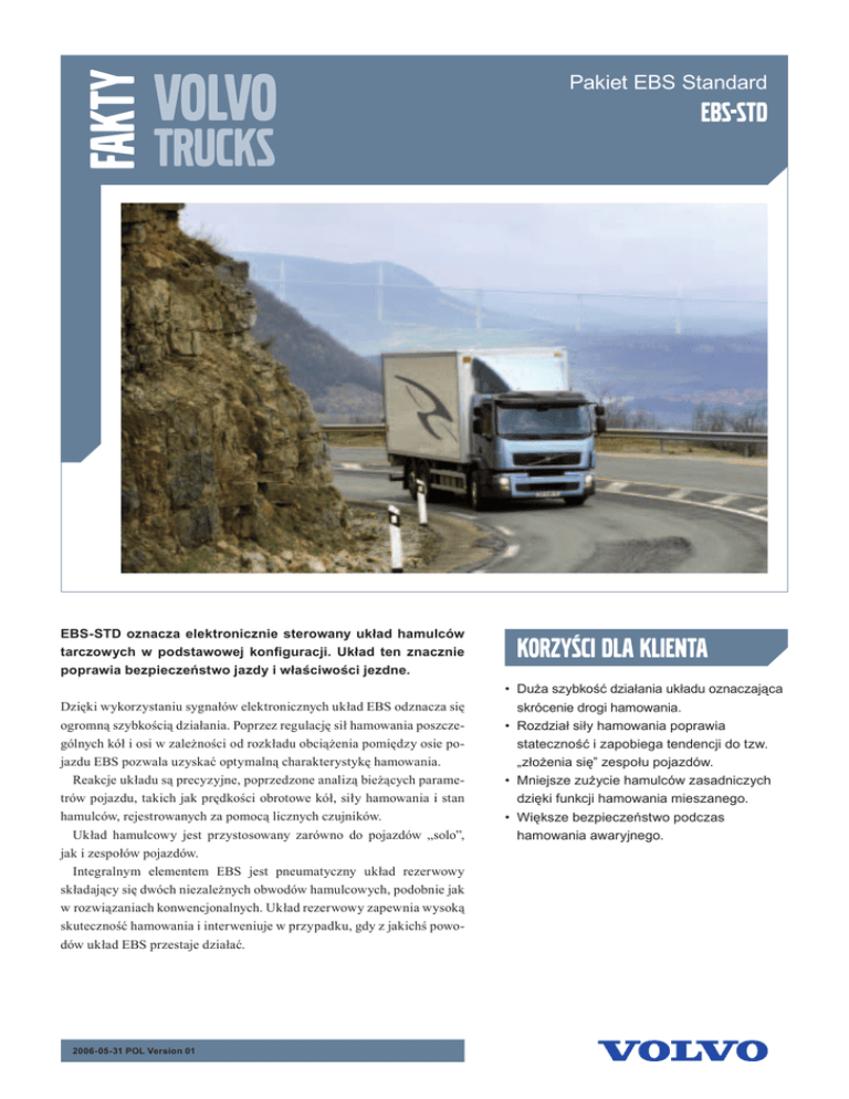 FAKTY volvo Pakiet EBS Standard EBS-STD trucks EBS-STD oznacza elektronicznie sterowany układ hamulców tarczowych w podstawowej konÞguracji. Układ ten znacznie poprawia bezpieczeństwo jazdy i właściwości jezdne. Dzięki wykorzystaniu sygnałów elektronicznych układ EBS odznacza się ogromną szybkością działania. Poprzez regulację sił hamowania poszczególnych kół i osi w zależności od rozkładu obciążenia pomiędzy osie pojazdu EBS pozwala uzyskać optymalną charakterystykę hamowania. Reakcje układu są precyzyjne, poprzedzone analizą bieżących parametrów pojazdu, takich jak prędkości obrotowe kół, siły hamowania i stan hamulców, rejestrowanych za pomocą licznych czujników. Układ hamulcowy jest przystosowany zarówno do pojazdów „solo”, jak i zespołów pojazdów. Integralnym elementem EBS jest pneumatyczny układ rezerwowy składający się dwóch niezależnych obwodów hamulcowych, podobnie jak w rozwiązaniach konwencjonalnych. Układ rezerwowy zapewnia wysoką skuteczność hamowania i interweniuje w przypadku, gdy z jakichś powodów układ EBS przestaje działać. 2006-05-31 POL Version 01 Korzyści dla klienta • Duża szybkość działania układu oznaczająca skrócenie drogi hamowania. • Rozdział siły hamowania poprawia stateczność i zapobiega tendencji do tzw. „złożenia się” zespołu pojazdów. • Mniejsze zużycie hamulców zasadniczych dzięki funkcji hamowania mieszanego. • Większe bezpieczeństwo podczas hamowania awaryjnego. EBS-STD Duża szybkość działania oznaczająca skrócenie drogi hamowania. Układ EBS jest zintegrowany z elektroniczną architekturą pojazdu Na podstawie wartości wielu różnych sygnałów elektrycznych jednostka sterująca EBS określa ciśnienie indywidualnie w każdym siłowniku hamulcowym. Sterowanie elektroniczne odbywa się błyskawicznie i zapewnia zrównoważony przebieg hamowania. W chwili naciśnięcia przez kierowcę pedału hamulca do jednostki sterującej wysyłane są sygnały określające żądaną siłę hamowania. Jednocześnie, korzystając z wielu różnych czujników, jednostka sterująca otrzymuje informacje o aktualnych prędkościach obrotowych kół, siłach hamowania i działaniu hamulców. Na podstawie tych informacji następuje indywidualne wysterowanie hamulców każdego z kół. Pakiet EBS Standard W ciągnikach siodłowych dostępne są również następujące funkcje: Rozdział siły hamowania ciągnik – naczepa (CFC – Coupling Force Control) automatycznie rozdziela siłę hamowania pomiędzy ciągnik a naczepę. Hamulec naczepy – umożliwia wykonanie testu działania po zmianie naczepy. Dotyczy tylko Volvo FE. Rozdział siły hamowania poprawia stateczność i zapobiega tendencji do tzw. „złożenia się” zespołu pojazdów. Aby uniknąć utraty stateczności i ryzyka złożenia się zespołu pojazdów następuje rozdział siły hamowania proporcjonalnie do nacisków na poszczególne osie danego pojazdu, a także proporcjonalnie do rzeczywistych mas całkowitych zespołów wchodzących w skład zestawu drogowego. Mniejsze zużycie hamulców zasadniczych dzięki funkcji hamowania mieszanego. Po włączeniu funkcji hamowania mieszanego wraz z hamulcami zasadniczymi automatycznie uruchamiane są także hamulce pomocnicze. Dzięki temu spada tempu zużycia hamulców zasadniczych. Siła hamowania jest dostosowana do masy pojazdu i siły nacisku na pedał hamulca. Większe bezpieczeństwo podczas hamowania awaryjnego. Jeżeli kierowca gwałtownie naciska pedał hamulca, układ EBS rozpoznaje tę sytuację i automatycznie zwiększa siłę hamowana w celu zapewnienia maksymalnej skuteczności i uzyskania możliwie najkrótszej drogi hamowania. Bogaty zestaw funkcji zwiększających bezpieczeństwo jazdy i wydajność. Pakiet EBS-STD zawiera następujące układy i funkcje: ABS – układ antyblokujący. Hamowanie mieszane – automatyczne załączanie hamulców pomocniczych wspomagających hamulce zasadnicze. Ostrzeżenie o słabej skuteczności hamowania – funkcja ostrzegająca kierowcę o zbyt małym opóźnieniu pojazdu w stosunku do pozycji pedału hamulca. Ostrzeżenie o przegrzaniu hamulców – funkcja monitorująca temperaturę hamulców zasadniczych. Synchronizacja blokady mechanizmu różnicowego (DLS) – synchronizacja prędkości obrotowych kół napędowych przed załączeniem blokady mechanizmu różnicowego. Rejestrator stanu EBS odczyt stanu za pośrednictwem elektronicznej architektury pojazdu TEA (Truck Electronic Architecture) i VCADS Pro (Volvo Computer Aided Diagnostics System). Zewnętrzne sterowanie hamulcami (EBD) przez inne układy pojazdu. Monitorowanie hamulców zasadniczych – ciągła kontrolna działania hamulców poszczególnych kół. Kody usterek są zapisywane w pamięci układu diagnostycznego. Kontrola momentu obrotowego zapobieganie blokowaniu kół na śliskiej nawierzchni w chwili zwolnienia pedału przyspieszenia. Hamowanie awaryjne umożliwia szybsze osiągnięcie maksymalnej siły hamowania w sytuacji niebezpiecznej. Aby uniknąć utraty stateczności i ryzyka złożenia się zespołu pojazdów następuje rozdział siły hamowania proporcjonalnie do nacisków na poszczególne osie danego pojazdu, a także proporcjonalnie do rzeczywistych mas całkowitych zespołów wchodzących w skład zestawu drogowego.